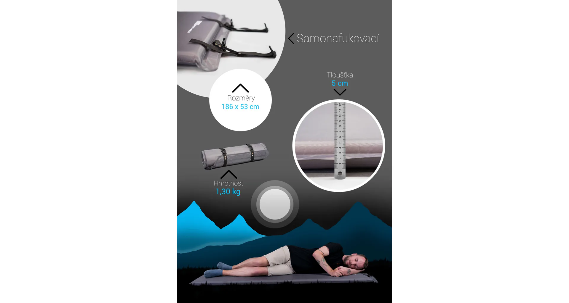 Hrúbka karimatky je 5 cm, rozmer 186 x 53 cm. Výrobok je vhodný na kempovanie a zaručuje veľmi pohodlné ležanie vďaka svojej hrúbke. Proti gumotextilným lehátkam má veľkú výhodu v skladnosti a nízkej hmotnosti. Proti klasickej karimatke má výhodu v pohodlnom ležaní a v trvanlivosti.