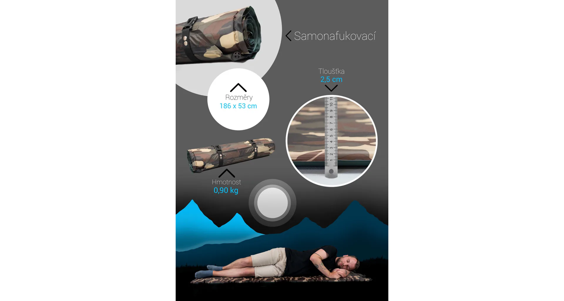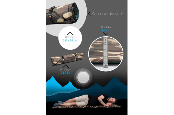 Samonafukovacia karimatka v prevedení "maskáč" je vhodná pre pešiu turistiku svojim MALÝM OBJEMOM A ZÁROVEŇ AJ NÍZKOU HMOTNOSŤOU pri zaistení pohodlného používania. Je aj praktická pre používanie pod holým nebom vďaka maskáčovému vzoru, ktorý nie je tak náchylný na ušpinenie. Jedná sa o veľmi ľahkú karimatku, ktorá zaisťuje pohodlné spanie a zaberie pomerne málo miesta. Je možné napomôcť rýchlejšiemu nafúknutiu ústami, poprípade tým možno docieliť väčšiu tuhosť karimatky. V niektorých prípadoch je nutné karimatku pri prvých dvoch použitiach ústami dofúknuť, aby sa pena vo vnútri roztiahla na patričnú hrúbku a následne sa už ľahko nafukovala sama.