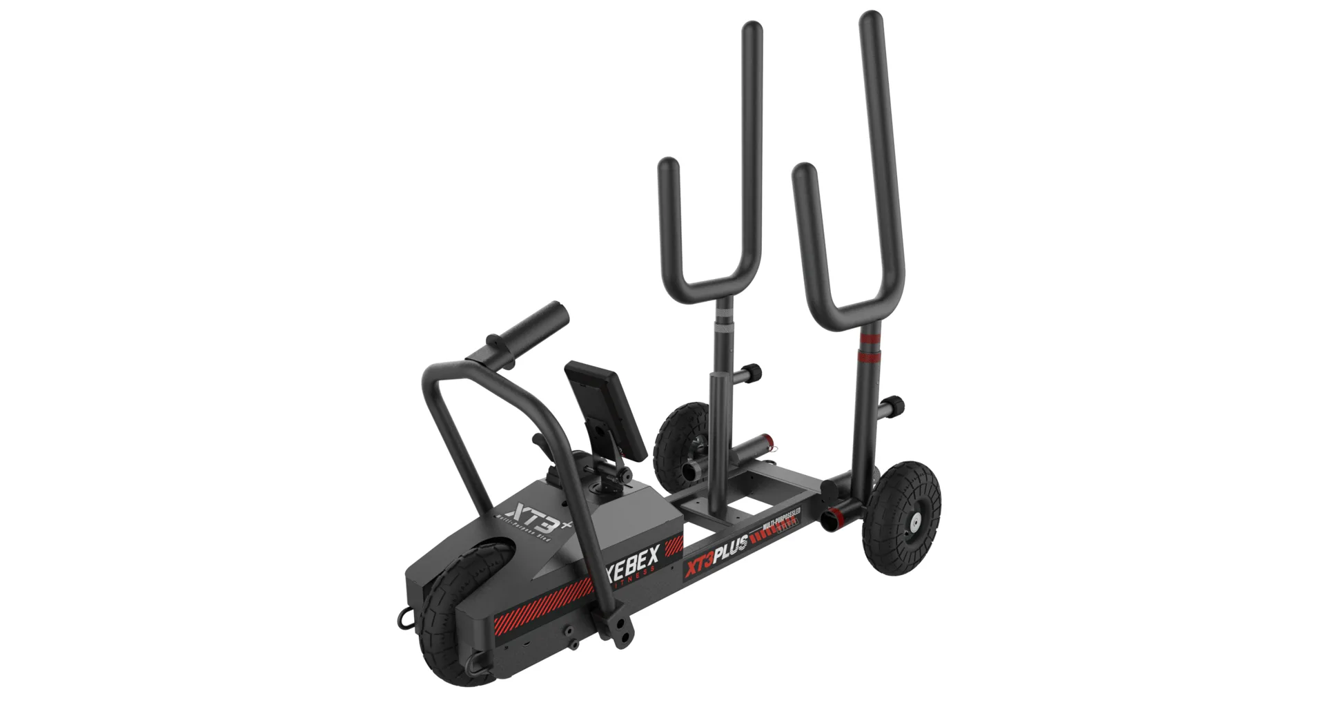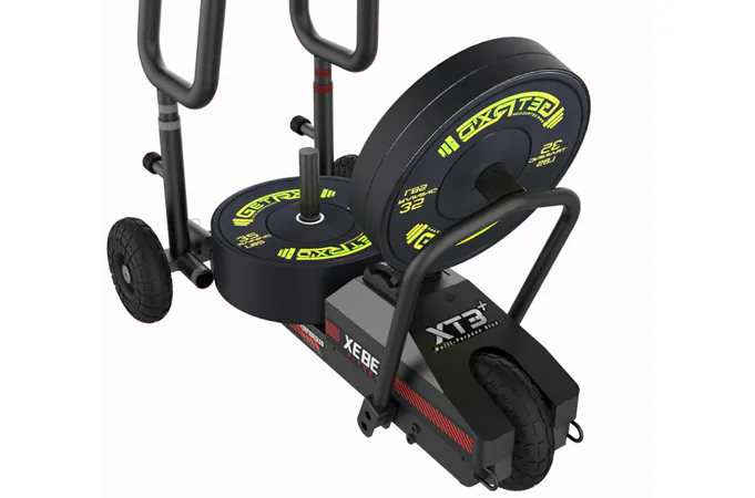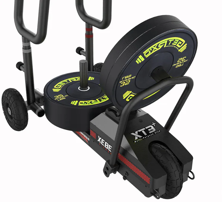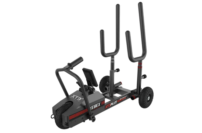 Saně XEBEX XT3 Plus Sled V2 vč. HIIT console Smart Connect jsou speciální plně profesionální tréninkové saně, které že se pohybují na třech robustních kolech a odpor je vytvářen jak standardními olym. kotouči, tak přídavným magnetickým odporem přes regulační páčku!