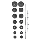 Variabilný činkový komplet HSF zostavený z kvalitných komponentov je vynikajúcim doplnkom každej domácej aj komerčnej posilňovne. Rozmanitá skladba setu zaručuje komfortný a bezpečný tréning. Súčasťou tohto setu je veľký obojručný hriadeľ na činku, dva jednoručné hriadele a sada liatinových kotúčov, všetko s priemerom 30 mm (priemer používaný u väčšiny výrobcov posilňovacích lavíc a strojov). Uvedená váha setu je vrátane osi.