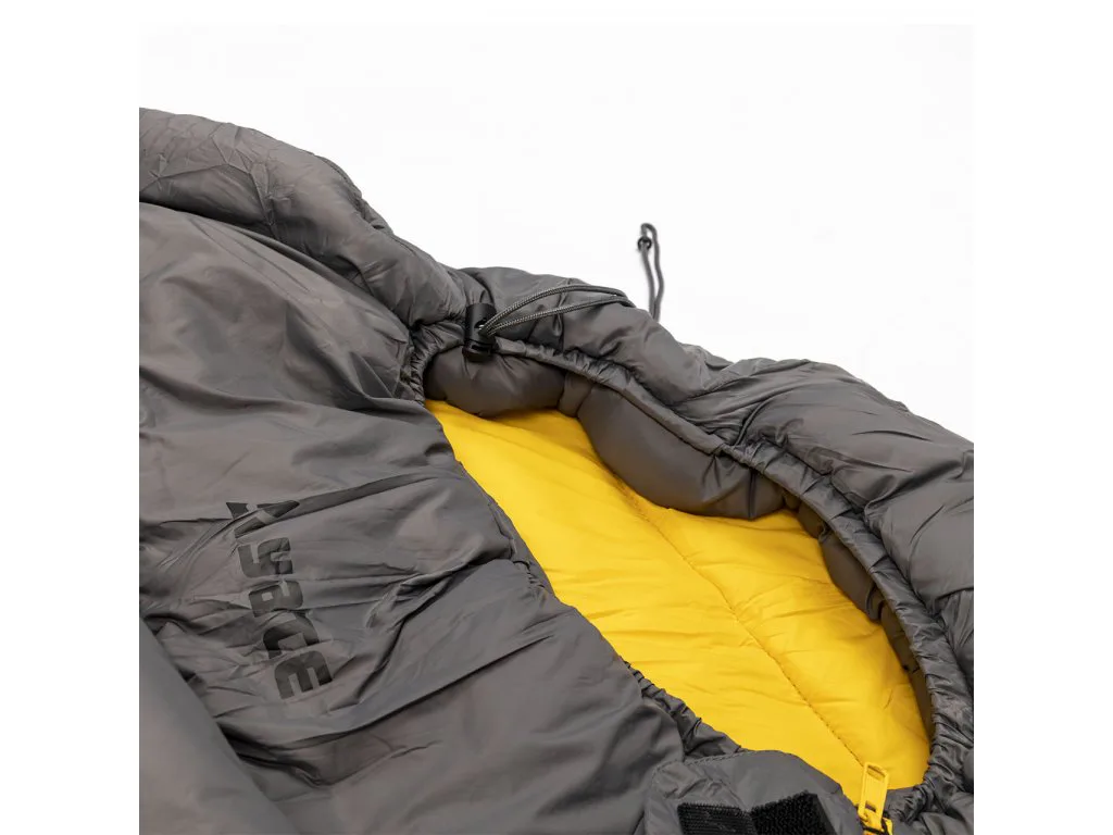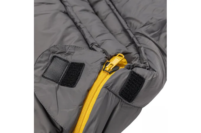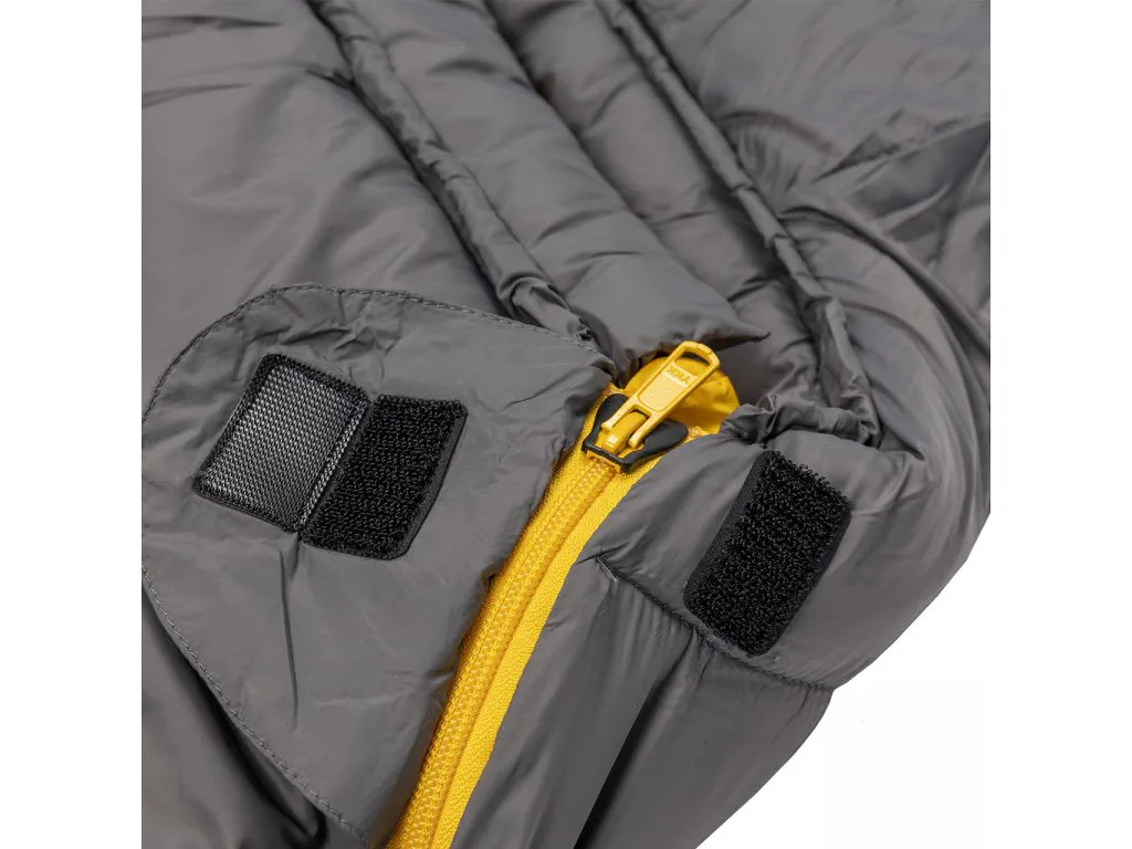 Zapínanie: Spacák je vybavený značkovým zipsom YKK so špeciálnym plastovým chráničom, ktorý zabraňuje vniknutiu látky do jazdca a samovoľnému rozopínaniu. Pri hlave je zips ešte zaistený chlopňou na suchý zips, ktorá zamedzuje samovoľnému otvoreniu zipsu.