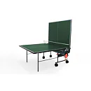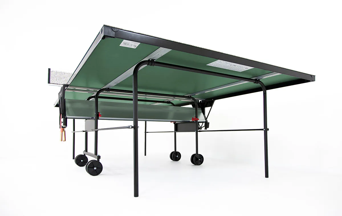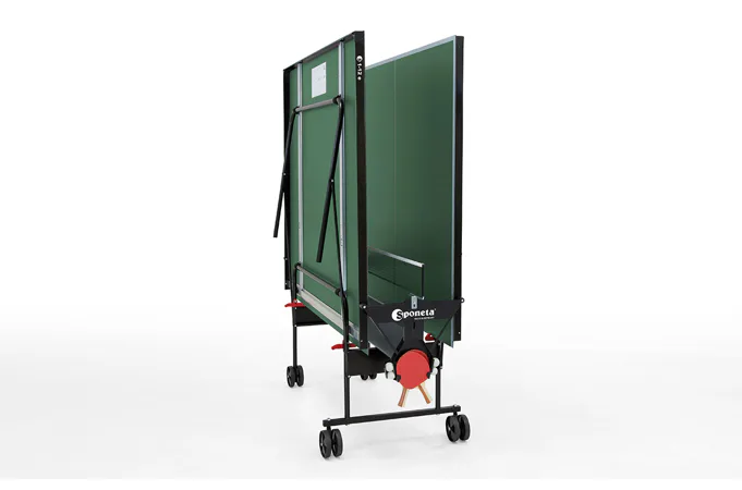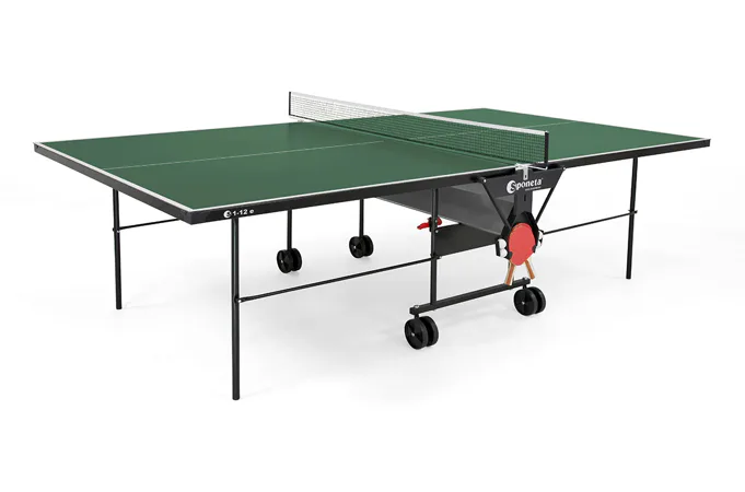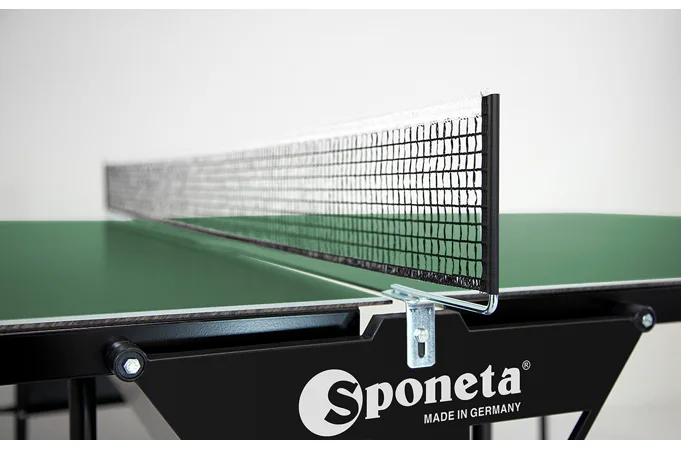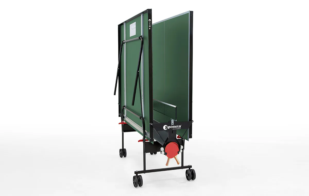 Stôl na stolný tenis Sponeta S1-12e - vonkajší. Pozinkovaný rám spolu so 4 mm hrubou plastovou doskou (melamín), ktorá má vlastnosti klasickej drevenej dosky, umožňujú trvalé umiestnenie stola v exteriéri (odporúčame však ponechať stôl vonku len od jari do jesene, aby sa predĺžila jeho životnosť - sneh a ľad môžu stôl mechanicky poškodiť), bez ohľadu na aktuálne poveternostné podmienky. Stôl je tak kvalitný, že naň poskytujeme predĺženú záruku 3 roky. Držiak siete je trvalo namontovaný na stole. Stôl sa dá zložiť bez toho, aby ste museli odstrániť držiak siete. Kolieska umožňujú ľahkú manipuláciu so stolom. Rozmery stola v rozloženom stave sú 274 x 152,5 x 76 cm, celková výška v zloženom stave na manipuláciu je 153 cm šírka (184 cm vrátane zachovaných držiakov na sieť) x 65 cm x 189 cm vrátane výšky koliesok. Stôl obsahuje držiak na sieť, sieť, 2 držiaky na pálky a držiak na loptičky. Hmotnosť stola je 49 kg, s obalom 52 kg. Dostupné v zelenej farbe. Rozmery kartónu 157x140x10 cm