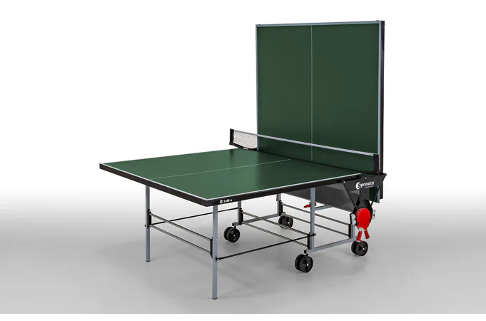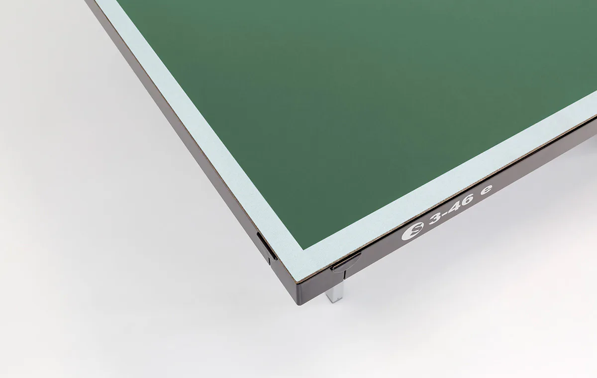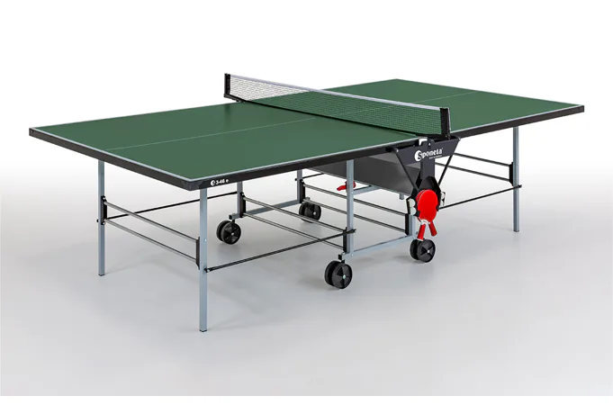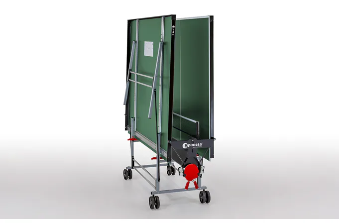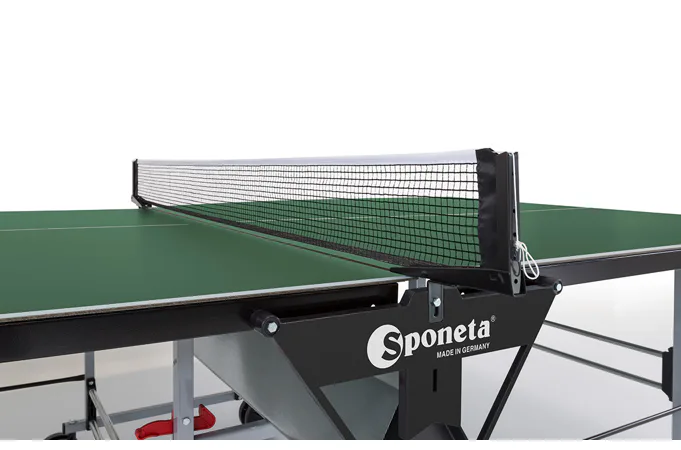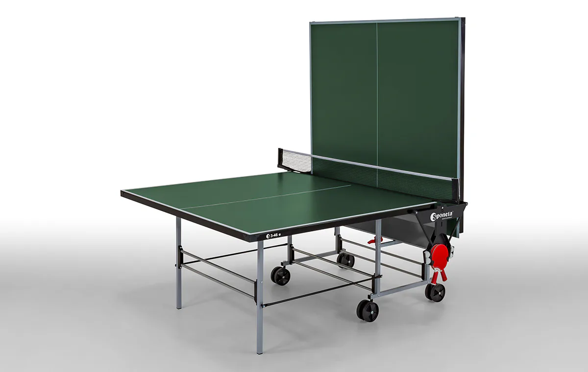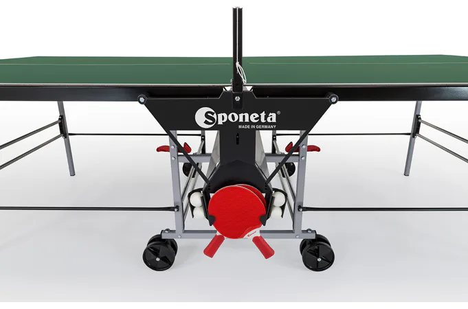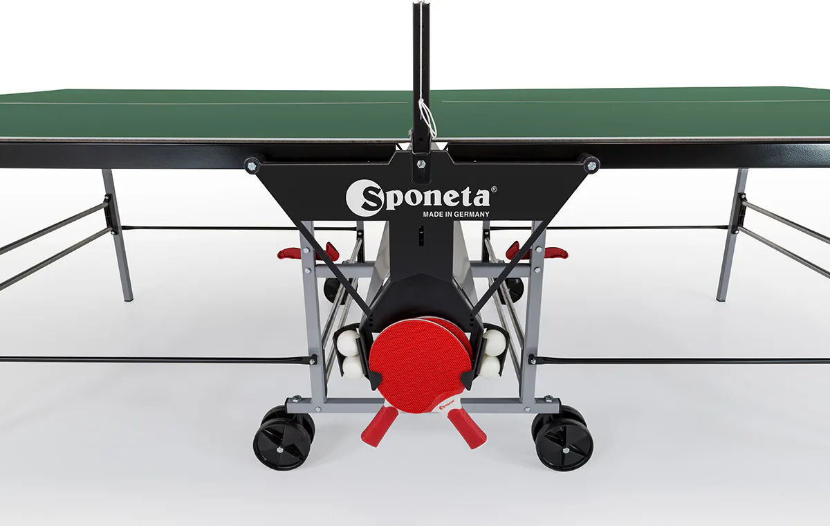 Stůl na stolní tenis SPONETA S3-46e pro venkovní - exteriérové použití (odolný proti povětrnostním vlivům a UV záření). - barva stolu zelená - stůl pro venkovní použití - rozměr stolu 2740 x 1525 x 760 mm - hrací deska 5 mm melamin - okrajový lub 36 mm - tyče nohou 25 x 25 mm - možnost pohybu stolu na 4 kolečkách o průměru 125 mm - složení umožňuje hru jednoho hráče - vyroben podle normy EN 14468-1 třída C - rozměr pro uskladnění 184 x 65 x 189 cm - stůl je vybaven držákem síťky a síťkou - držák pálek a míčků - hmotnost 62 kg - vyrobeno v Německu