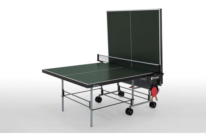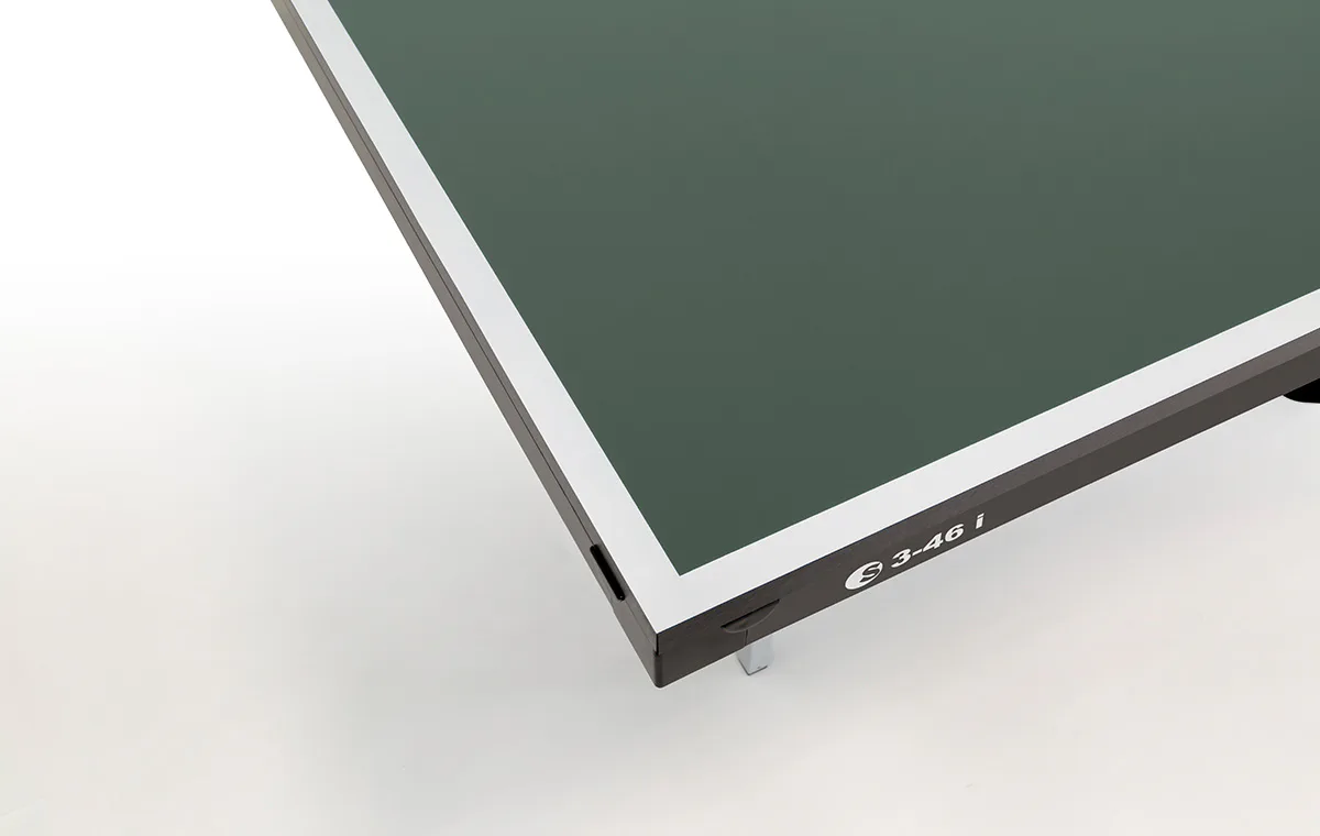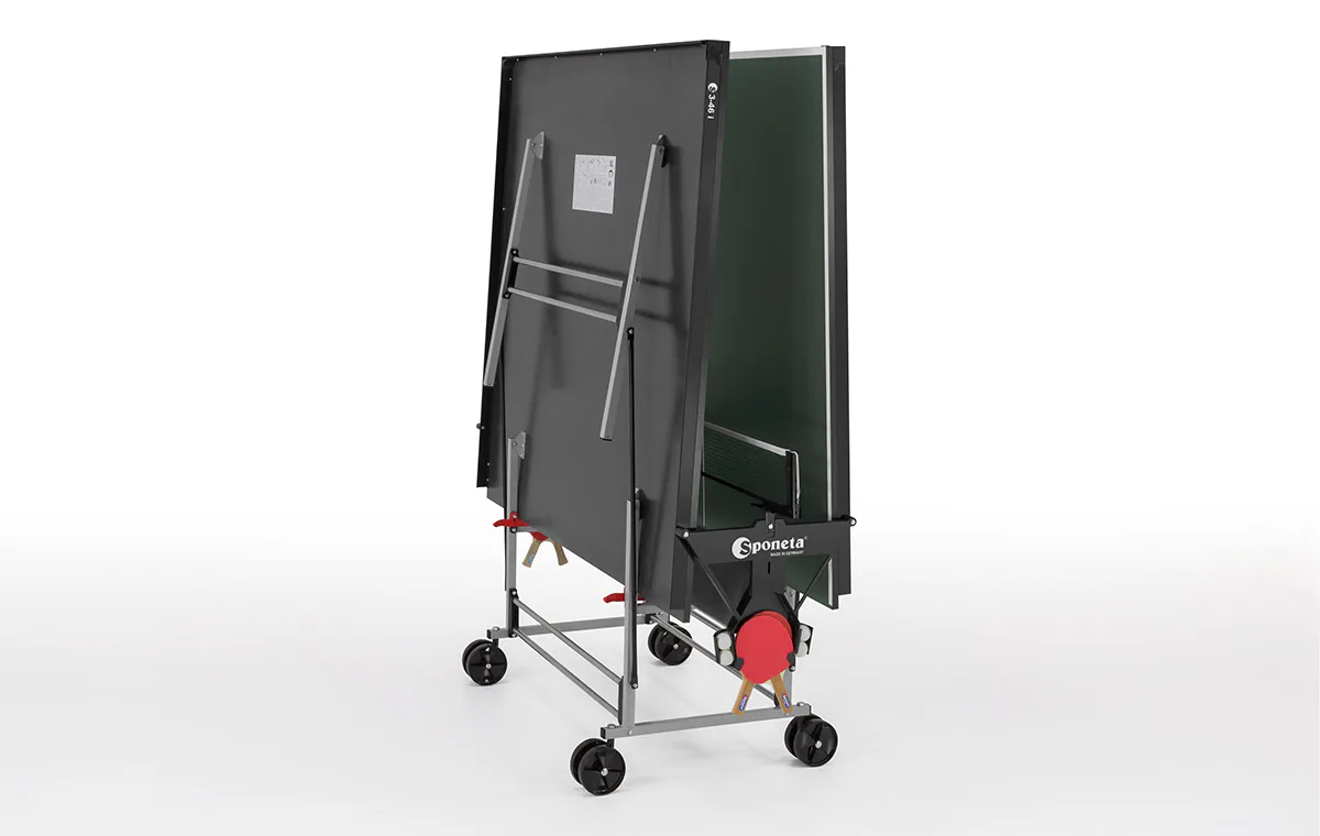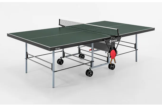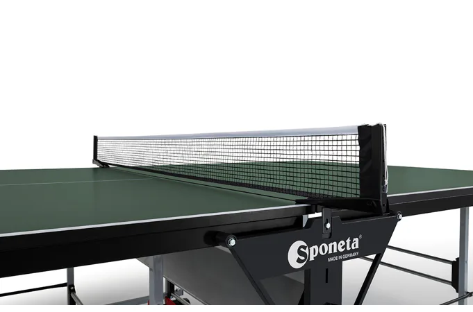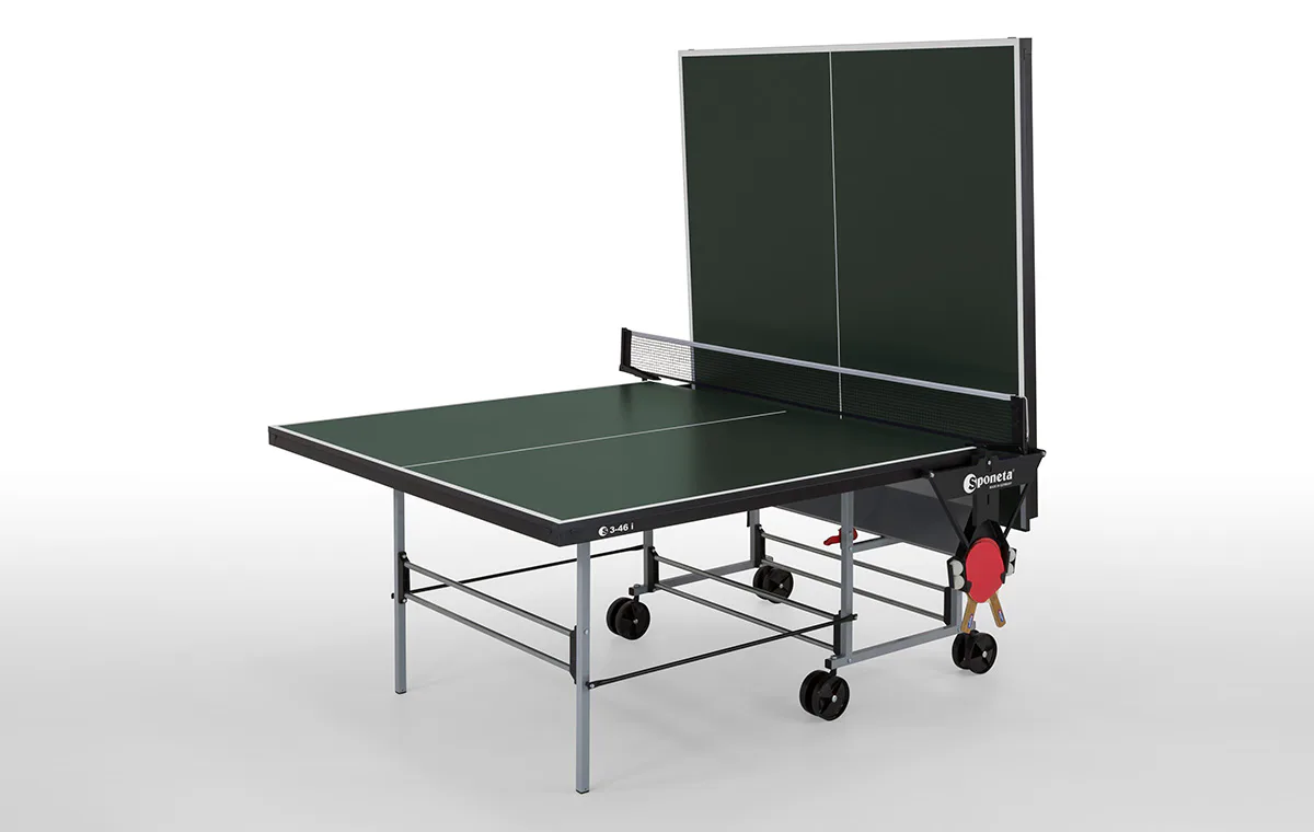 Stůl na stolní tenis SPONETA S3-46i pro vnitřní - interiérové použití (není odolný proti povětrnostním vlivům a UV záření). - barva stolu zelená - stůl pro vnitřní použití - rozměr stolu 2740 x 1525 x 760 mm - dřevěná hrací deska 19 mm - okrajový lub 36 mm - tyče nohou 25 x 25 mm - možnost pohybu stolu na 4 kolečkách o průměru 125 mm - složení umožňuje hru jednoho hráče - vyroben podle normy EN 14468-1 třída C - rozměr pro uskladnění 184 x 65 x 189 cm - stůl je vybaven držákem síťky a síťkou - držák pálek a míčků - hmotnost 75 kg - vyrobeno v Německu