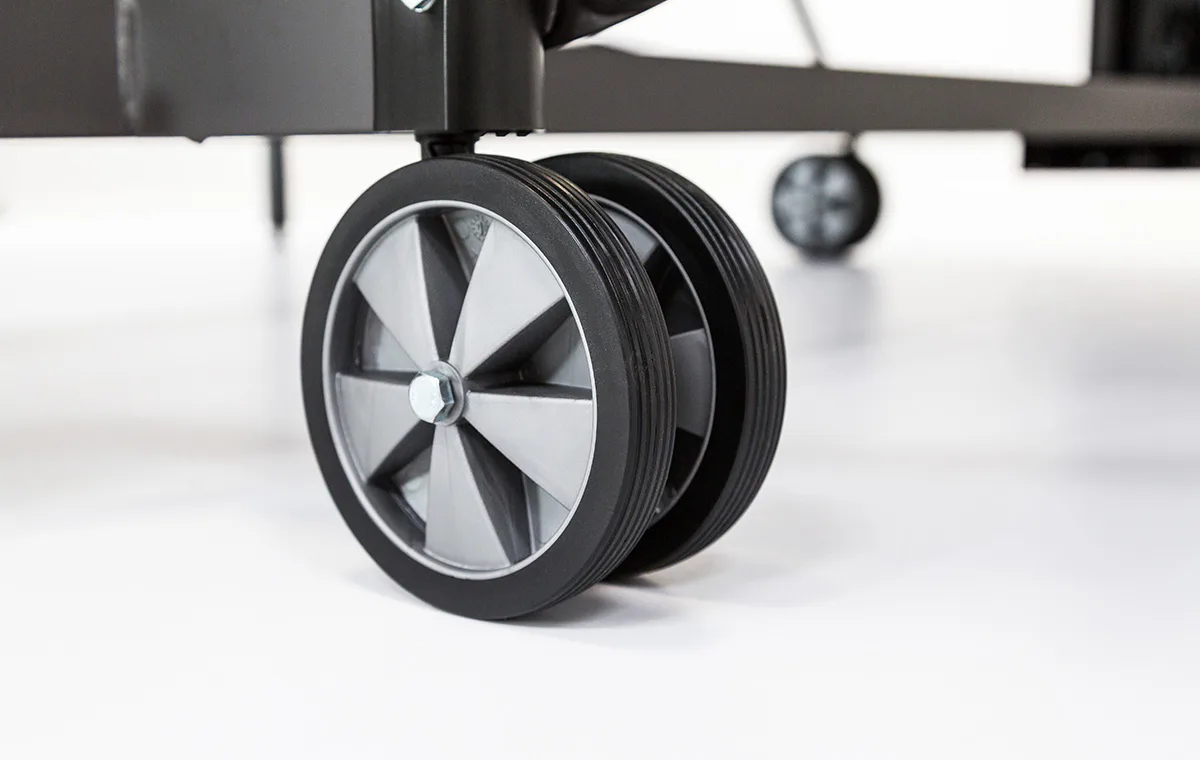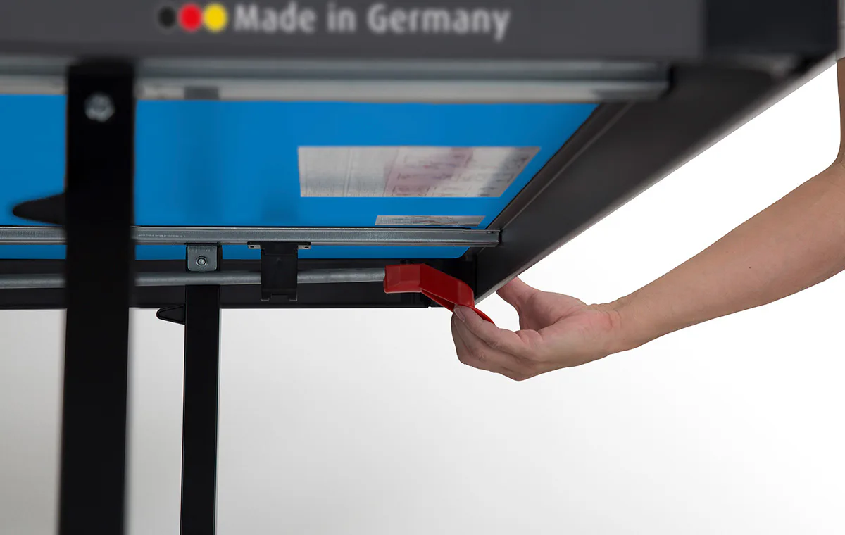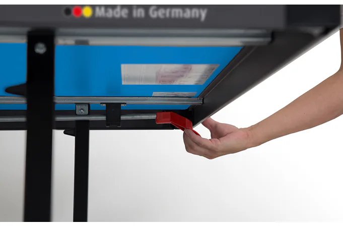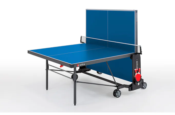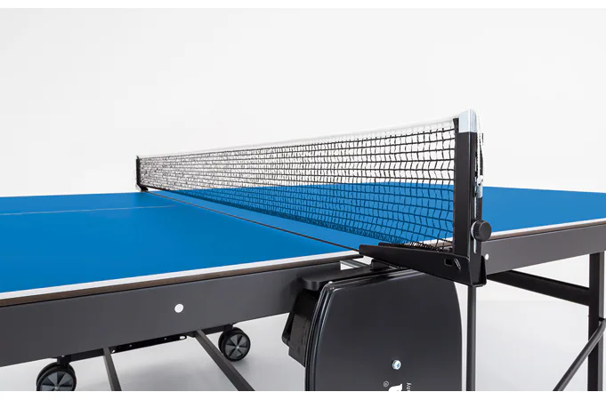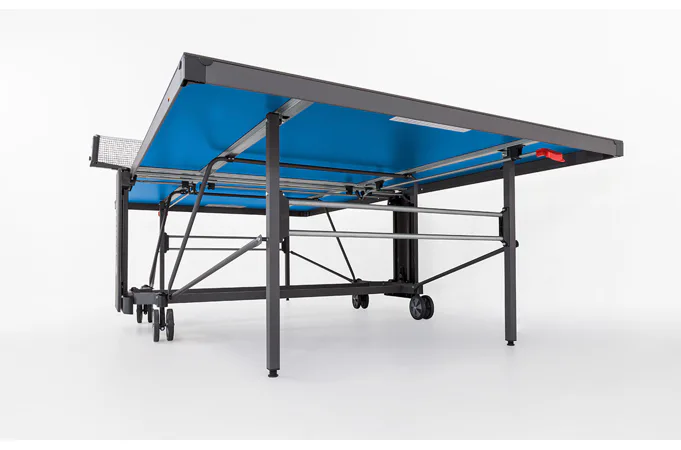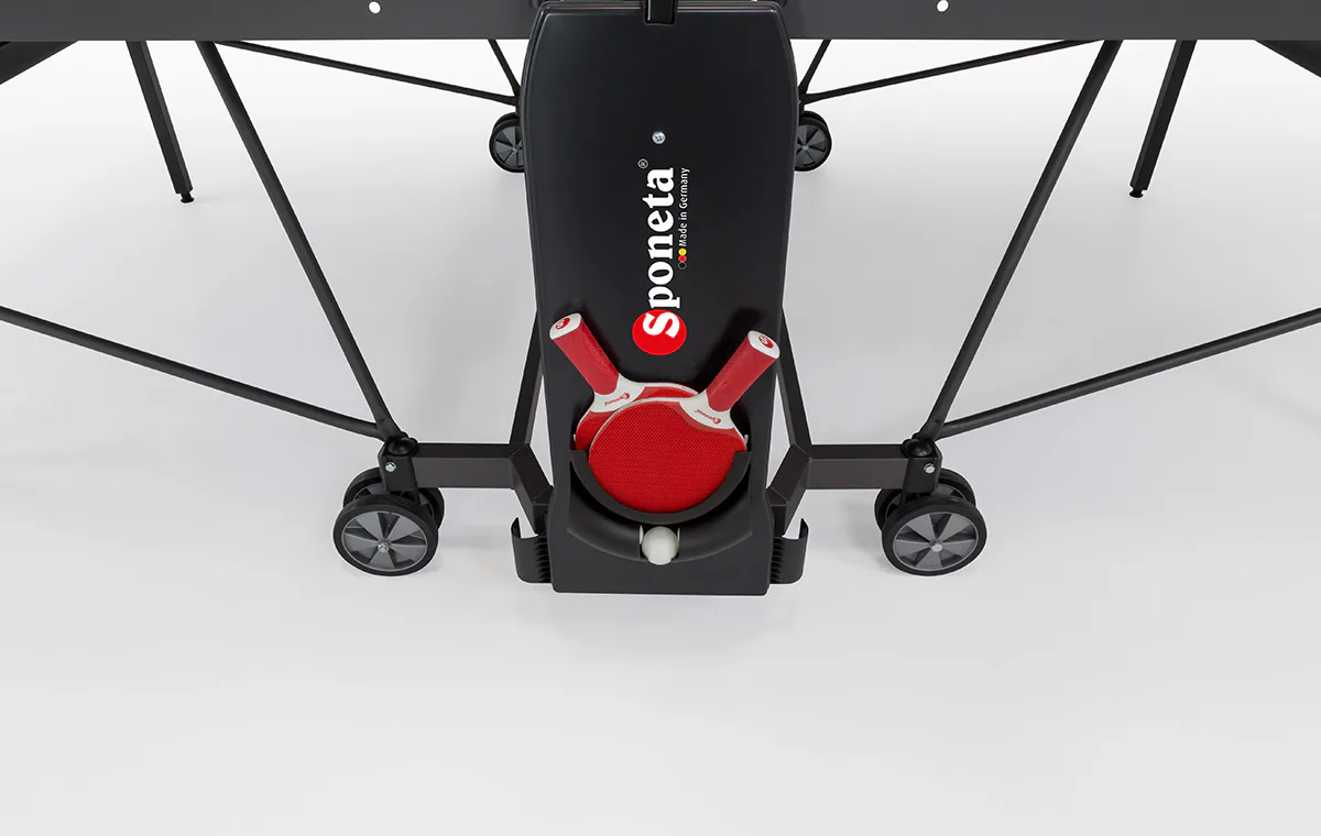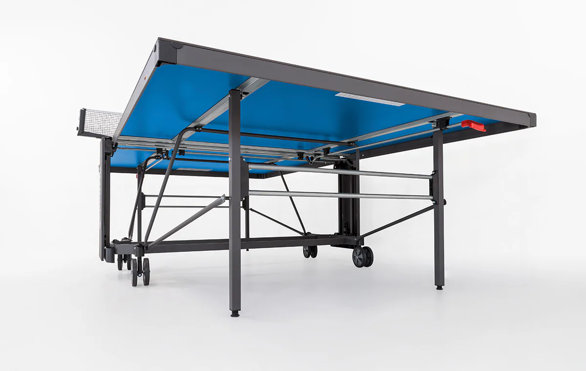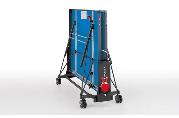 Stôl na stolný tenis SPONETA S4-72e je možné zložiť bez toho, aby bolo nutné demontovať držiak na sieťku so sieťkou. Výhodou tohto modelu je možnosť sklápania dosiek len z jednej strany a nie je potreba stôl obchádzať alebo mať k sebe ešte ďalšiu pomoc. Pevný rám z profilov 3 x 3 cm dáva stolu veľkú stabilitu rovnajúcu sa vnútorným stolom. 4 pogumované kolieska s priemerom 128 mm umožňujú tichý pojazd a uľahčujú manipuláciu so stolom.