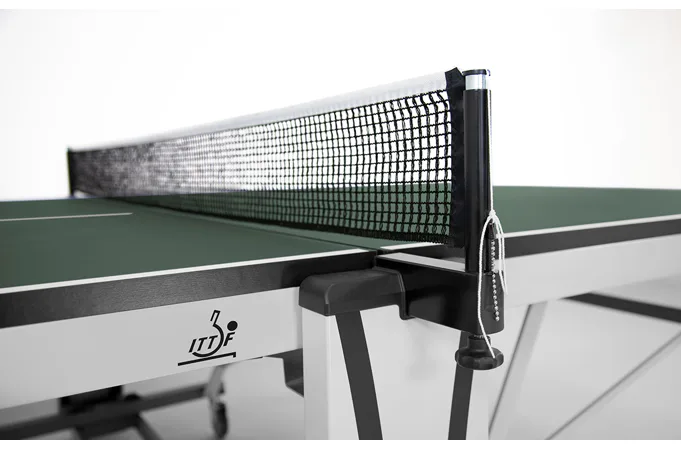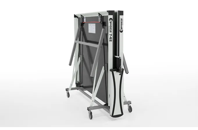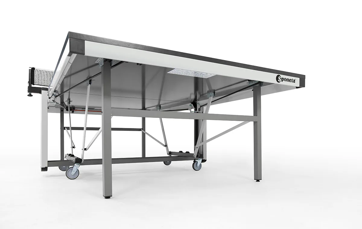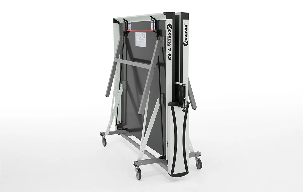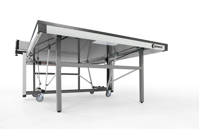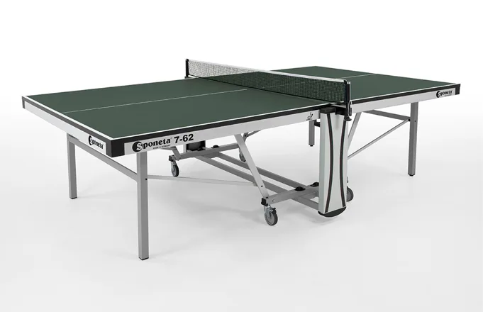 Závodní stůl na stolní tenis SPONETA S7-62 pro vnitřní - interiérové použití (není odolný proti povětrnostním vlivům a UV záření). - barva stolu zelená - stůl pro vnitřní použití - rozměr stolu 2740 x 1525 x 760 mm - dřevěná hrací deska 25 mm - okrajový lub 60 mm - tyče nohou 40 x 40 mm - skládací systém se zajištěním - možnost pohybu stolu na 4 gumových kolečkách o průměru 100 mm - dvě kolečka s brzdou - složení umožňuje hru jednoho hráče - vyroben podle normy EN 14468-1 třída A - rozměr pro uskladnění 153 x 70 x 155 cm - stůl je vybaven držákem síťky a síťkou - hmotnost 113 kg - vyrobeno v Německu