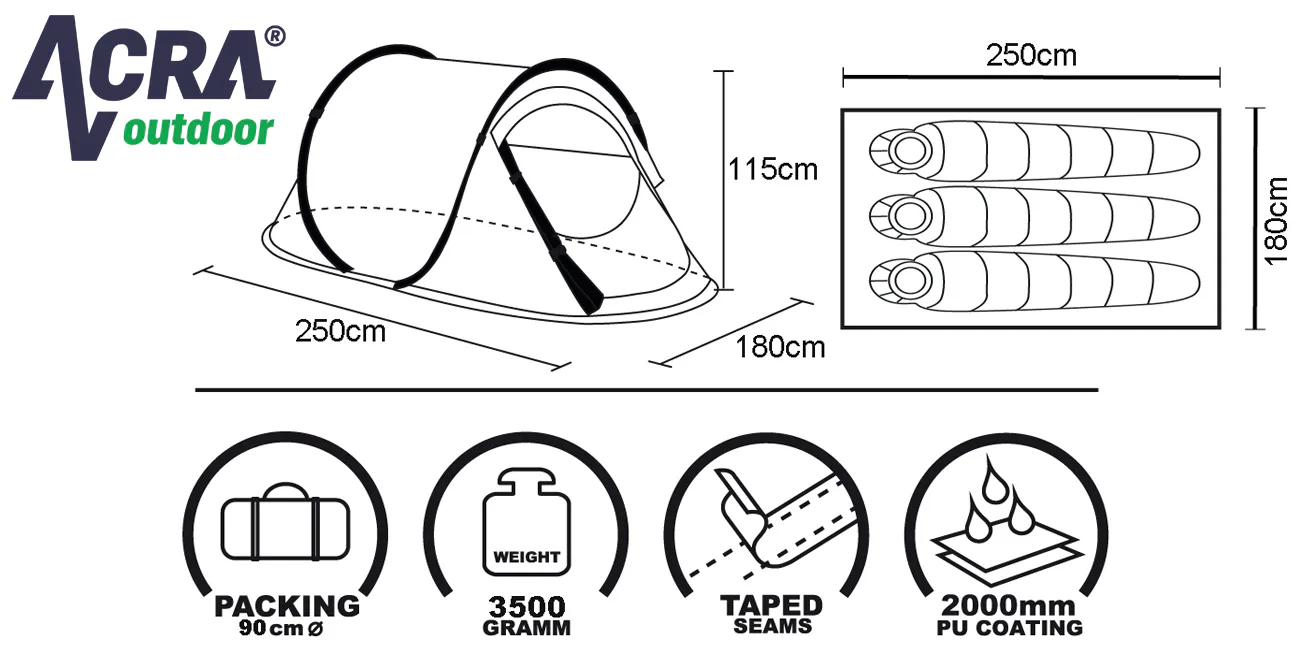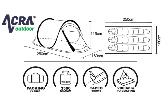 Samostaviaci stan pre 3 osoby. Jedná sa o veľmi skladný a jednoducho postaviteľný stan. Navlieknuté sklolaminátové prúty po vybratí z obalu stan kompletne postavia. Potom už len stačí stan upevniť kolíkami k zemi a dopnúť plášť stanu kotviacimi šnúrami dookola. Demontáž je dobré vykonávať podľa návodu, aby nedošlo k polámaniu sklolaminátových prietov.