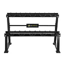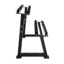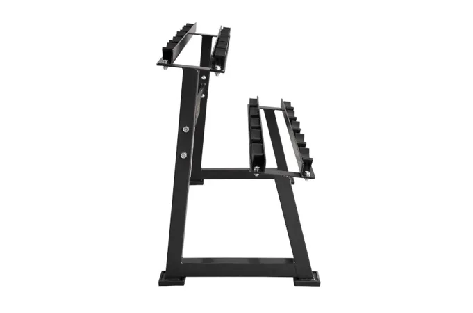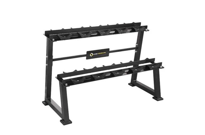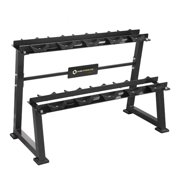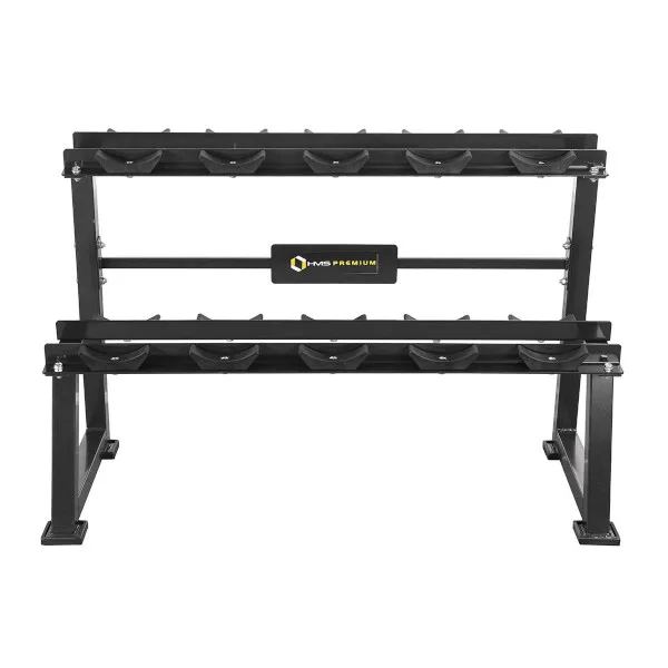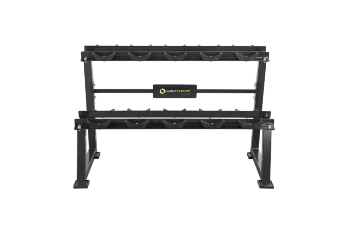 Stojan na jednoručné činky HMS Premium STR21 je ideálnym pomocníkom na uloženie 5-tich párov činiek. Kvalitná oceľová konštrukcia je vyrobená z profilu 50 x 50 mm, vďaka tomu unesie zaťaženie až 500 kilogramov. Stojan má dve "koľajnice" o rozmere 122 x 22 cm, ktoré sú umiestnené nad sebou pre ľahkú orientáciu medzi odkladaným náradím. Ku každej polici sú pripevnené profilované gumové podložky, do ktorých sa ukladajú jednotlivé činky. Guma zamedzuje pohybu činky a zároveň ju chráni pred poškodením. Štyri nohy stojana sú opatrené gumovými pätkami, ktoré chránia podlahu pred jej poškodením.
