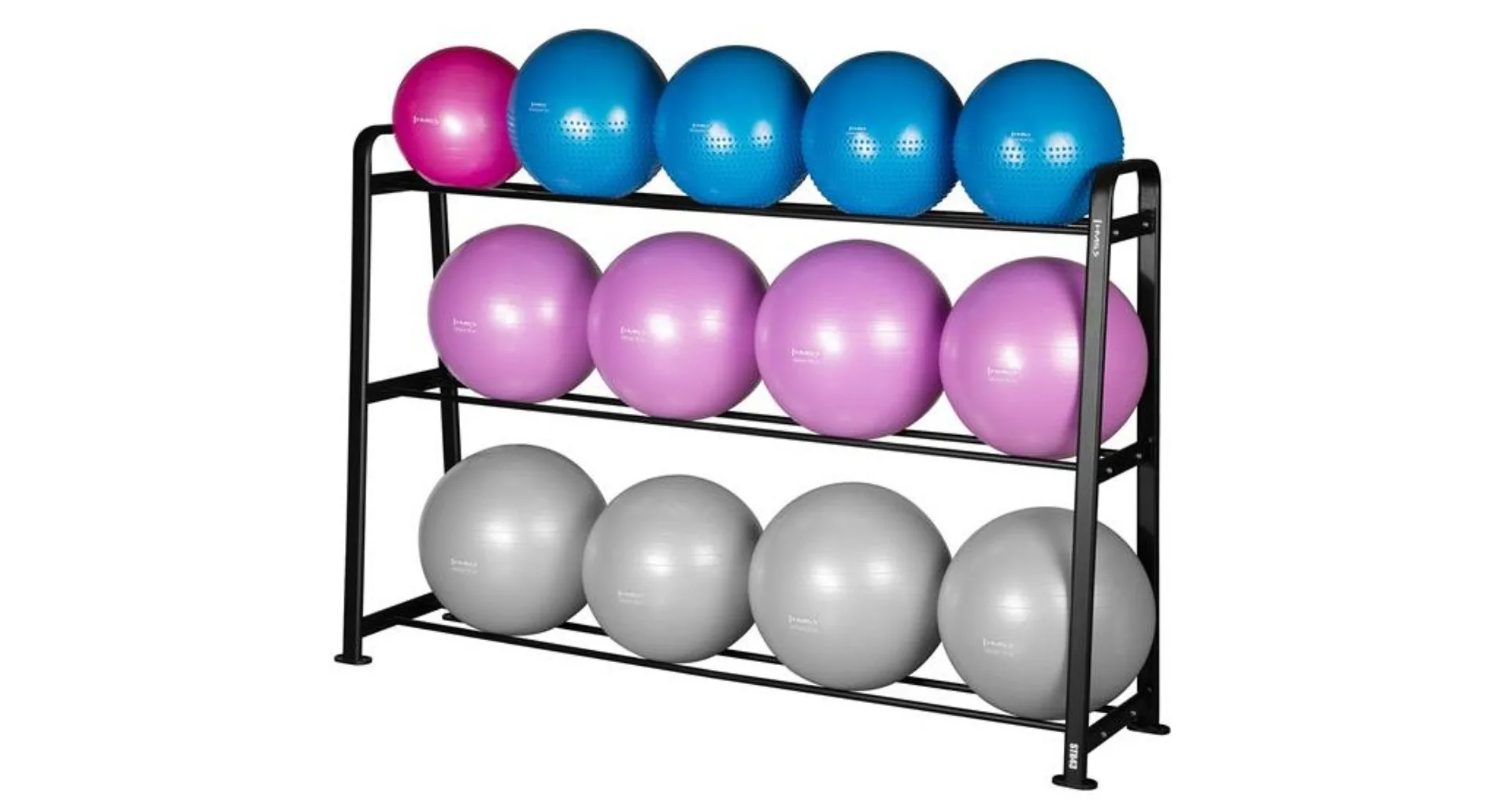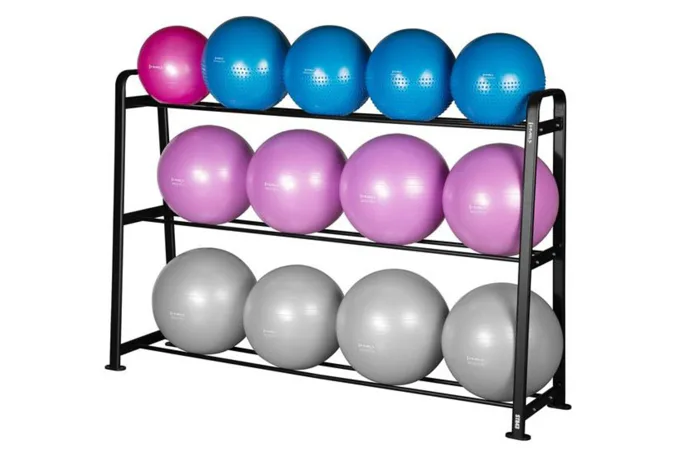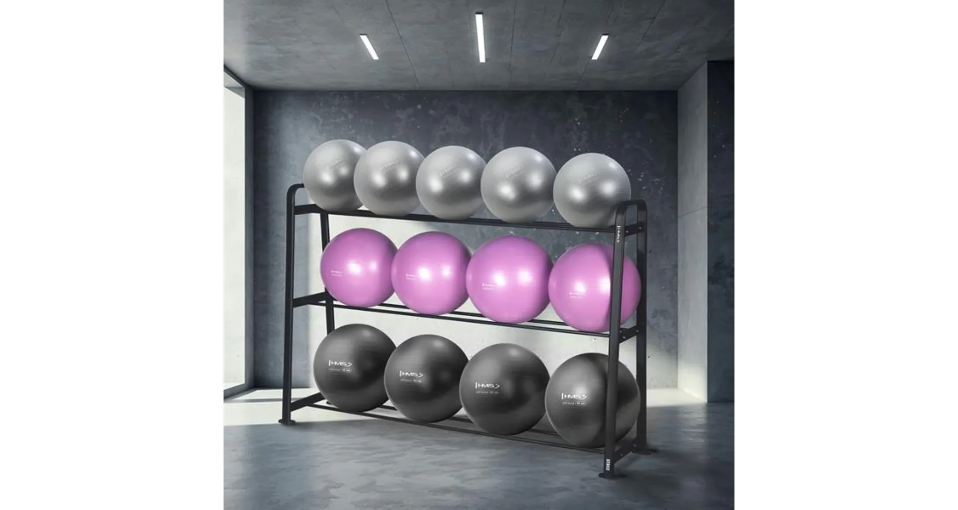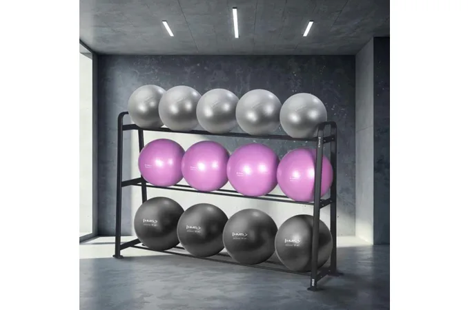 Stojan na gymnastické lopty HMS STR43 umožňuje prehľadné a pohodlné uloženie až 13 lôpt rôznych veľkostí. Vďaka trom úrovniam a dĺžke 275 cm ponúka značný úložný priestor. Stojan bol navrhnutý tak, aby umožňoval uloženie a triedenie gymnastických lôpt podľa veľkosti. Najväčšie lopty umiestnite na spodnú policu a najmenšie lopty na hornú policu.