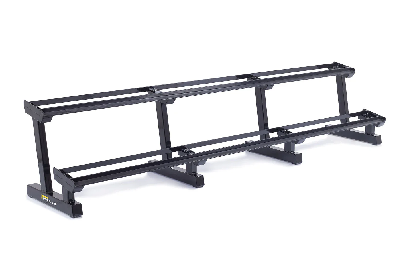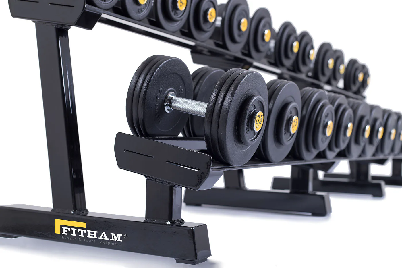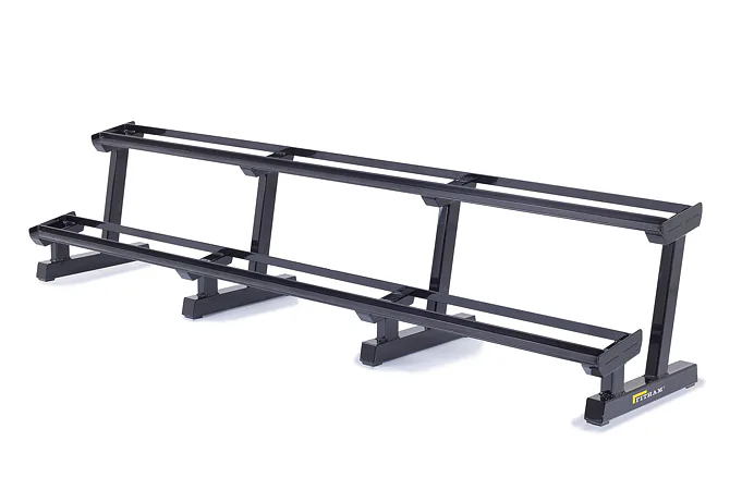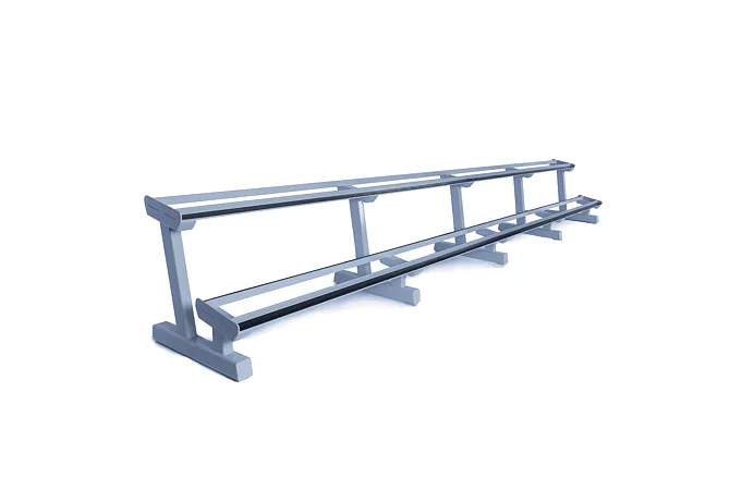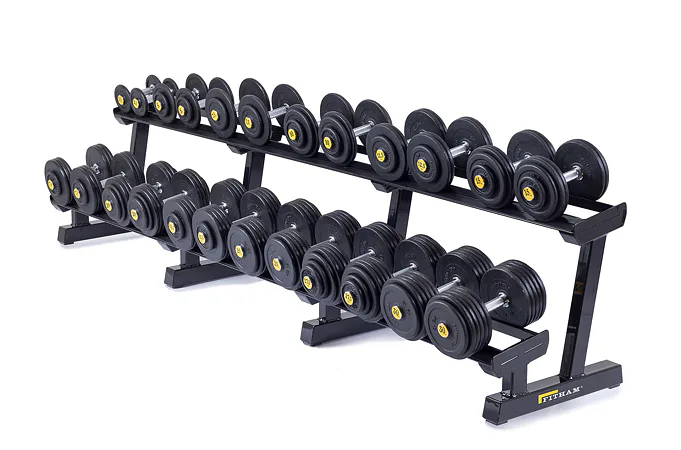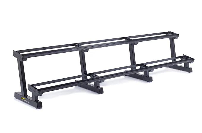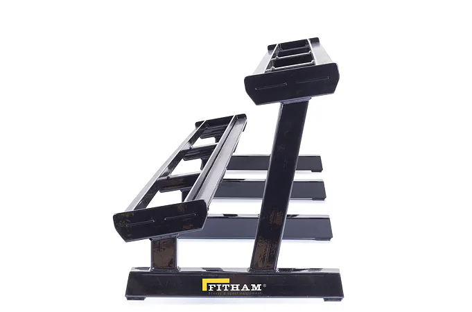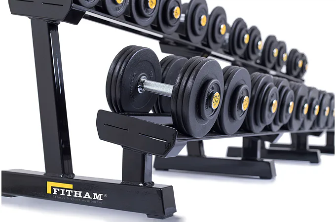 Profesionálny dvojradový stojan na jednoručky FITHAM 4 m je určený pre kluby a komerčné fitness centrá. Slúži na odkladanie jednoručných činiek. Stojan je vyrábaný na zákazku v požadovanej rozteči a farebnom prevedení.