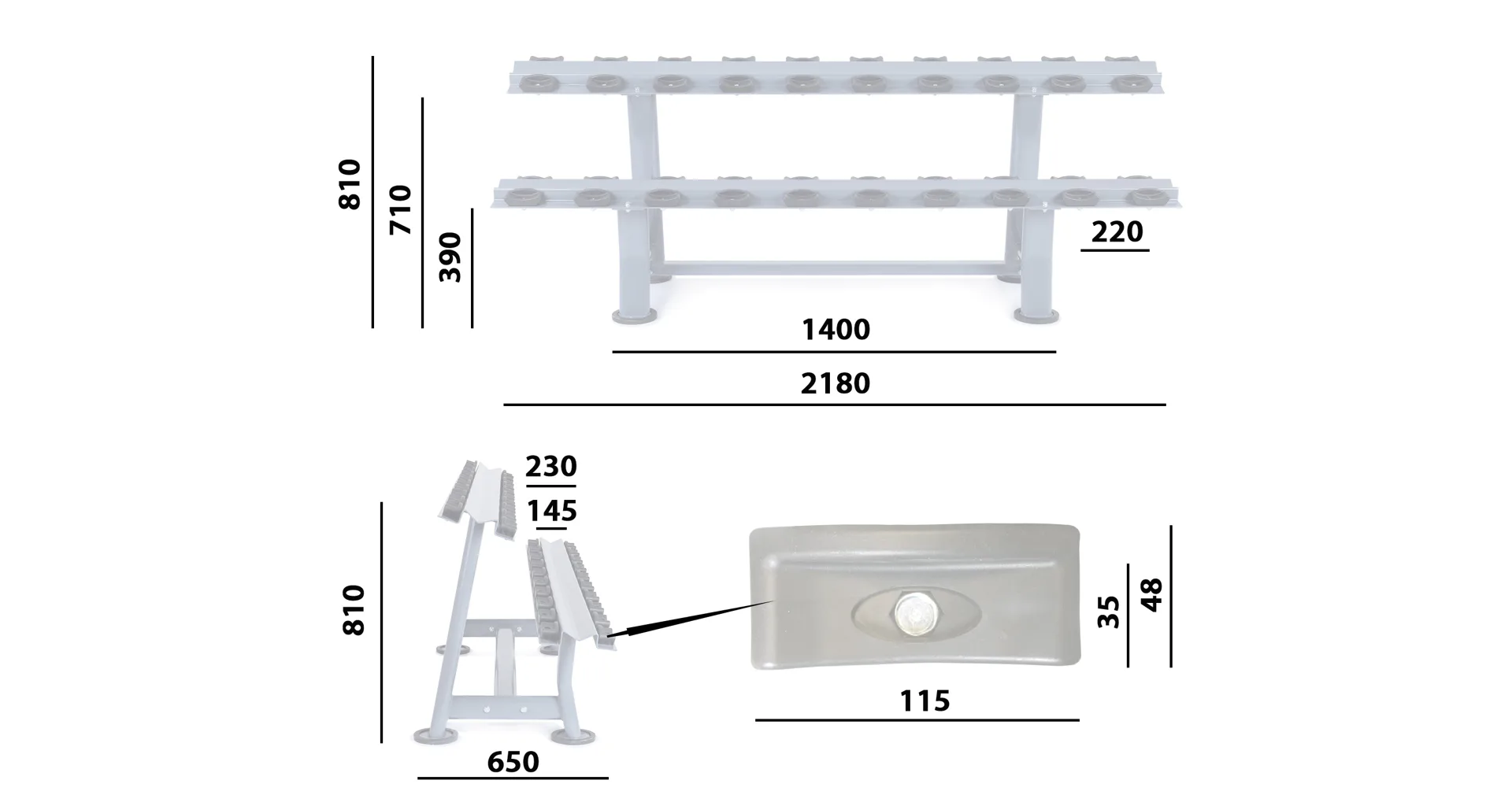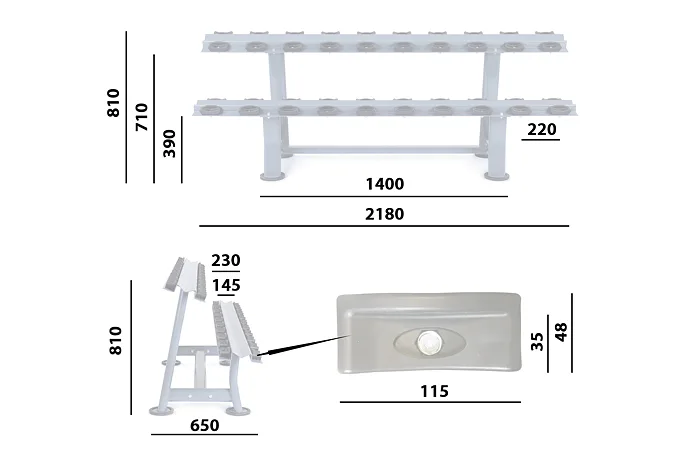 Odkladací stojan na jednoručky TRINFIT Rack Comfort zaberie vo vašej posilňovni priestor s rozmerom 218 x 65 x 81 cm (d x š x v). Nohy stojana sú opatrené gumovými podložkami, ktoré šetria vašu podlahovú krytinu.