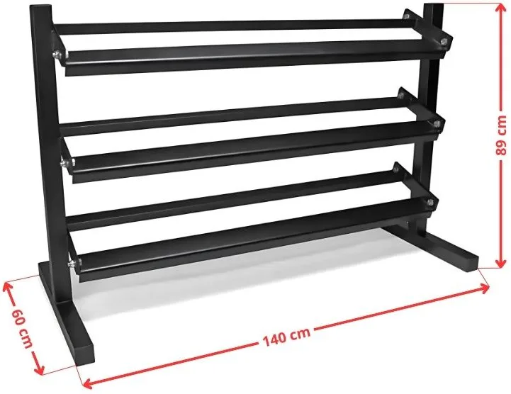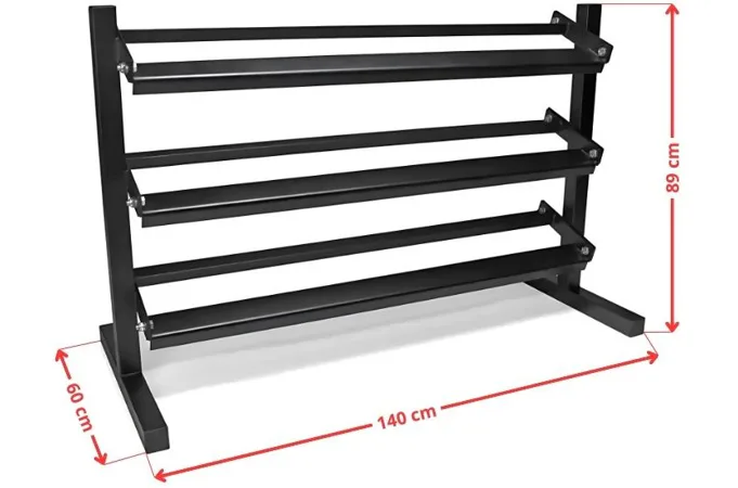Na stojan VIRTUFIT Dumbbell Rack Pro Triple môžete umiestniť ako hexa, tak klasické okrúhle činky. Nosnosť je 300 kg, čo je dostatočné na uloženie aj väčšieho množstva činiek. Tento stojan na činky je vysoko kvalitný a poskytuje organizovaný a elegantný vzhľad. Stojan má rozmery 140 x 60 x 89 cm a má oceľovú konštrukciu, ktorá zaisťuje jeho vysokú stabilitu.