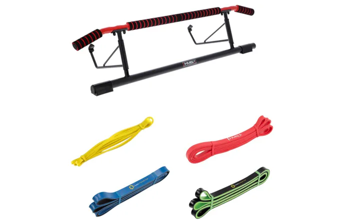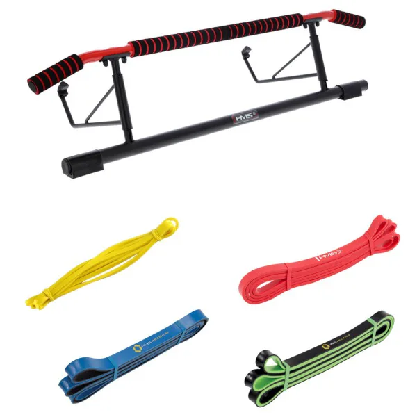 Predstavujeme sadu kombinujúcu hrazdu do zárubní HMS DD11 v komplete s odporovými gumami. Takáto kombinácia poskytuje mnoho možností cvičenia. Gumy je možné použiť na základný tréning, rozcvičenie, rehabilitáciu a tiež ako pomôcku na odľahčenie záťaže pri niektorých cvikoch. Jedným z týchto cvikov je príťah na hrazde. Atraktívna možnosť pre tých, ktorí začínajú s tréningom. U pokročilých jedincov sa manéver s gumovým expandérom osvedčí v záverečnej sérii, kedy už potrebujete znížiť záťaž. Gumová páska natiahnutá cez kolená alebo chodidlá čiastočne odľahčí svalom a umožní vám sústrediť sa na správnu techniku. Aj začiatočníci, ktorí sa doposiaľ nedokázali pritiahnuť k hrazde, to teraz zvládnu na jedničku.