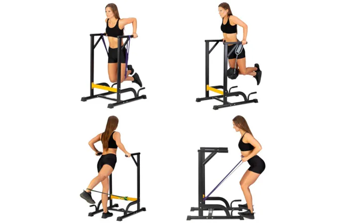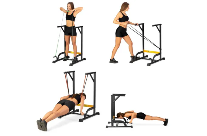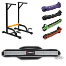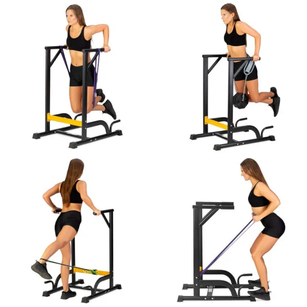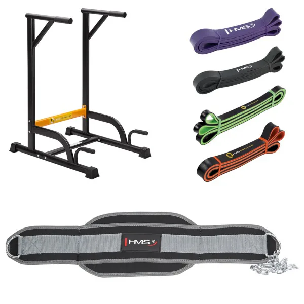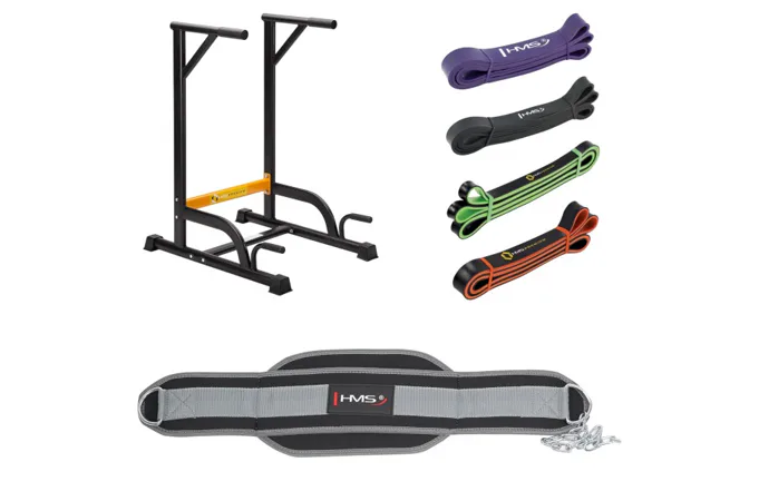 Predstavujeme sadu, ktorá kombinuje multifunkčné podpery HMS PWL8306 so záťažovým pásom HMS PST04 a kompletom odporových gúm. Táto kombinácia poskytuje širokú škálu možností cvičenia. Hlavným účelom podpier je vykonávanie tzv. dipov. Pre začiatočníkov môže byť toto cvičenie ťažké alebo dokonca nemožné. Ostatné prvky zostavy vám umožnia užiť si toto cvičenie na akejkoľvek úrovni pokročilosti. Keď je tréning s vlastnou váhou tela stále ešte výzvou, nastupujú odporové gumy. Zavesením gumy za rukoväte fungujú ako dopomoc pri dipoch aj klasickom kľuku. Týmto spôsobom budeme rozvíjať techniku a vďaka rôznemu rozsahu zaťaženia gumy budeme posilňovať vlastným tempom.