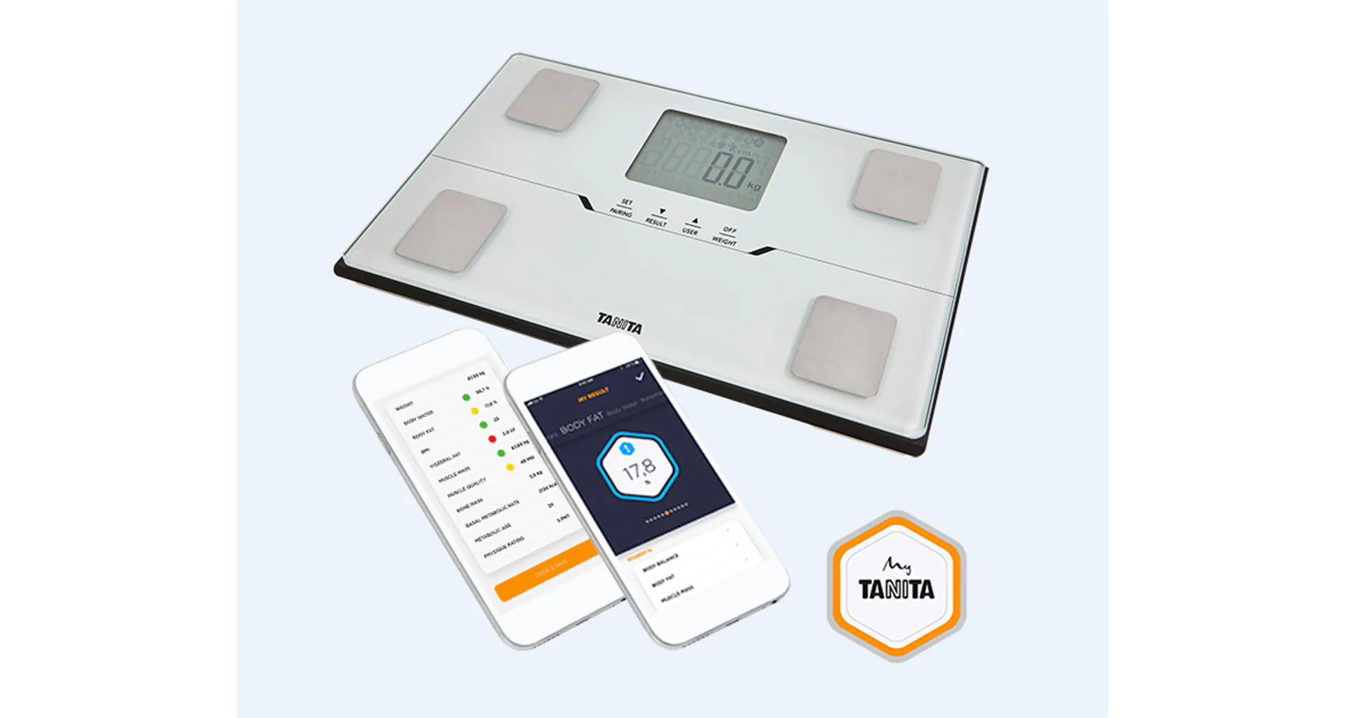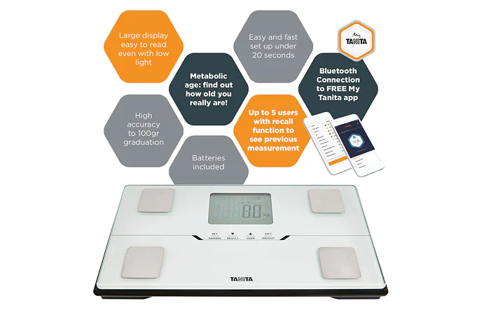 Telesný analyzátor TANITA BC-401 biela s kompaktnými rozmermi 218 x 316 x 30 mm meria celkom 10 dôležitých hodnôt : telesná hmotnosť, fyzická koncdícia, viscereálny tuk, = telesných tekutín, metabolický vek, BMI, BMR, hmotnosť kostí, podiel svalovej hmoty, podiel telesného tuku. Platforma so štvorelektródovým systémom dokáže automaticky rozpoznať zadaného užívateľa (max. 5 osoby), podľa najbližšej zistenej telesnej váhy. Analyzátor BC-401 je možné nastaviť a používať pri ručnom zadaní, ideálne sa však ovláda pomocou mobilného telefónu s nainštalovanou aplikáciou My Tanita app .