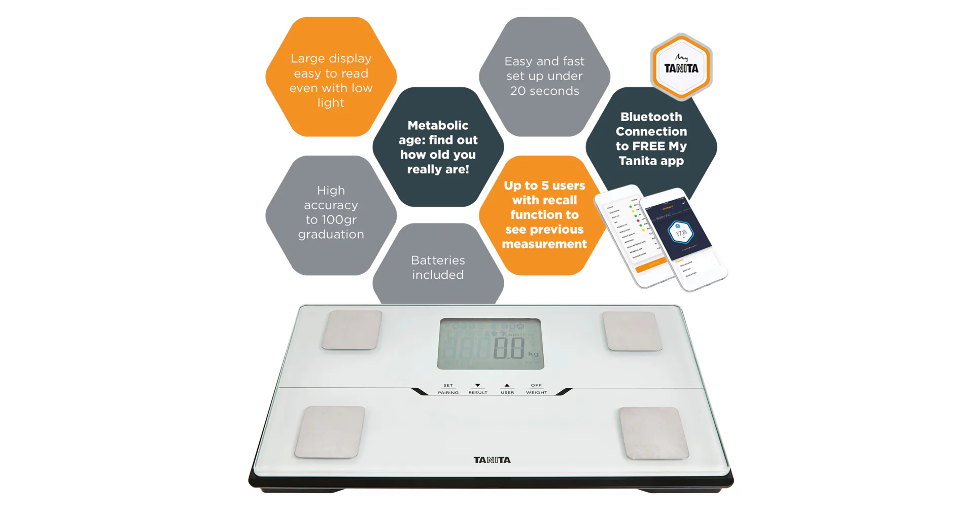 Platforma so štvorelektródovým systémom dokáže automaticky rozpoznať zadaného užívateľa (max. 4 osoby), podľa najbližšej zistenej telesnej váhy, pričom inverzný display rozlíši každého z nich iným farebným podsvietením. Zapnutie sa aktivuje jednoduchým nástupom na platformu z tvrdeného skla. TANITA BC-401 používa bioelektroimpedančnú technológiu "scanu" - BIA. Tá poskytuje vysoko presnú neivazívnu metódu v tomto prípade výrobcom udávanú presnosťou váženia na 100 g, resp. 0,1%.