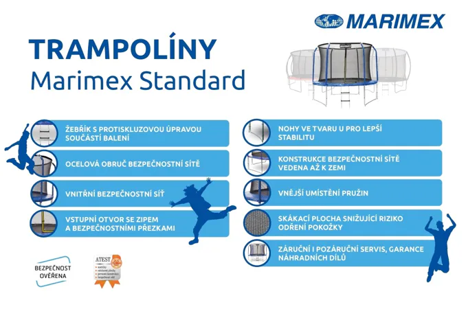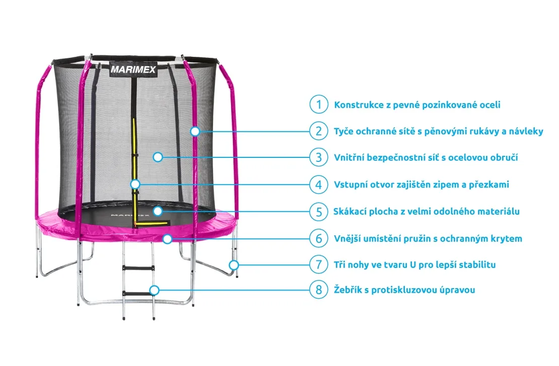 Trampolína Marimex je skvelým doplnkom každej záhrady a vaše deti si skákanie na tejto trampolíne rýchlo zamilujú. Dokonalú stabilitu zaisťujú tri nohy v tvare písmena U. Nosnosť je do 50 kg.
