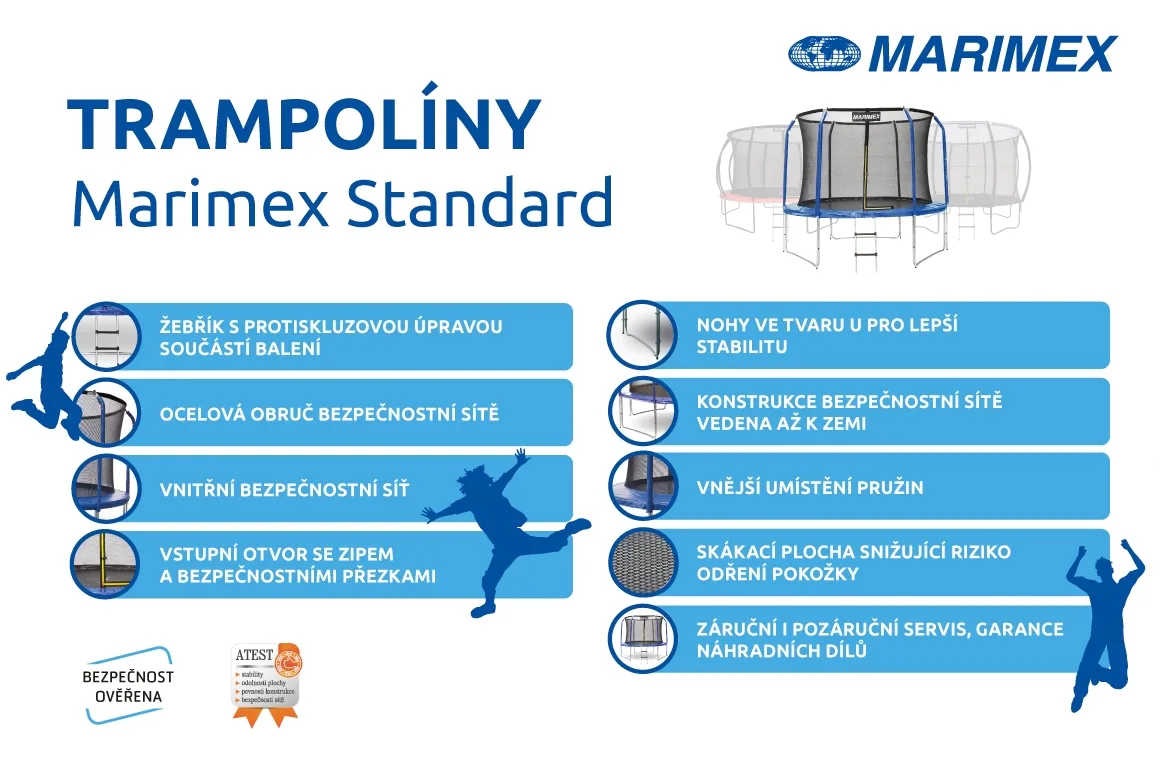 Trampolína Marimex je skvelým doplnkom každej záhrady a vaše deti si skákanie na tejto trampolíne rýchlo zamilujú. Dokonalú stabilitu zaisťujú tri nohy v tvare písmena U. Nosnosť je do 150 kg, takže si ľahko zacvičia aj dospelí.