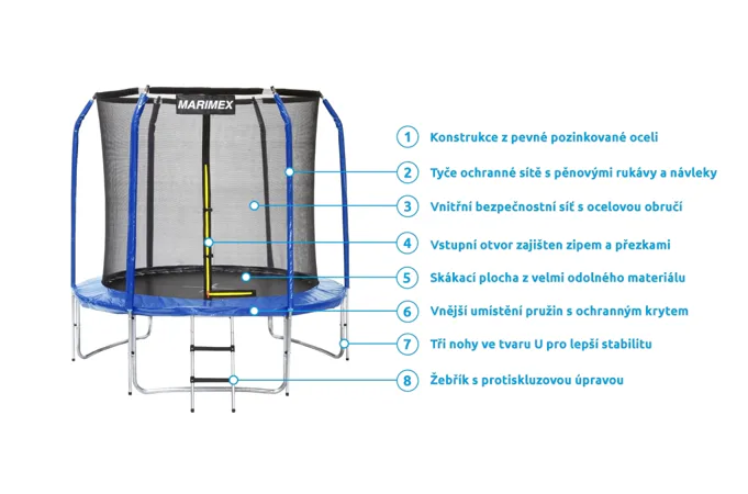 Trampolína Marimex je skvelým doplnkom každej záhrady a vaše deti si skákanie na tejto trampolíne rýchlo zamilujú. Dokonalú stabilitu zaisťujú tri nohy v tvare písmena U. Nosnosť je do 150 kg, takže si ľahko zacvičia aj dospelí.