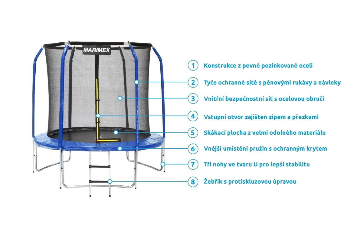 Vnútorná ochranná sieť je súčasťou balenia a nie je potrebné ju dokupovať zvlášť. Vnútorná ochranná sieť je bezpečnejšia ako vonkajšia sieť - bráni prístupu skákajúceho do časti s pružinami. Vstupný priestor je zaistený tromi prackami a bráni vypadnutiu. Tyče sú obalené ochranným návlekom z mäkčenej peny.