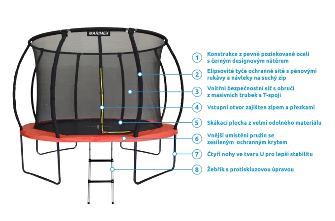 Na bezpečnostné prvky trampolín Marimex Premium je kladený veľký dôraz, preto sú radené medzi najbezpečnejšie a najspoľahlivejšie na slovenskom trhu.