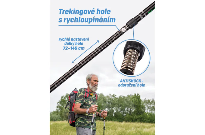 Trekingové palice ACRA LTH138 grafitové odľahčené, sú skvelým parťákom na cesty. Nastaviteľné rozmedzie dĺžky je 72 - 145 cm, ergonomické rukoväte sú ľahké a príjemné na držanie, rýchloupínací mechanizmus umožňuje rýchle nastavenie potrebnej dĺžky palicou. Palice sú vybavené funkciou ANTISHOCK - odpruženie palice pre maximálny komfort.