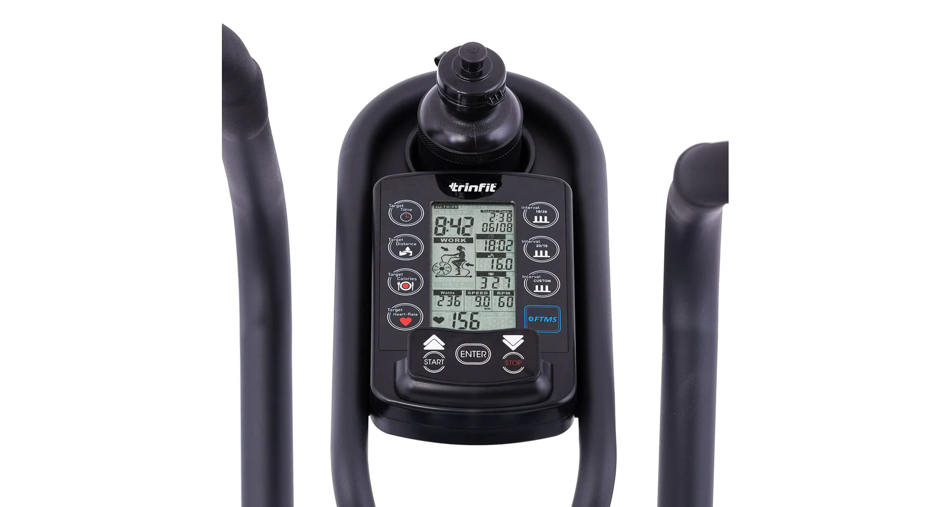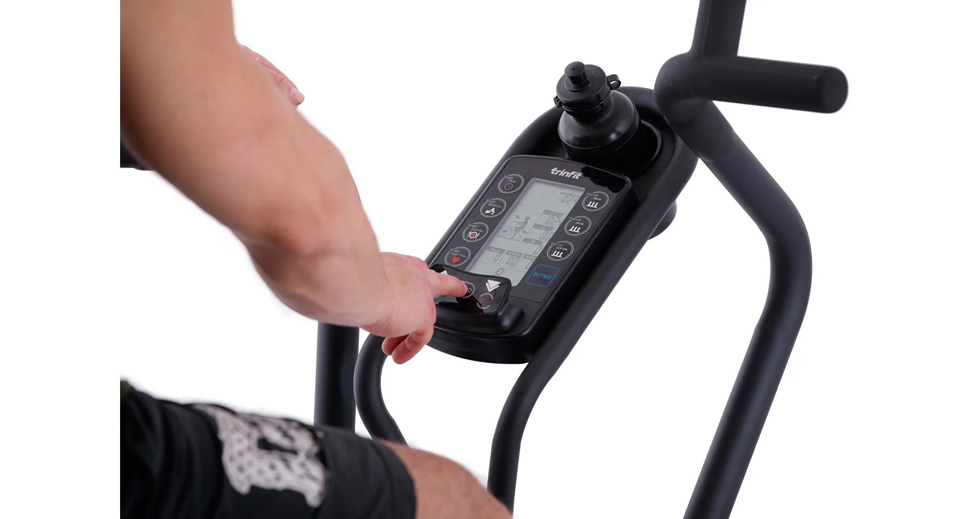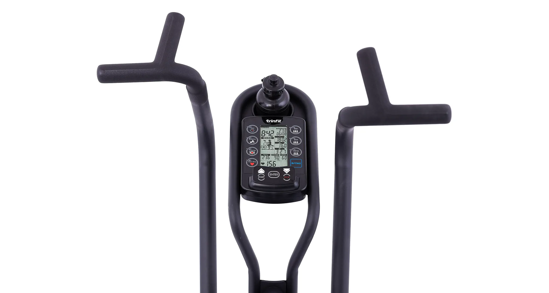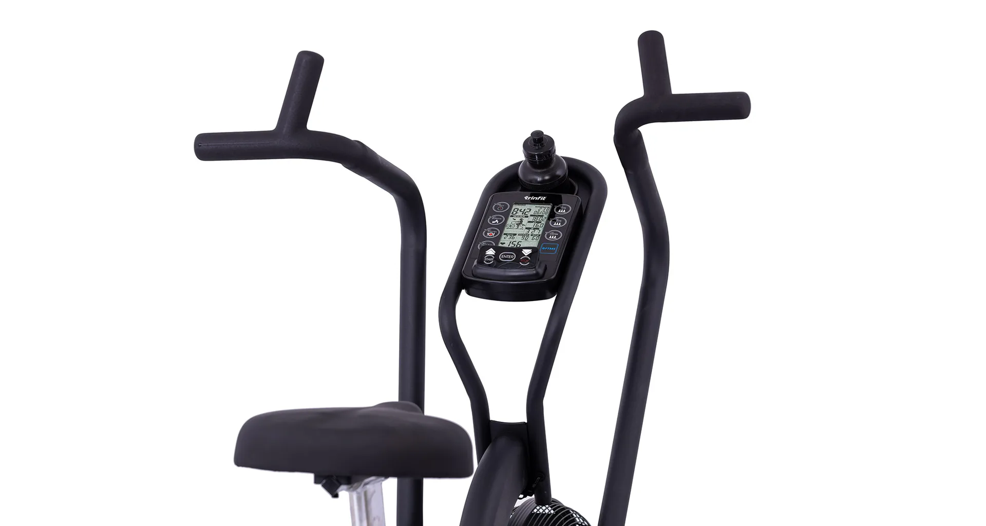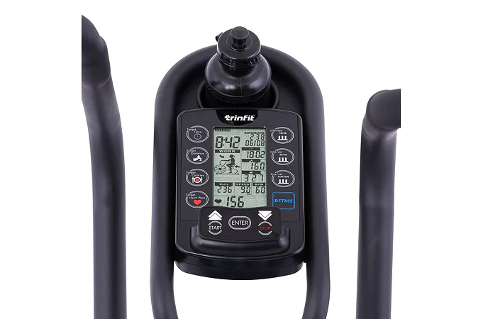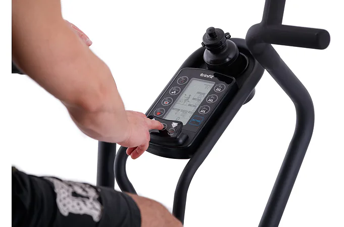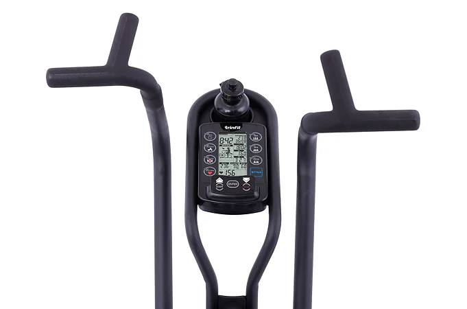 TRINFIT Air Bike Pro nabízí přehledný LCD displej, který vám vyobrazí všechny základní hodnoty pro váš trénink. Umožní vám sledovat váš trénink v reálném čase pomocí dat monitorujících váš čas, vzdálenost, rychlost, spálené kalorie, otáčky za minutu a srdeční frekvenci.