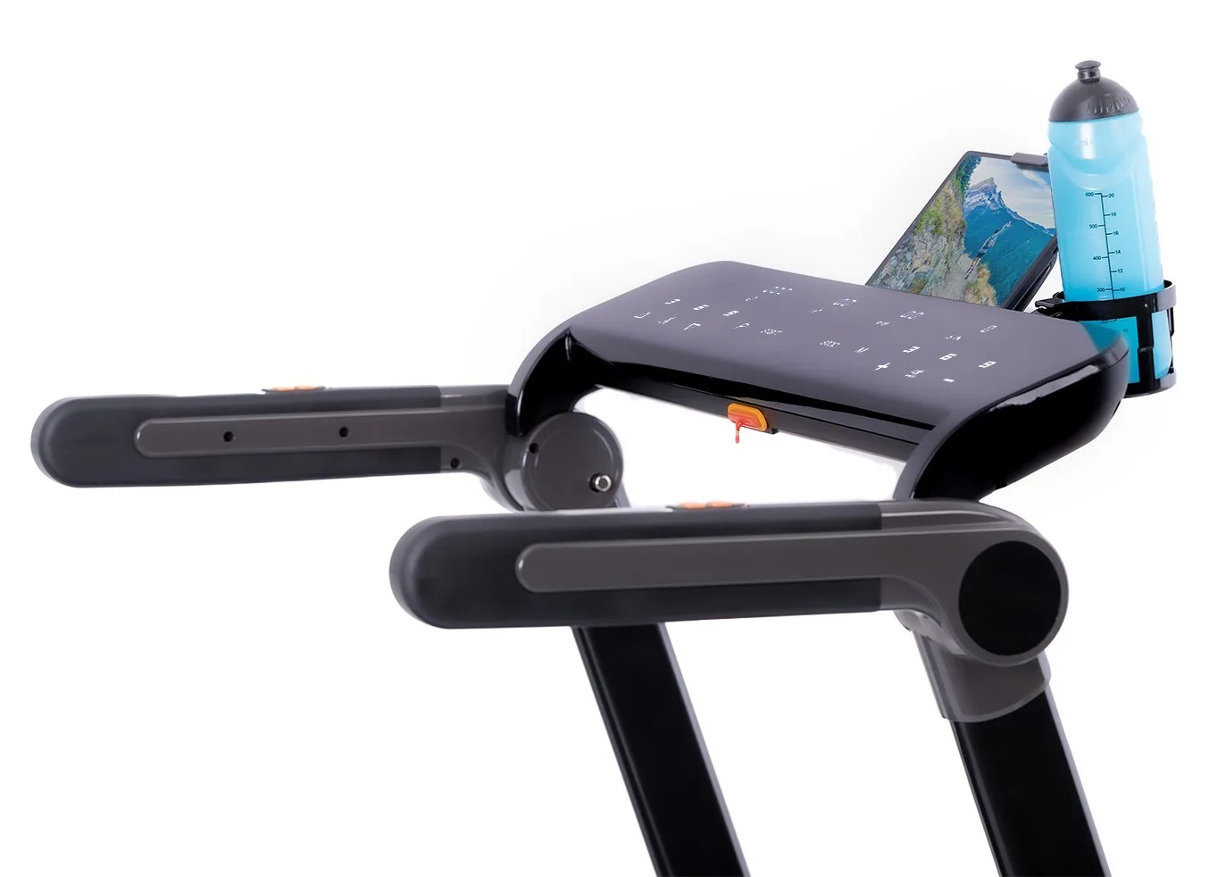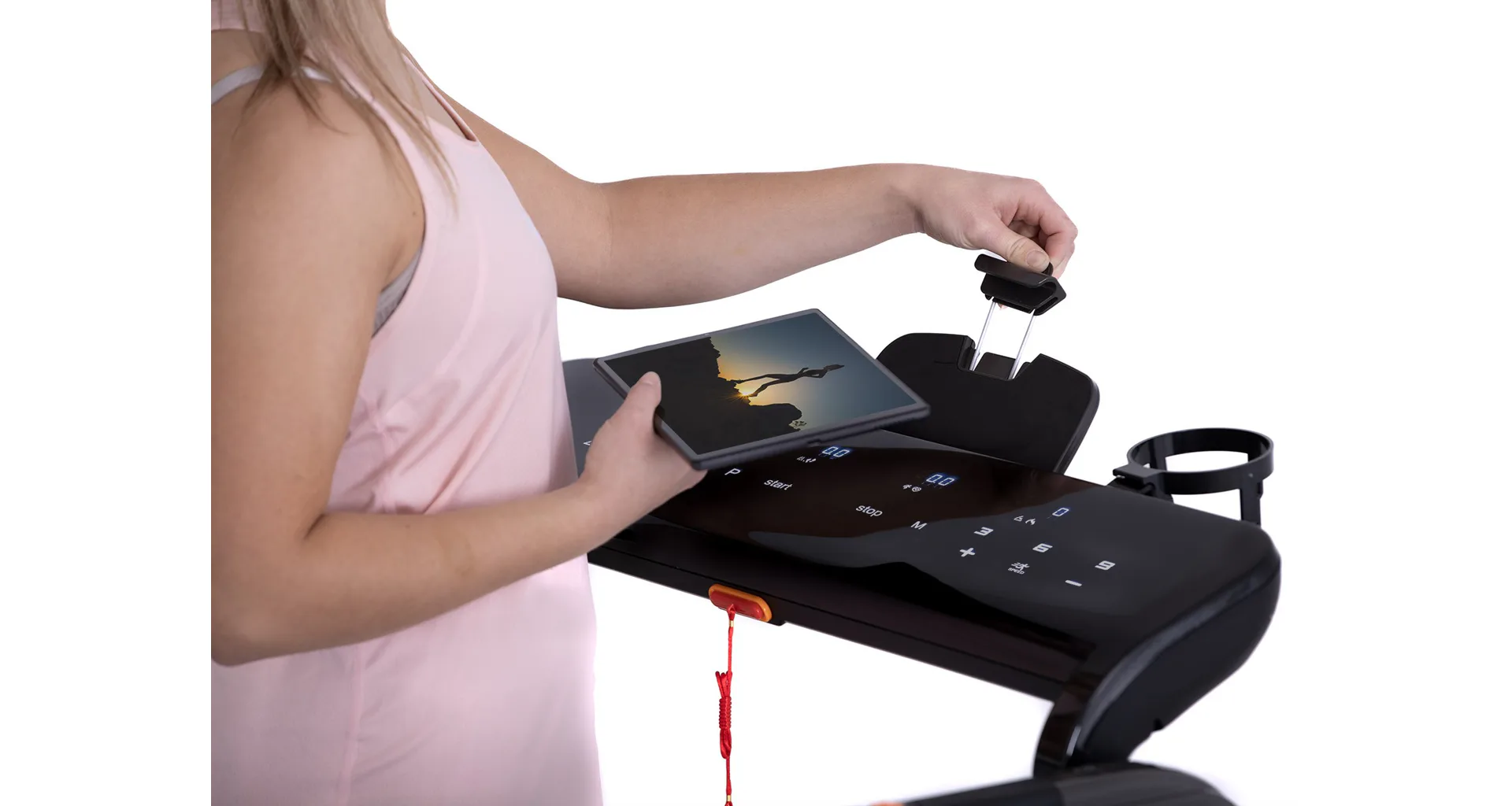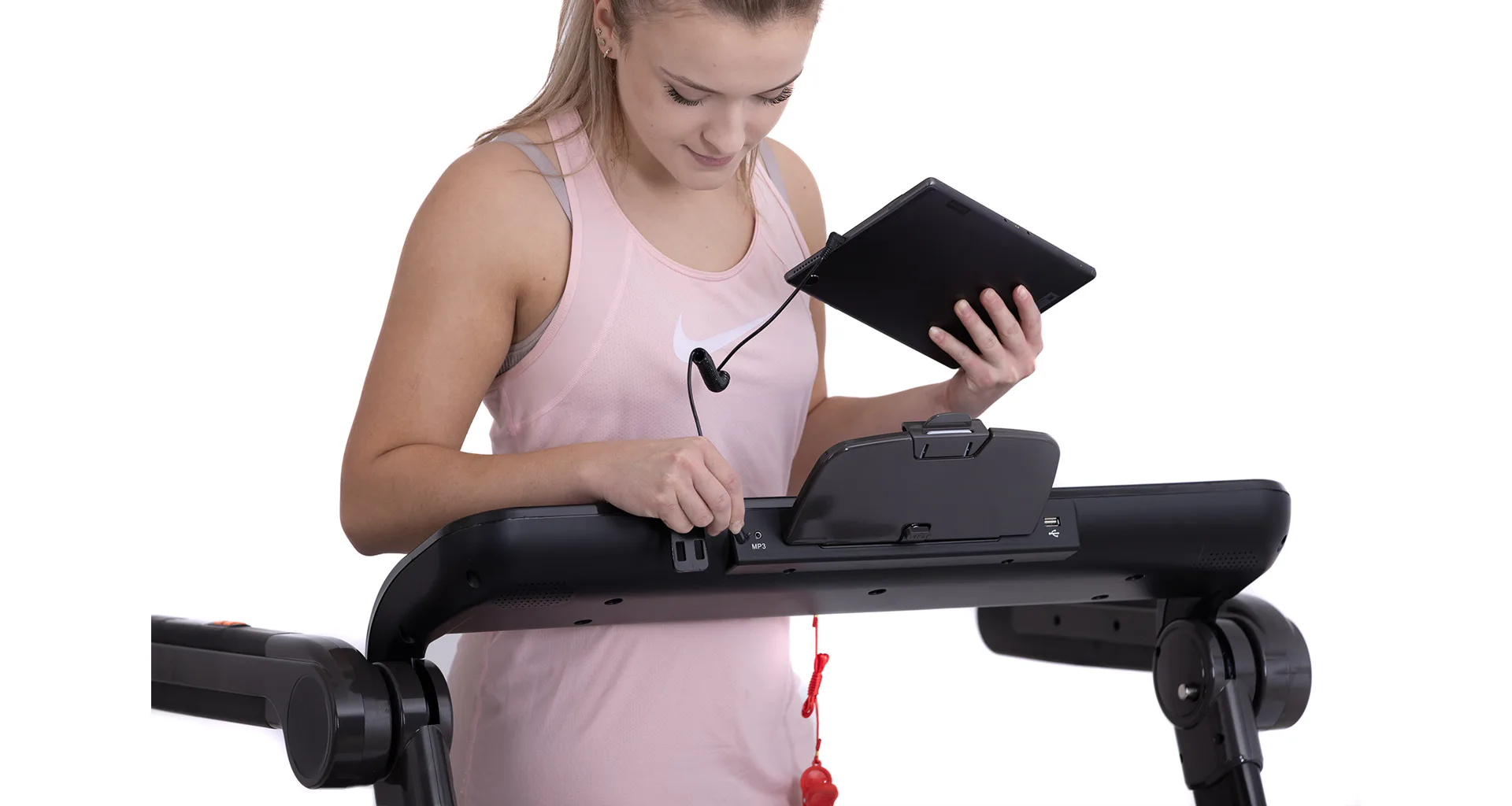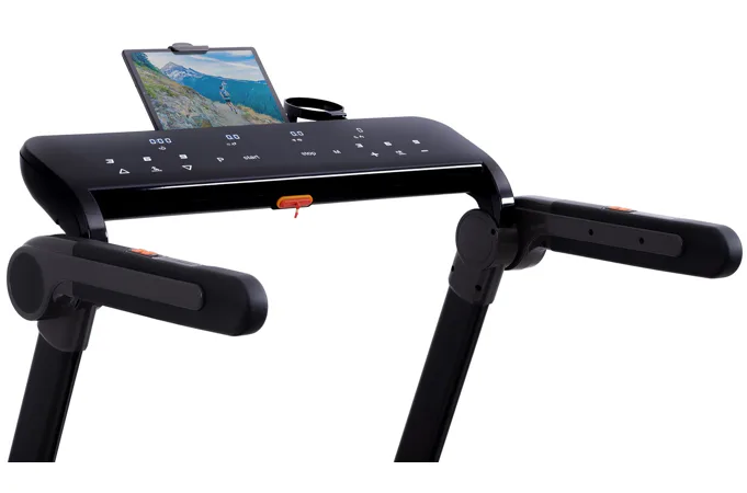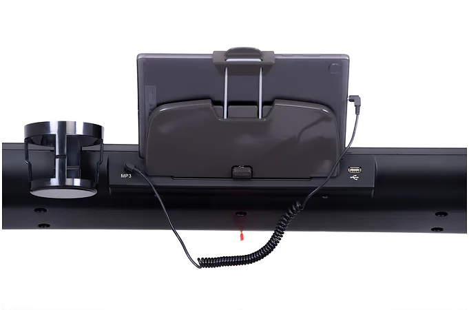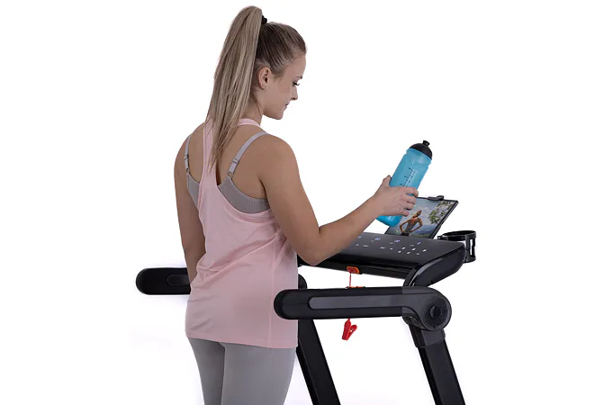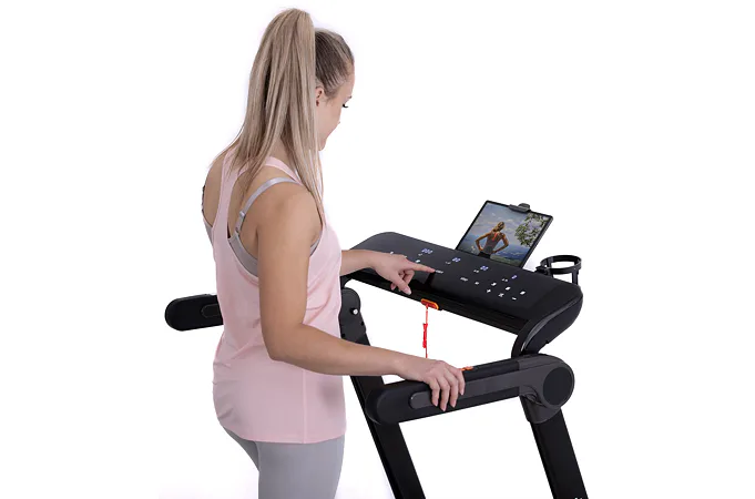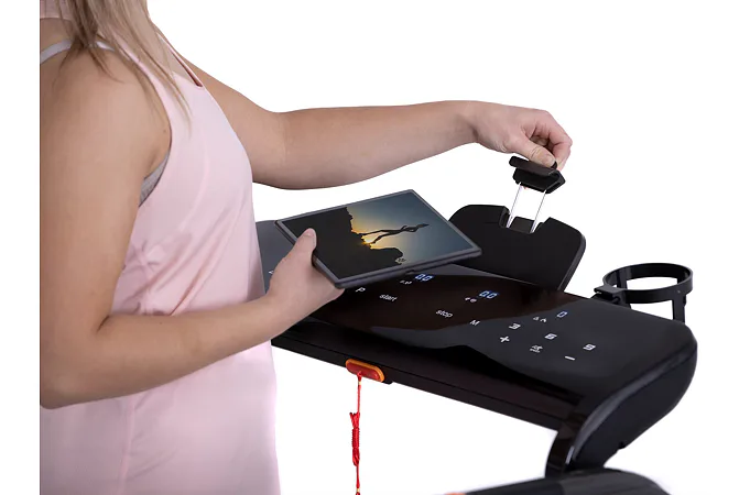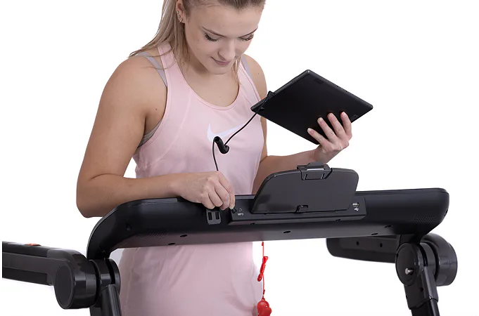 Díky funkci Bluetooth je možné běžecký pás spárovat s chytrými zařízeními pro poslech hudby ze zabudovaných reproduktorů a také můžete využívat tréninkové aplikace. Vyobrazený tablet není součástí dodávky.