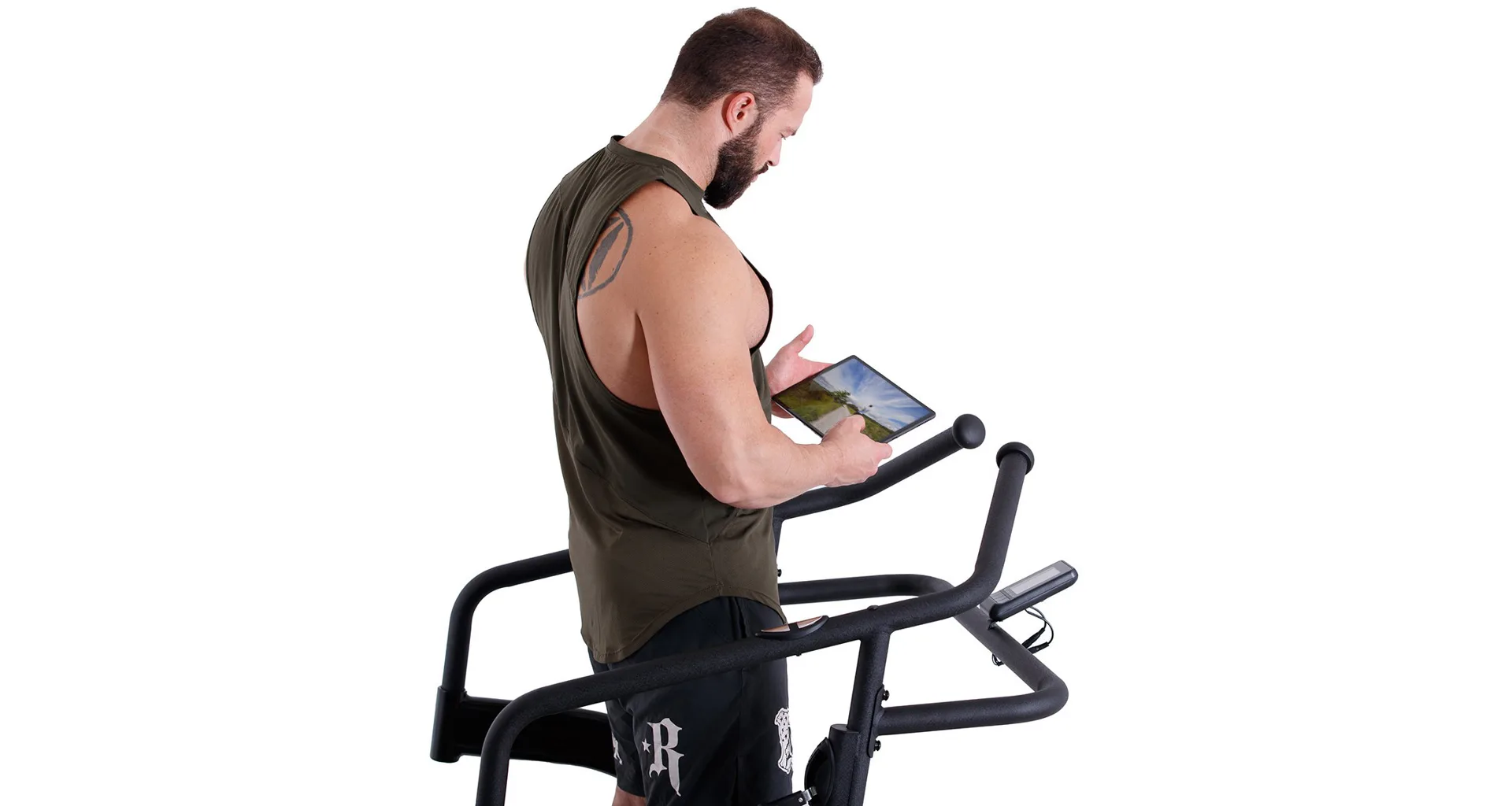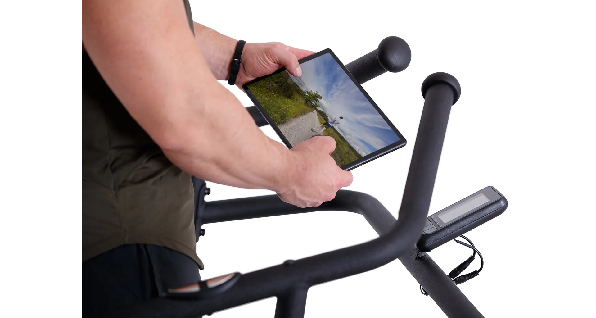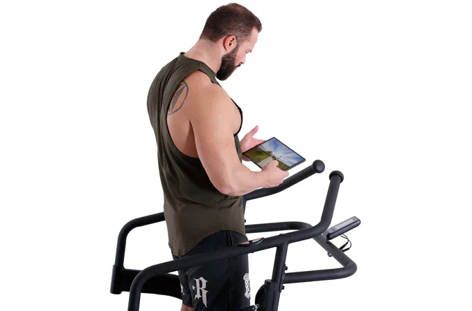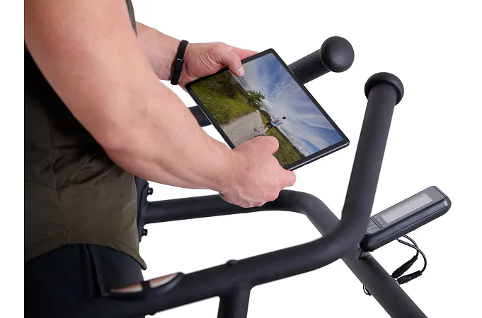 Díky funkci Bluetooth je možné běžecký pás spárovat s chytrými zařízeními pro využívání tréninkových aplikací. Vyobrazený tablet není součástí dodávky.