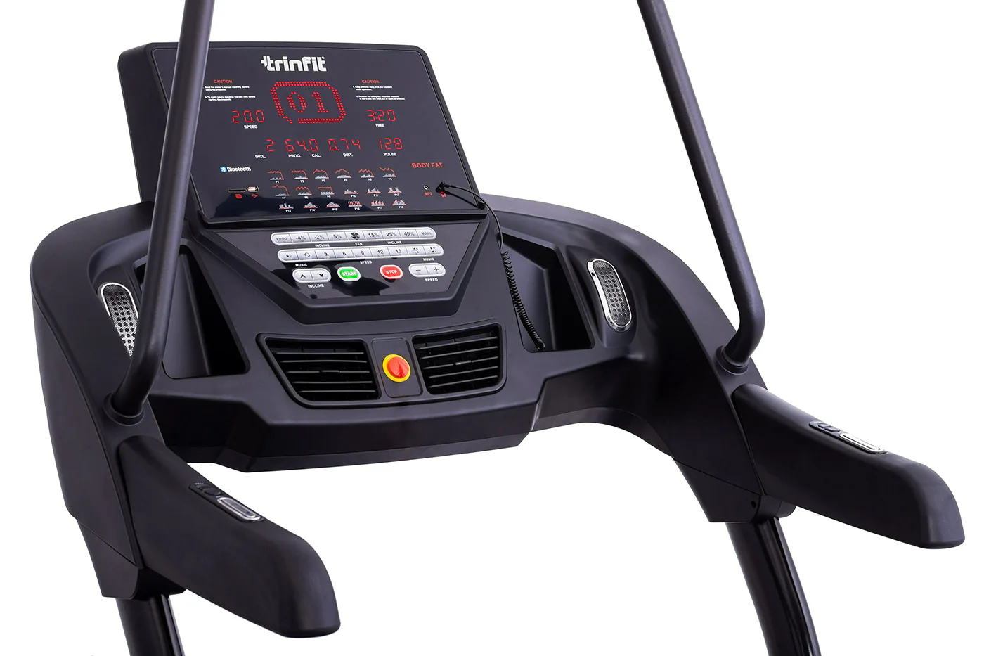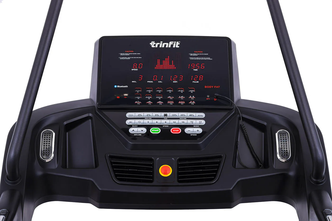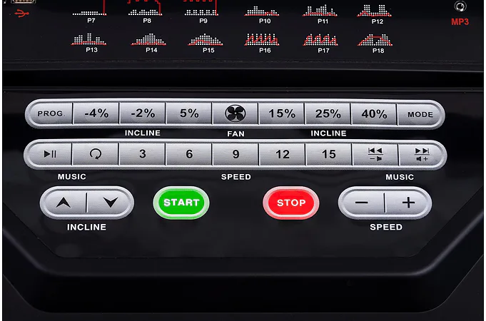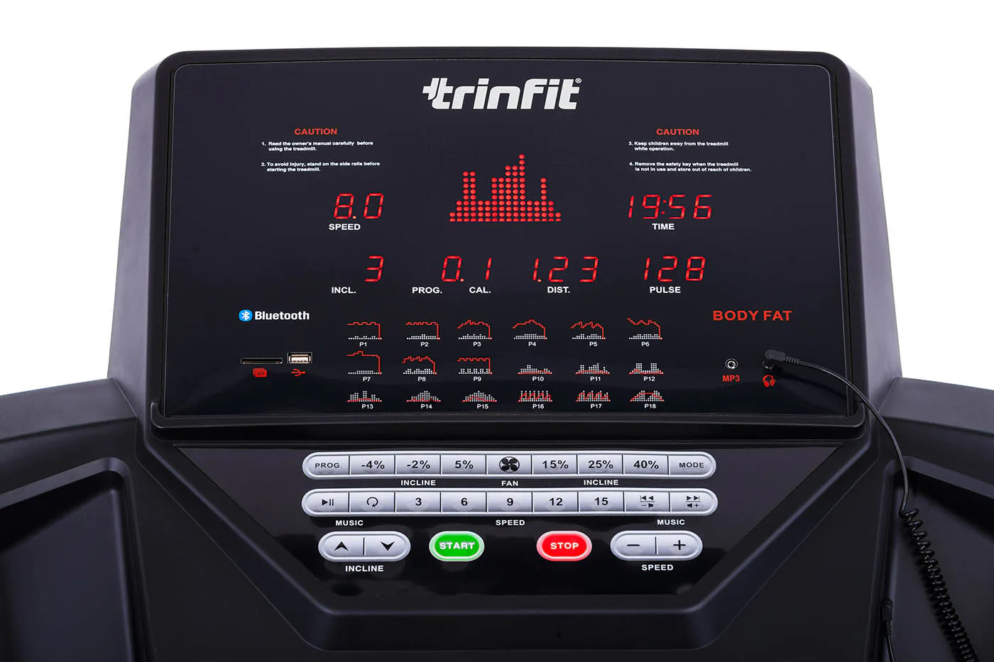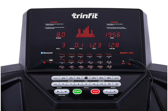 TRINFIT Incline T15 Pro nabízí velký, přehledný a podsvětlený LED displej s bohatou programovou nabídkou pro efektivní a zábavný trénink. Umožní vám sledovat váš trénink v reálném čase pomocí dat monitorujících vaši rychlost, čas, vzdálenost, spálené kalorie a srdeční frekvenci. Rychlost a sklon běhu si můžete nastavovat během tréninku ručně tlačítky, případně si můžete si vybrat některý z 18 přednastavených tréninkových programů, nebo si vytvořit 3 vlastní programy na míru podle vašich představ.