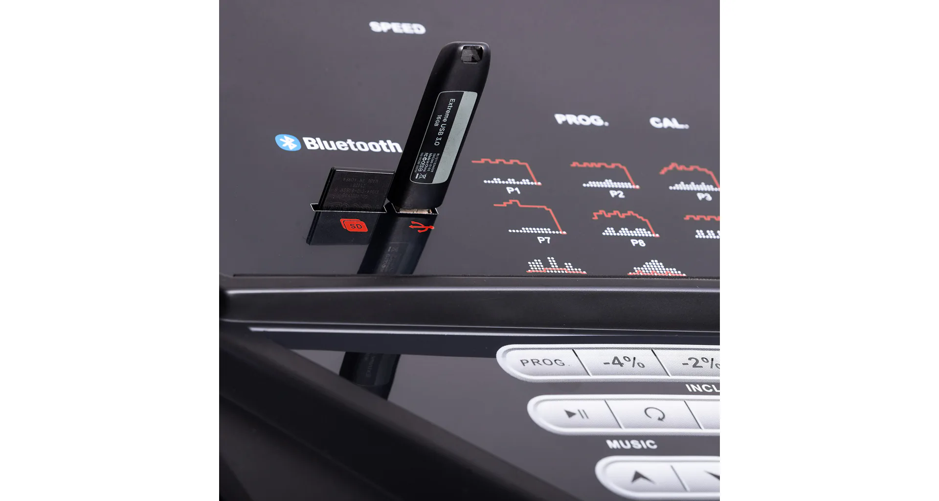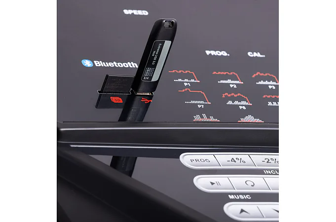 Díky funkci Bluetooth je možné běžecký pás spárovat s chytrými zařízeními pro využívání tréninkových aplikací. Vyobrazený tablet není součástí dodávky.
