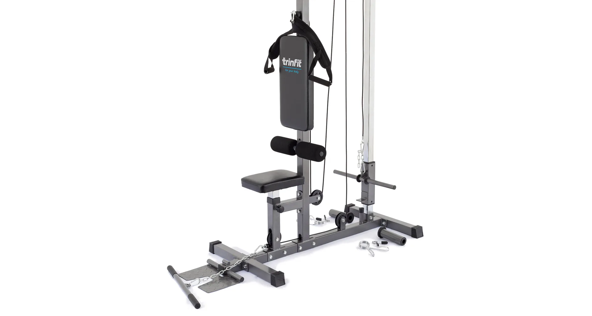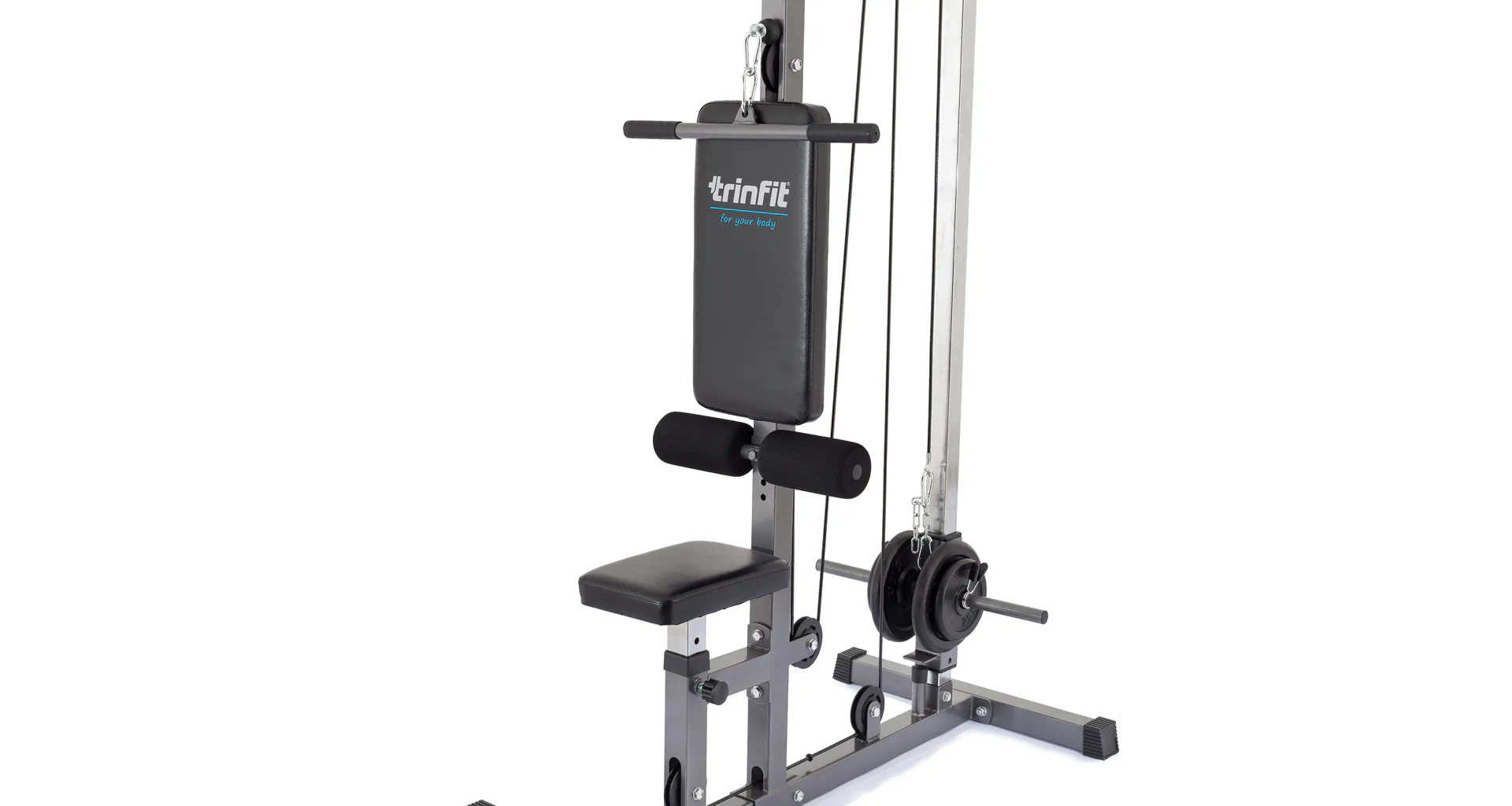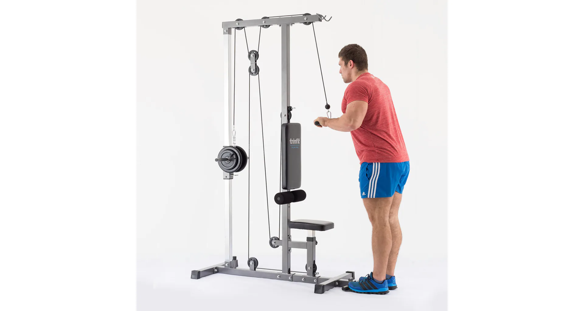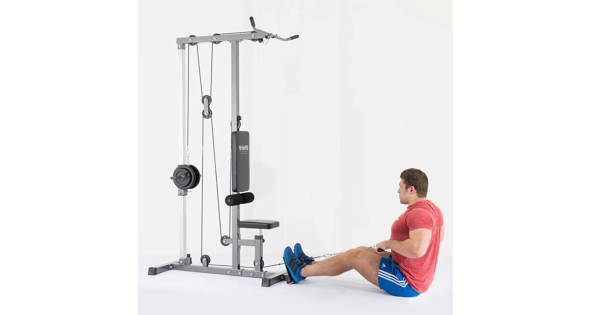 Výhodou kladkostroja TRINFIT je úplná plynulosť pohybu všetkých kladiek daná nylonovými kladkami s ložiskami a prevodmi oceľovým lankom potiahnutým špeciálnou vrstvou. Či už sa bavíme o spodnej kladke, kladke hornej, či tricepsovej, pojazdy sú veľmi plynulé a nevydávajú žiadny hluk. Robustná a stabilná konštrukcia z oceľových profilov 50 x 50 mm je vybavená kvalitným práškovým lakom, ktorý slúži zároveň aj ako ochrana proti poškrabaniu, či korózii. Polohovateľné sedadlo, polohovateľné kolenné válce na zaprenie nôh aj opierky nôh na veslovanie zvyšujú istotu a komfort pri cvičení. Opierky kolien sú osadzené penovými válcami, chrbtová opierka ďalej kvalitným čalúnením. Adaptéry sú na koncoch opatrené protišmykovým gumovým materiálom, ktorý napomáhá pevnému úchopu.