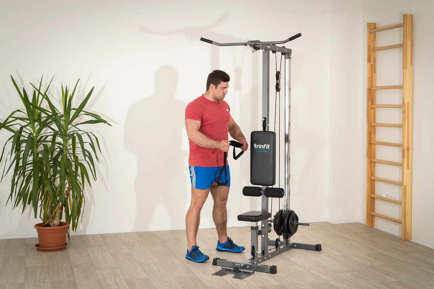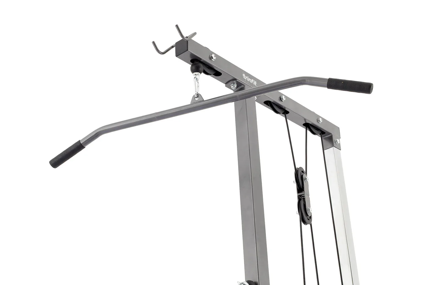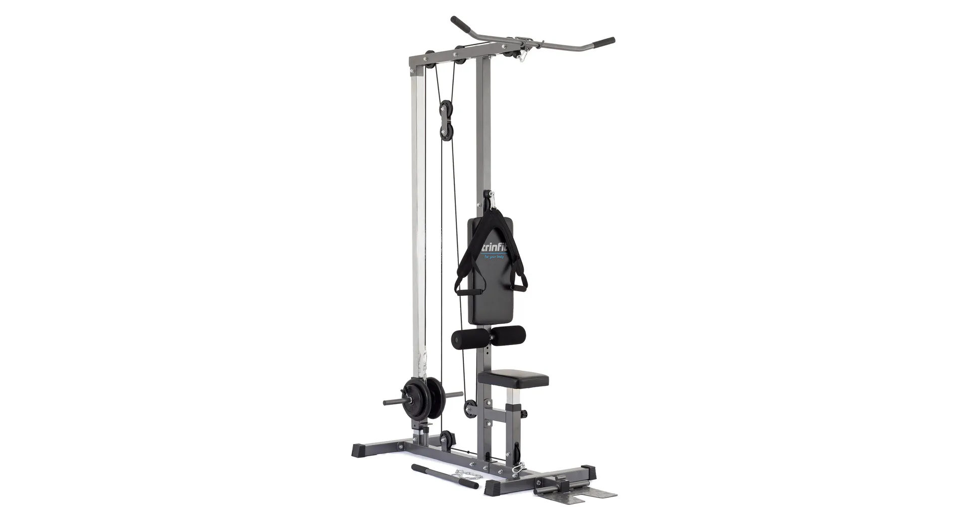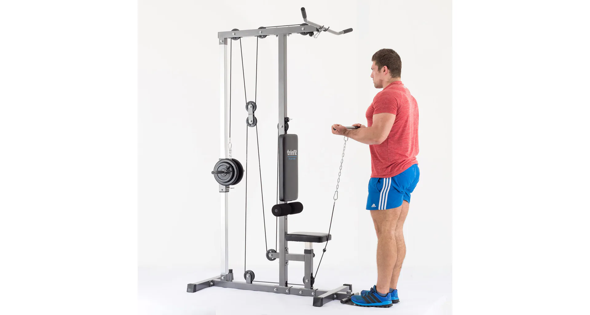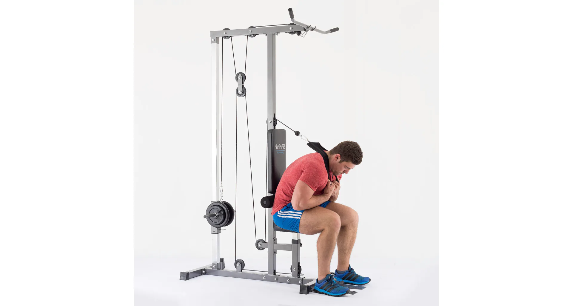 Výhodou kladkostroja TRINFIT je úplná plynulosť pohybu všetkých kladiek daná nylonovými kladkami s ložiskami a prevodmi oceľovým lankom potiahnutým špeciálnou vrstvou. Či už sa bavíme o spodnej kladke, kladke hornej, či tricepsovej, pojazdy sú veľmi plynulé a nevydávajú žiadny hluk. Robustná a stabilná konštrukcia z oceľových profilov 50 x 50 mm je vybavená kvalitným práškovým lakom, ktorý slúži zároveň aj ako ochrana proti poškrabaniu, či korózii. Polohovateľné sedadlo, polohovateľné kolenné válce na zaprenie nôh aj opierky nôh na veslovanie zvyšujú istotu a komfort pri cvičení. Opierky kolien sú osadzené penovými válcami, chrbtová opierka ďalej kvalitným čalúnením. Adaptéry sú na koncoch opatrené protišmykovým gumovým materiálom, ktorý napomáhá pevnému úchopu.