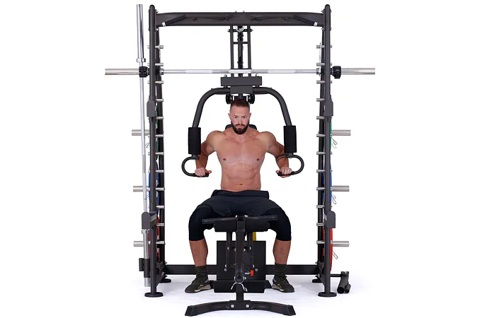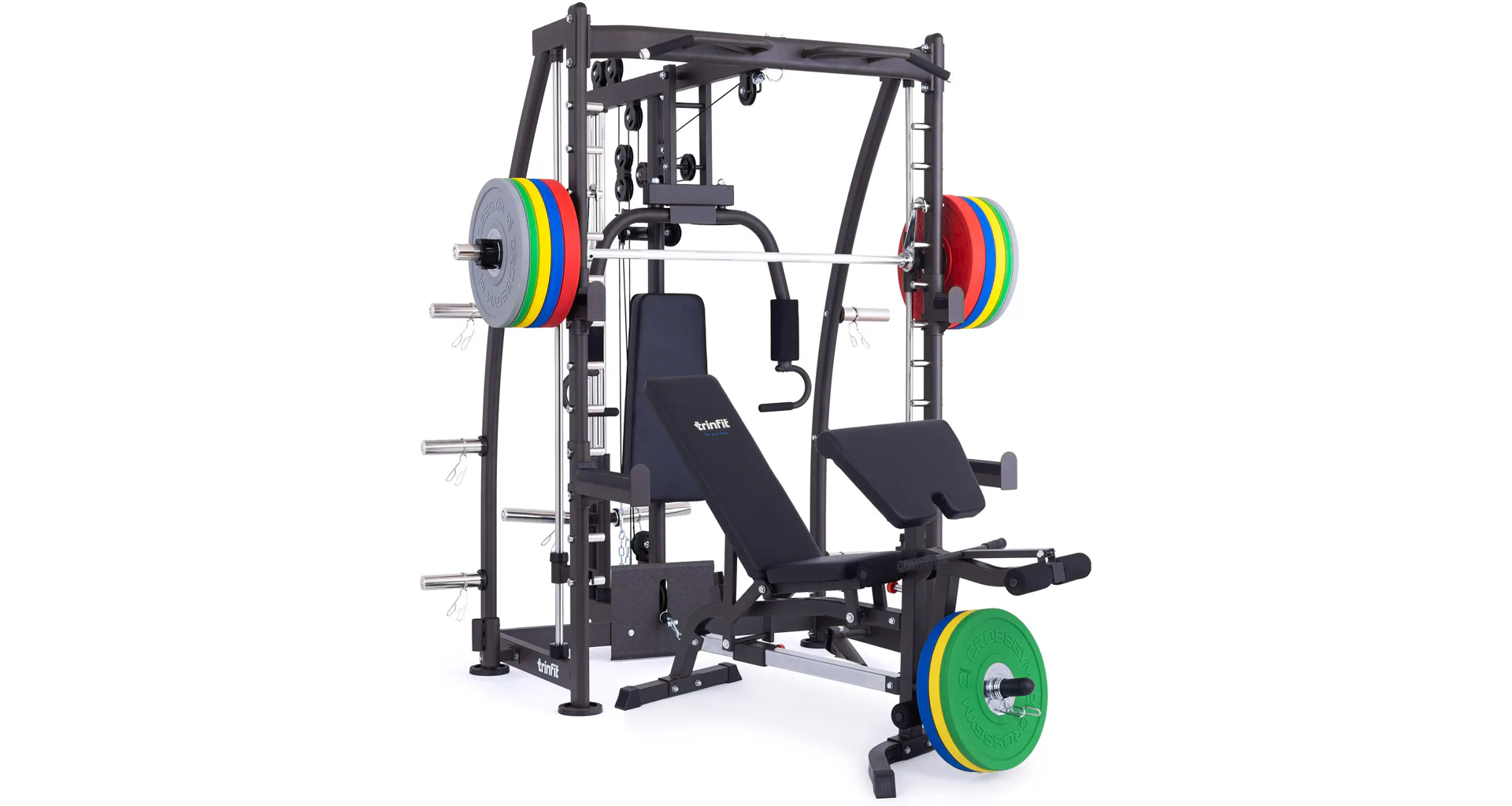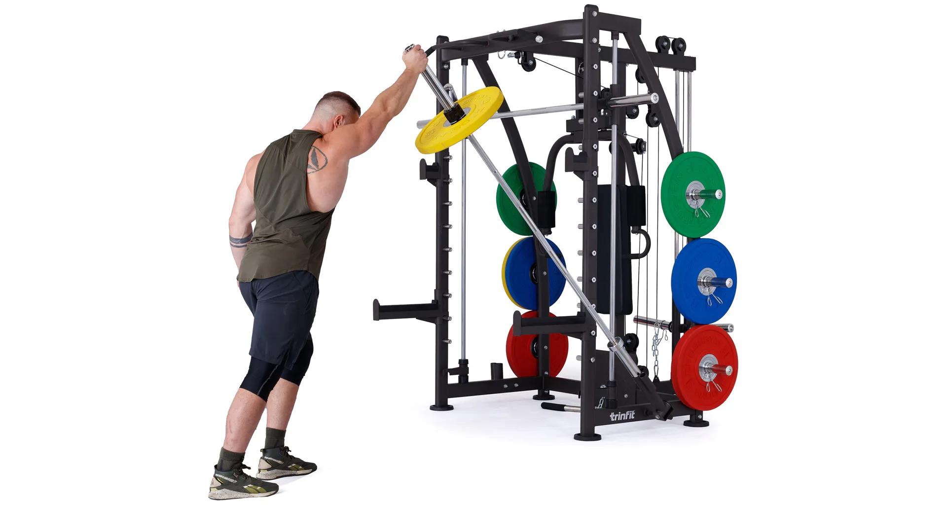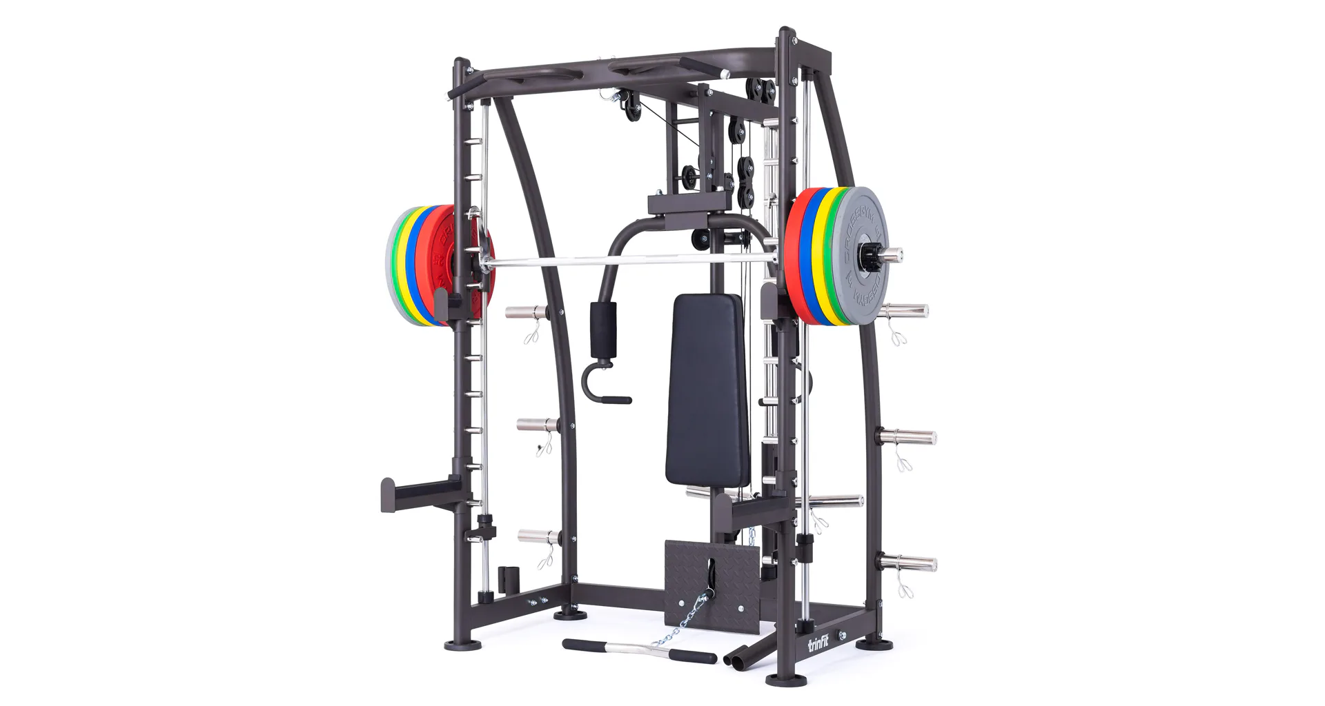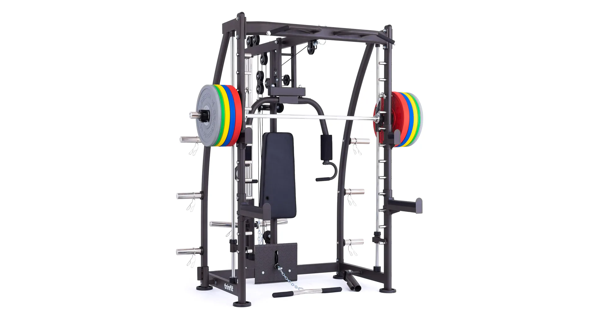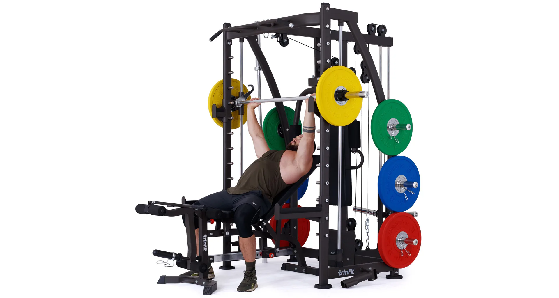 Multipress TRINFIT Multi Smith CX40 využívá jako závaží kotouče, je tedy pouze na vás, jakou zátěž si zvolíte. Je možné použít kotouče s průměrem 25 mm a díky redukcím také olympijské kotouče s průměrem 50 mm. Zároveň nabízí nepřeberné množství druhů cvičení formou tricepsových kliků, tlaků na prsa, ramena, kladek, peck deck atd..