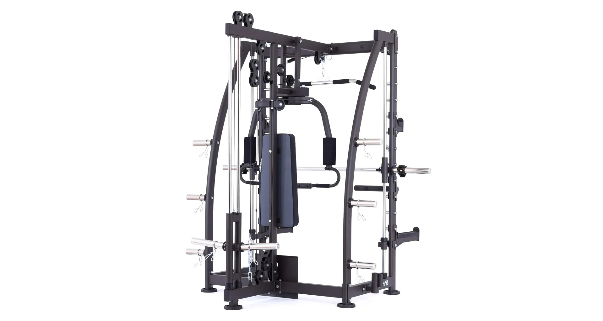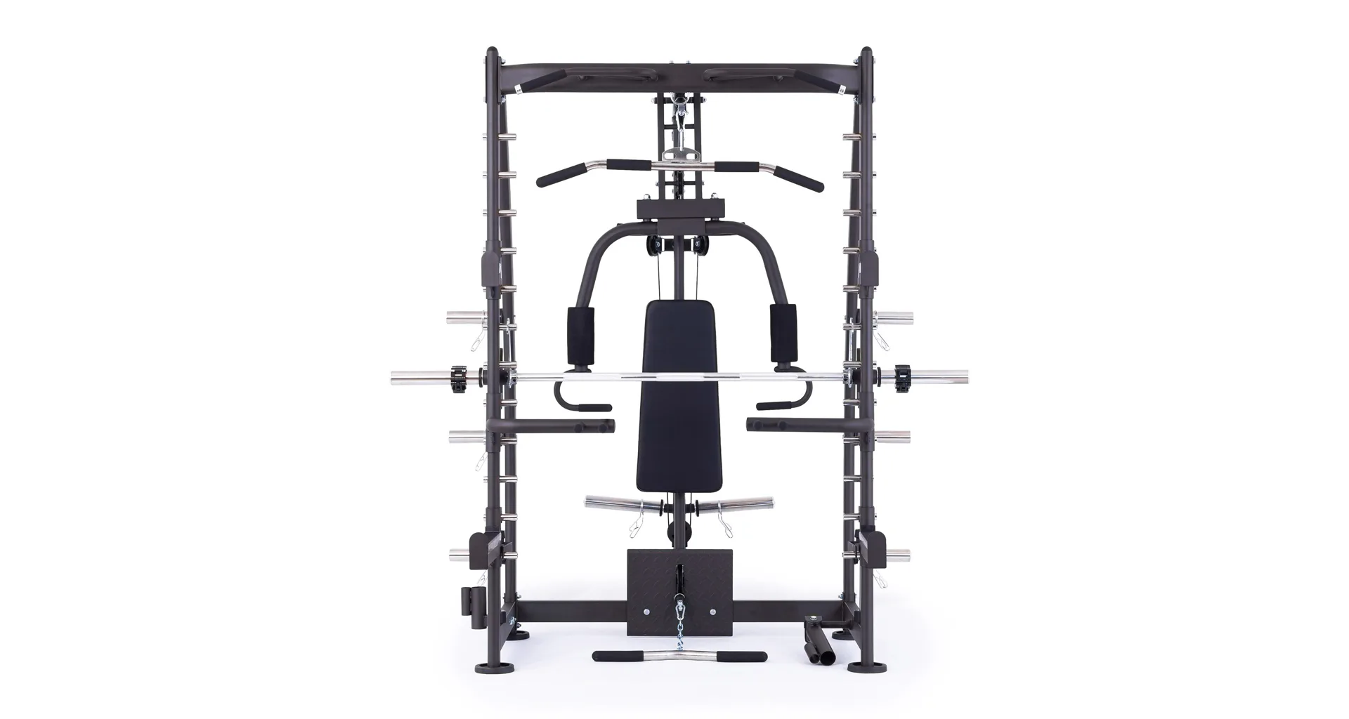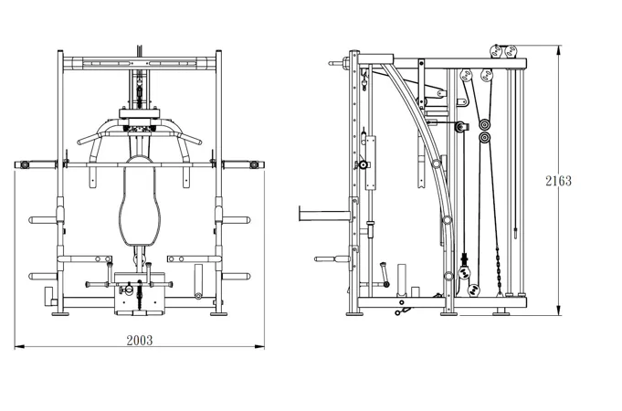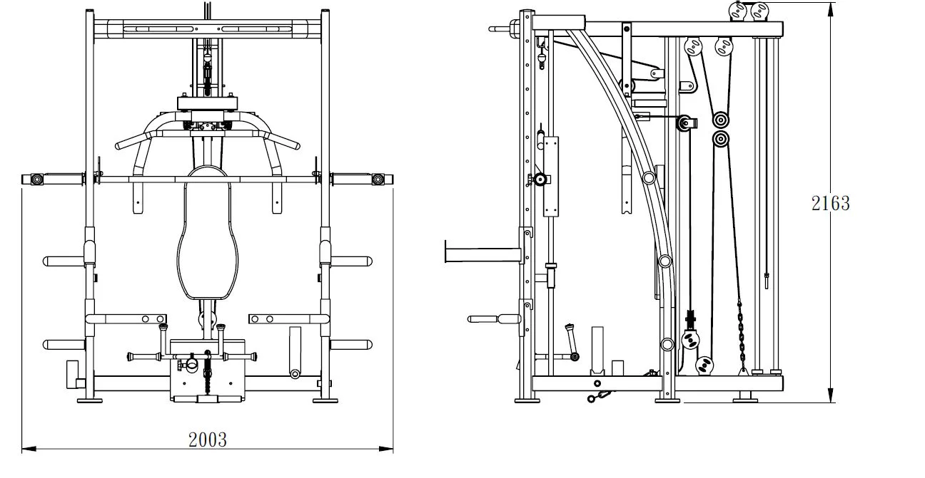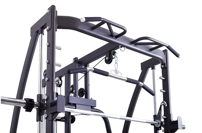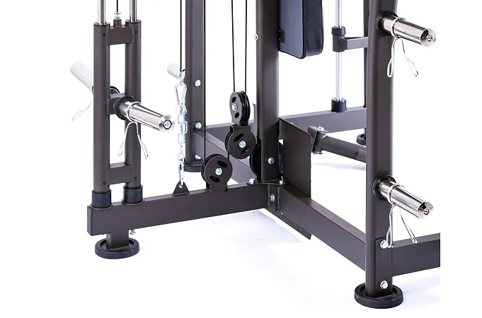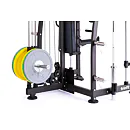 Model Multi Smith CX40 vyniká bezkonkurenční přirozenou ergonomií pohybu kladek, adaptérů a multipressu. Všechny kladky a multipress jsou osazeny kvalitními průmyslovými ložisky s mechanismem pro dopínání. Multipress jako závaží také využívá kotouče s průměrem 25 mm nebo 50 mm a pro odložení kotoučů je po stranách klece celkem 6 odkládacích trnů.