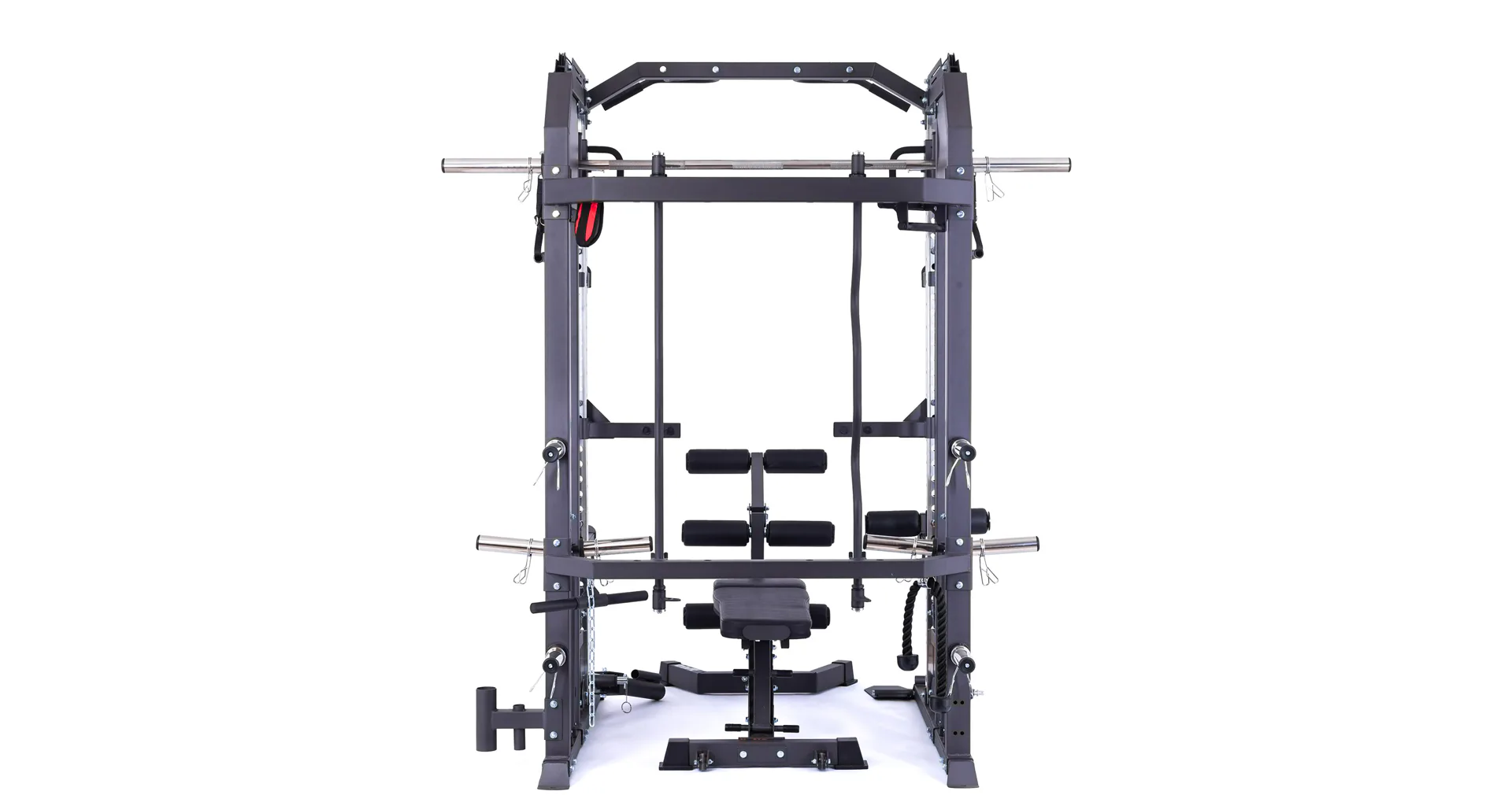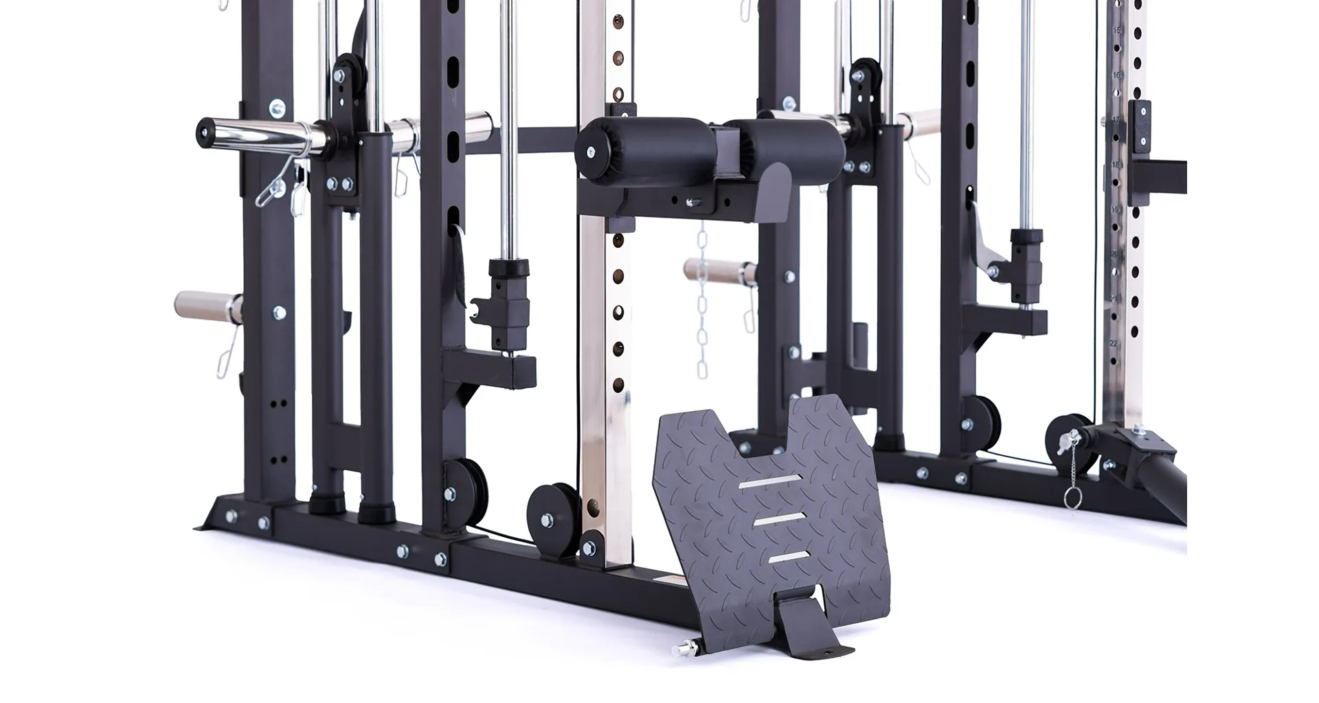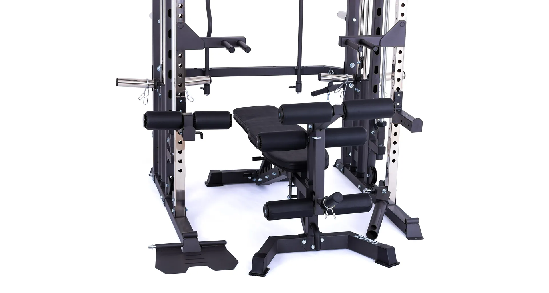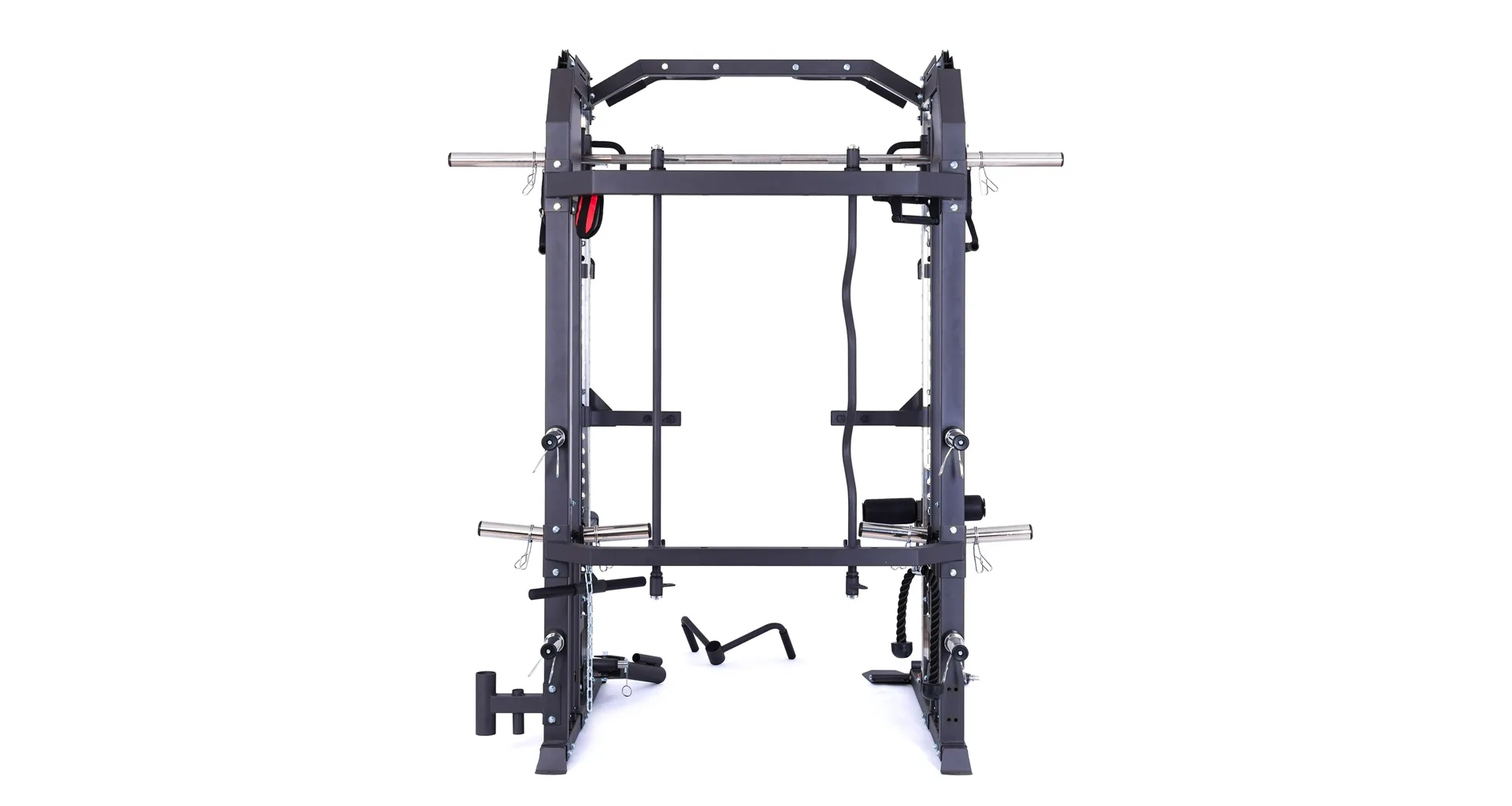 Model Multi Smith CX50 vyniká bezkonkurenční přirozenou ergonomií pohybu kladek, adaptérů a multipressu. Všechny kladky a multipress jsou osazeny kvalitními průmyslovými ložisky s mechanismem pro dopínání. Multipress jako závaží také využívá kotouče s průměrem 25 mm nebo 50 mm a pro odložení kotoučů jsou po stranách klece celkem 4 odkládací trny.