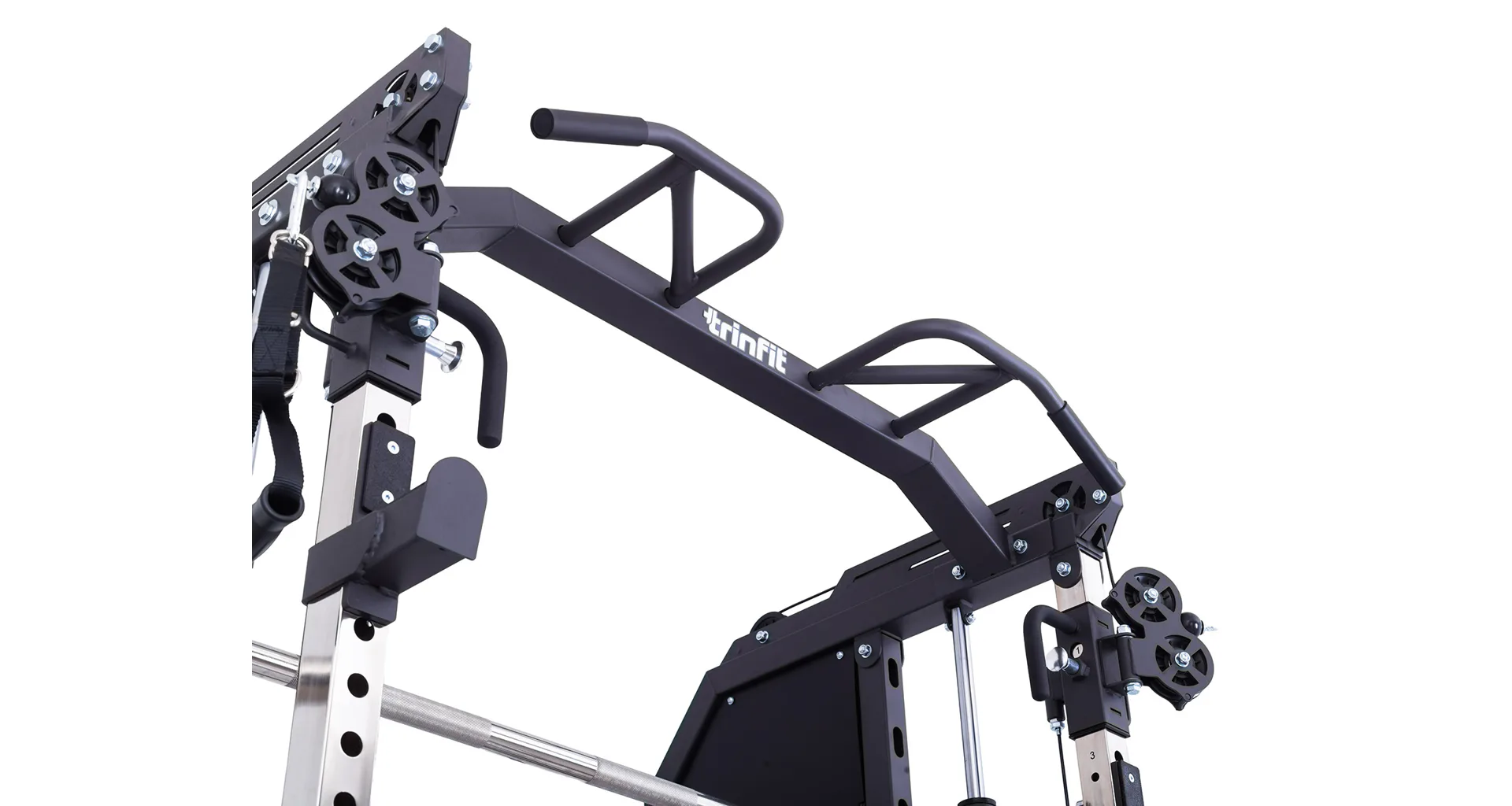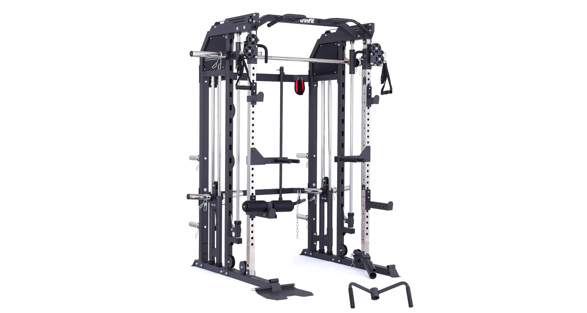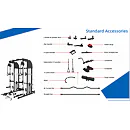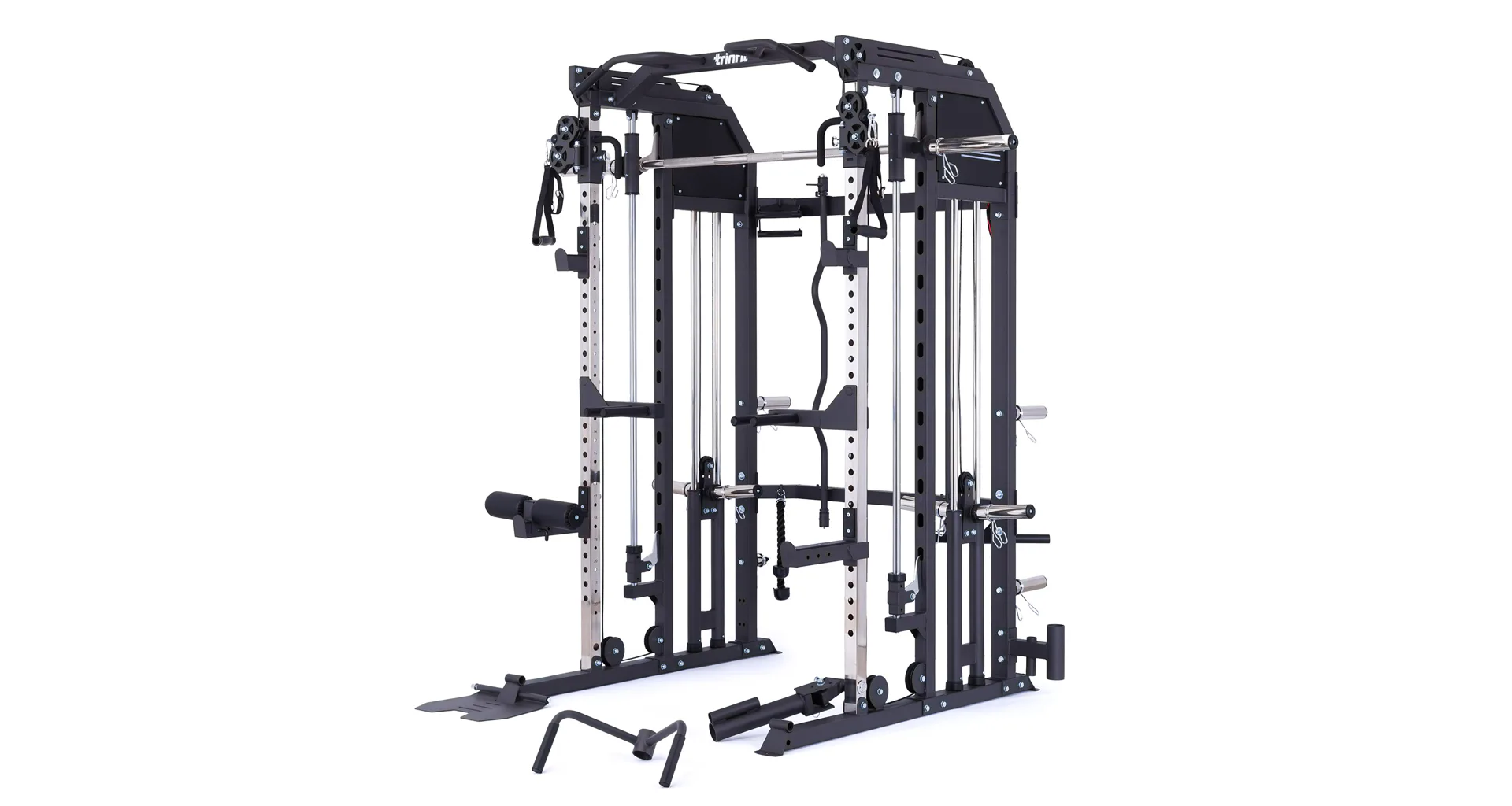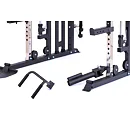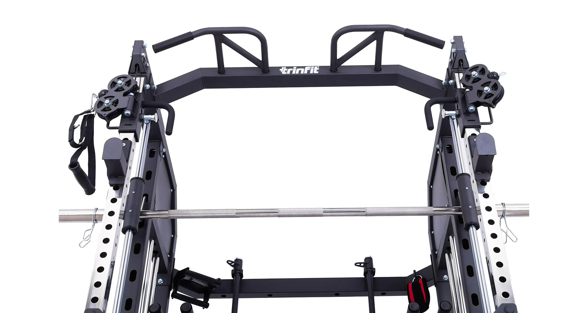 Součástí posilovací klece TRINFIT Multi Smith CX50 je velké množství adaptérů: jednoruční adaptéry, dlouhý rovný adaptér, dlouhý EZ adaptér, tricepsové lano, kotníkový adaptér, V-adaptér pro veslování, krátký rovný adaptér, háky na velkou osu, bezpečnostní dorazy a adaptéry na tricepsové kliky tzv. dipy.
