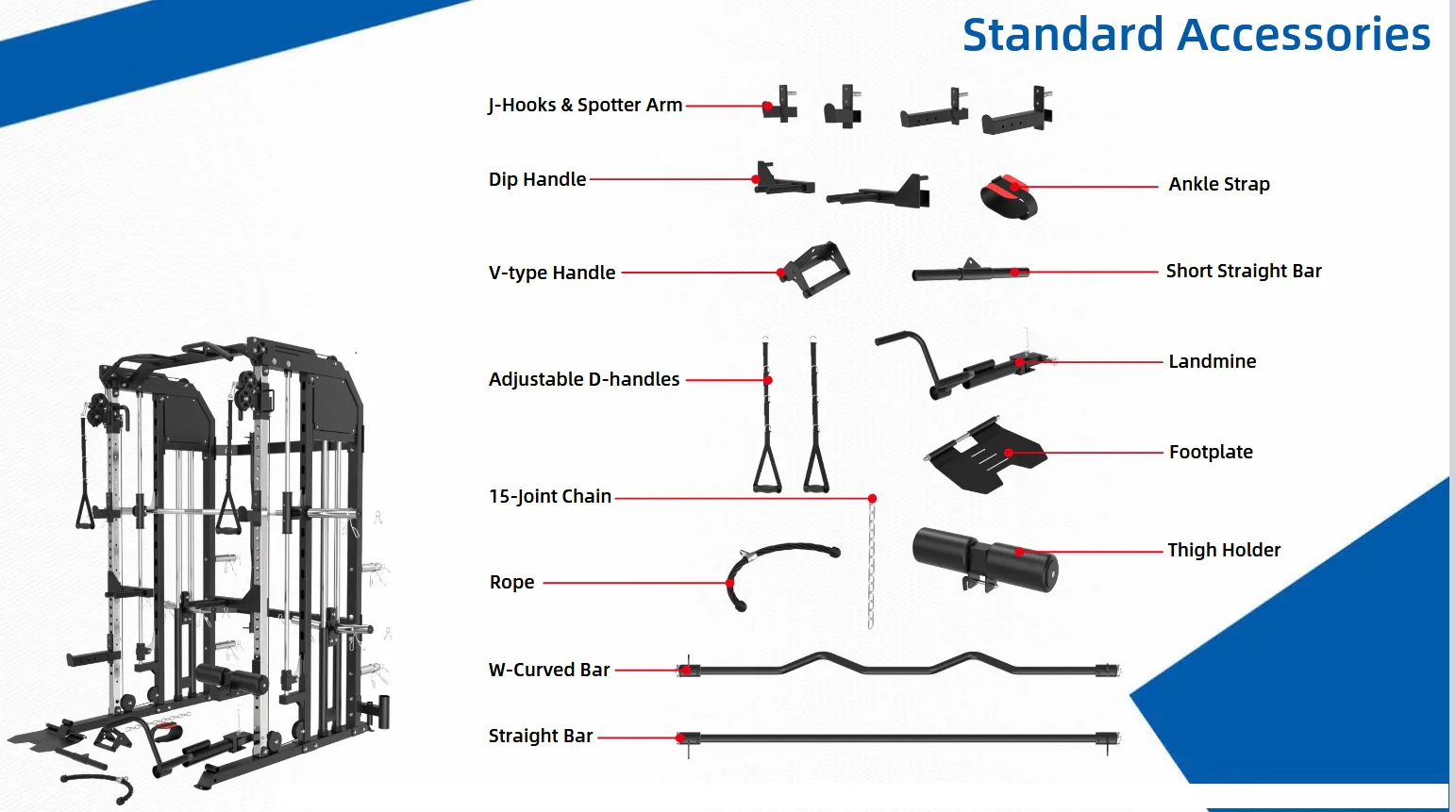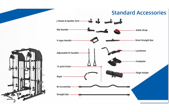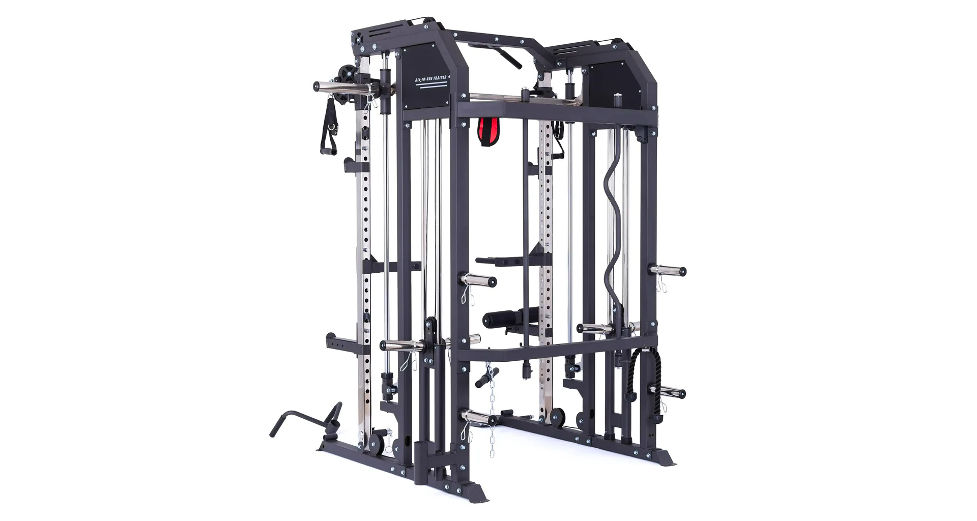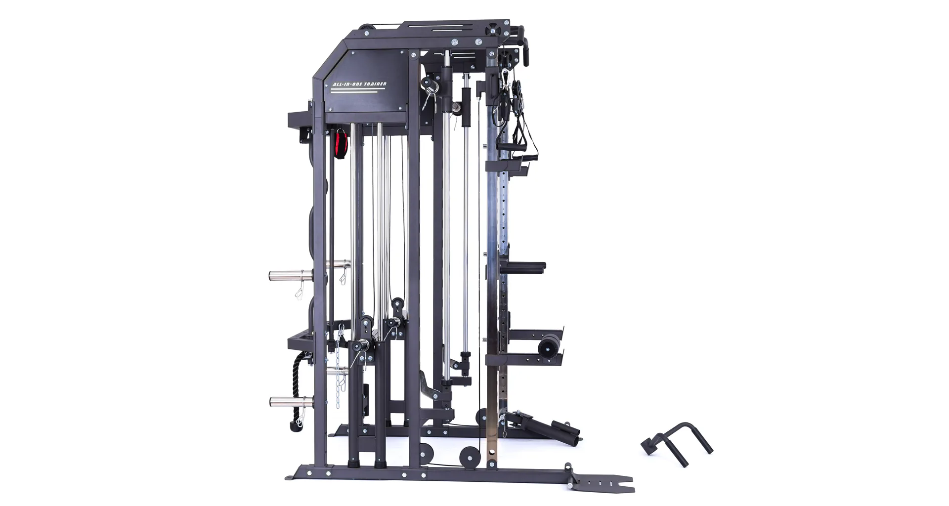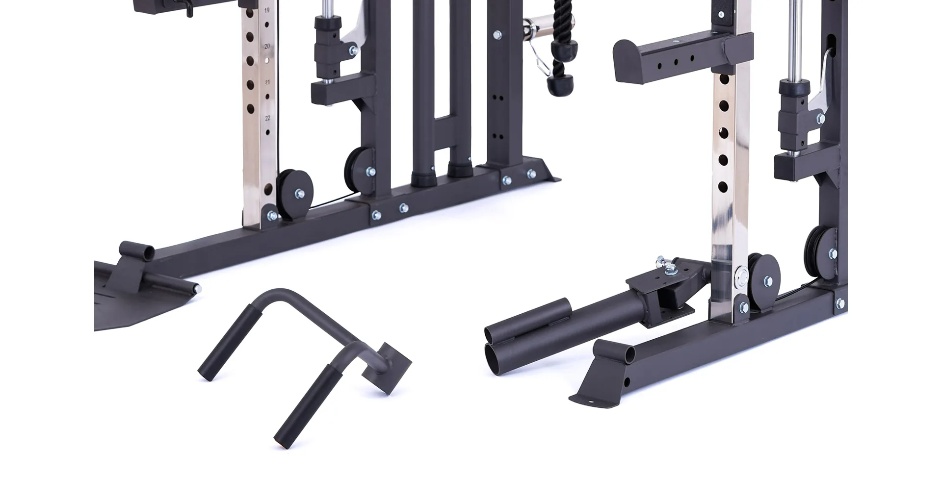 Součástí posilovací klece TRINFIT Multi Smith CX50 je velké množství adaptérů: jednoruční adaptéry, dlouhý rovný adaptér, dlouhý EZ adaptér, tricepsové lano, kotníkový adaptér, V-adaptér pro veslování, krátký rovný adaptér, háky na velkou osu, bezpečnostní dorazy a adaptéry na tricepsové kliky tzv. dipy.
