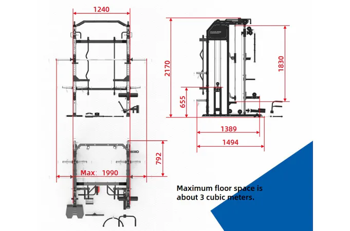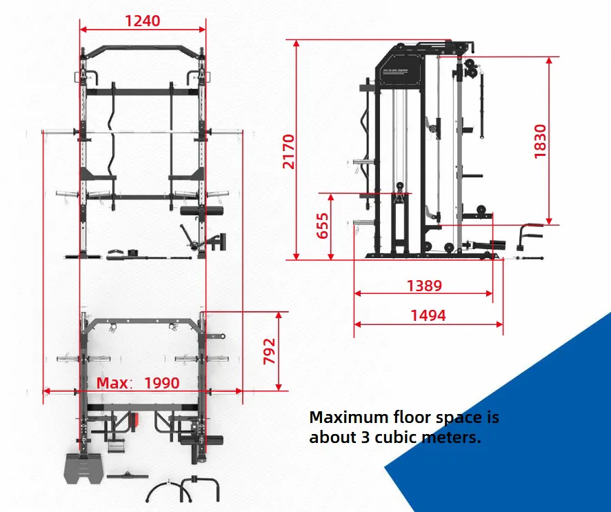 Multipress TRINFIT Multi Smith CX50 umožňuje procvičit celé tělo, pomocí mnoha různých cviků. To vše na ploše pouhých 3,5 m2. Z tohoto důvodu je věž ideální jak do domácího, tak i lehce komerčního prostředí jako jsou wellness centra, či malá hotelová fitcentra.