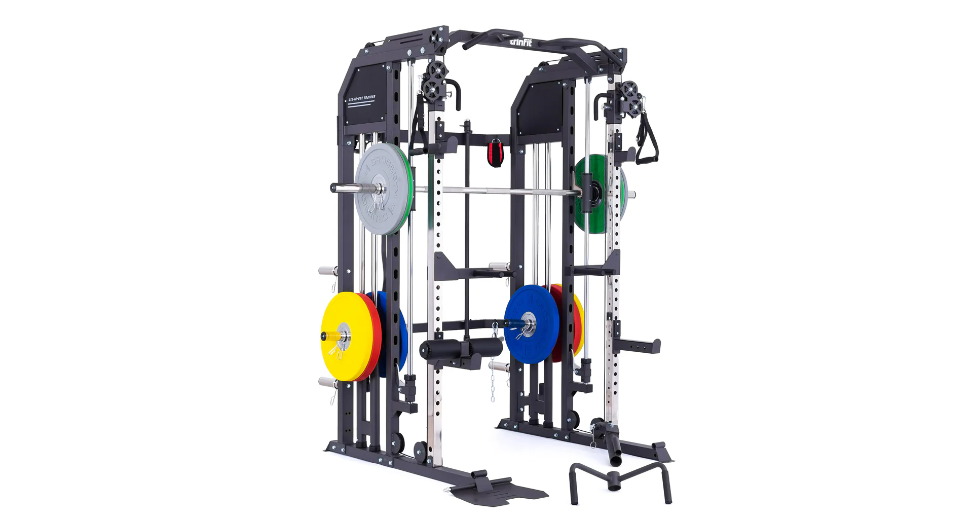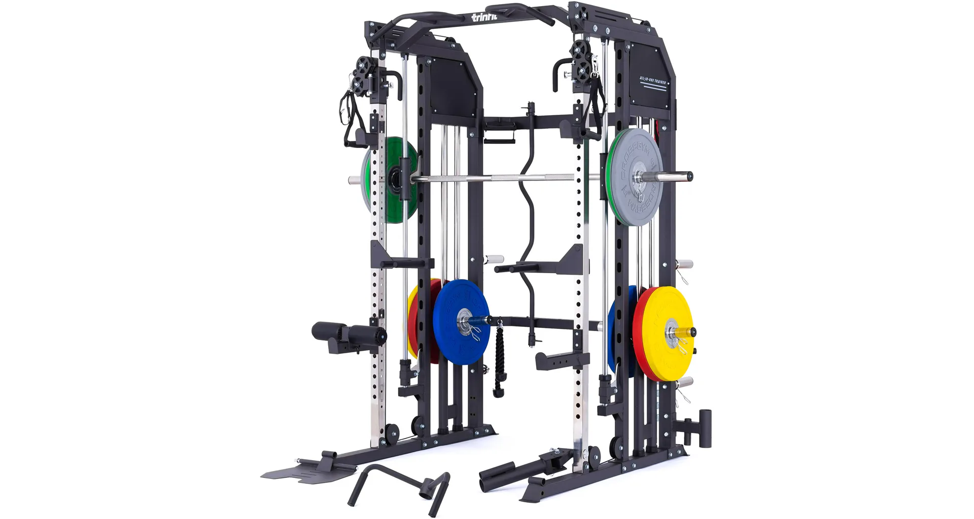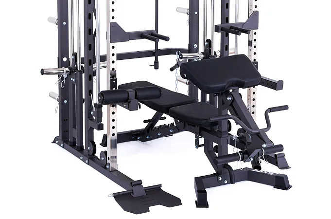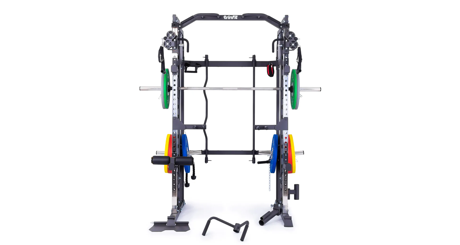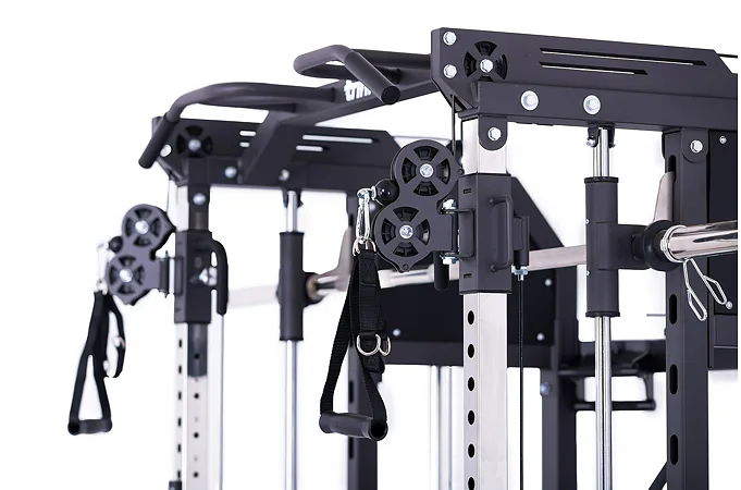 Multipress TRINFIT Multi Smith CX50 využívá jako závaží kotouče, je tedy pouze na vás, jakou zátěž si zvolíte. Je možné použít kotouče s průměrem 25 mm a díky redukcím také olympijské kotouče s průměrem 50 mm. Zároveň nabízí nepřeberné množství druhů cvičení formou tricepsových kliků, tlaků na prsa, ramena, kladek atd.. Dvě protisměrné kladky je možné polohovat v celé výšce děrovaných profilů a multipress ve 14 polohách, můžete tak perfektně procvičit celé tělo.
