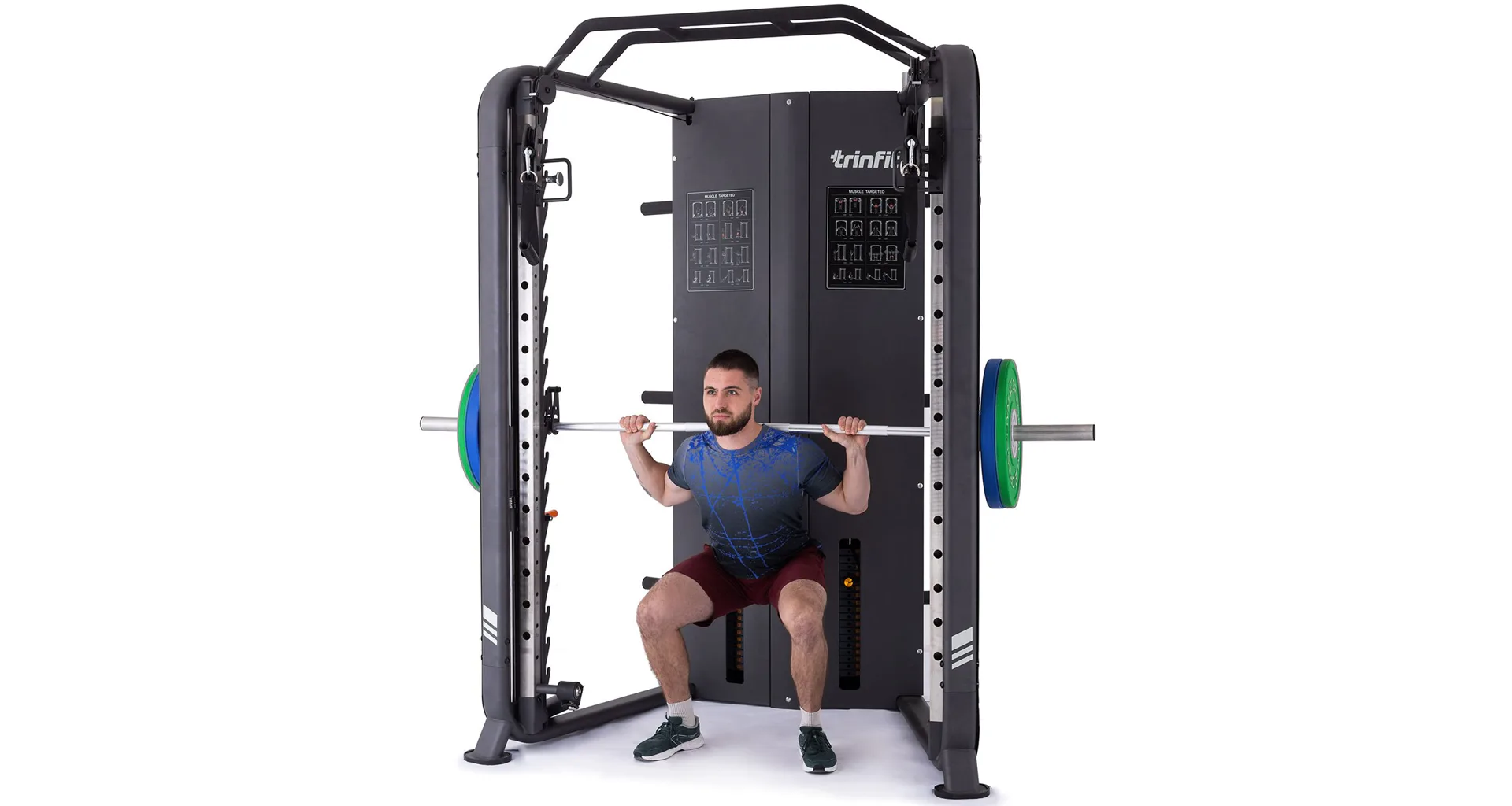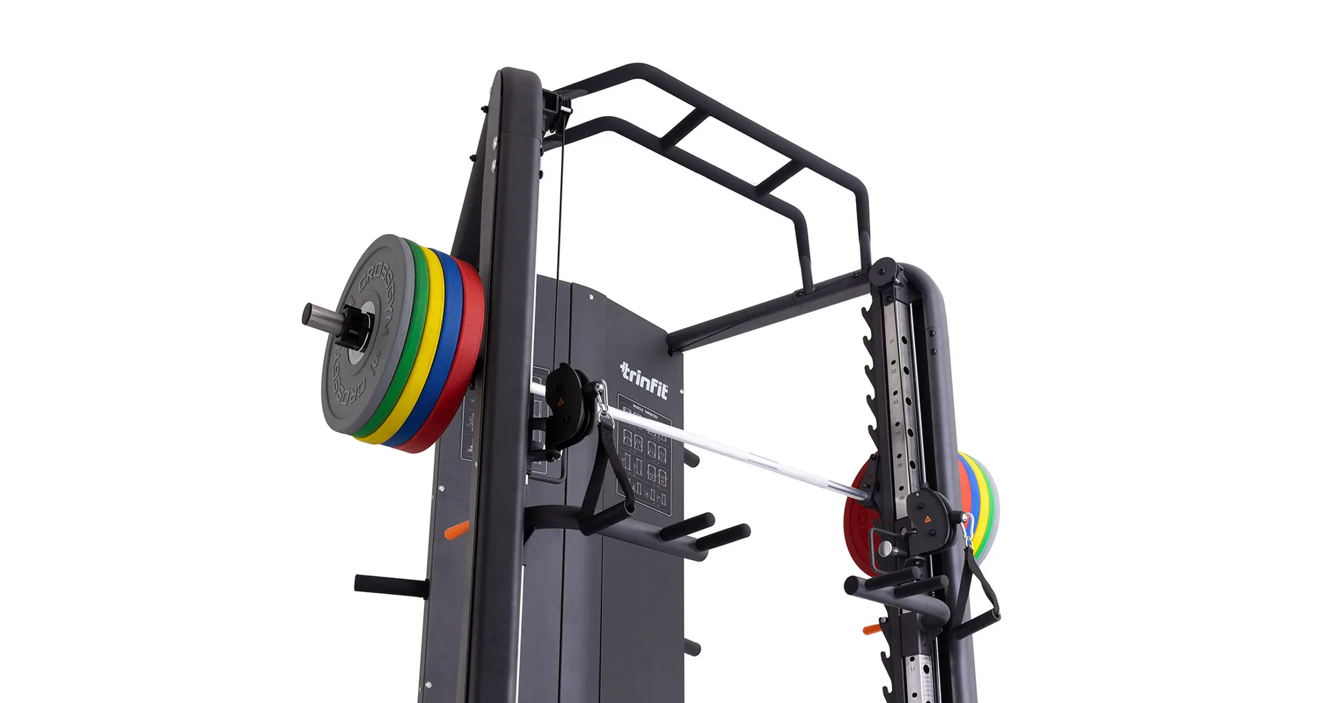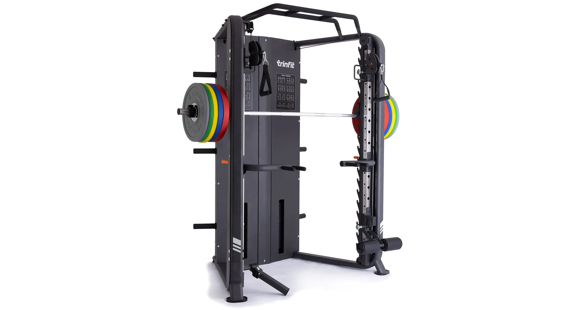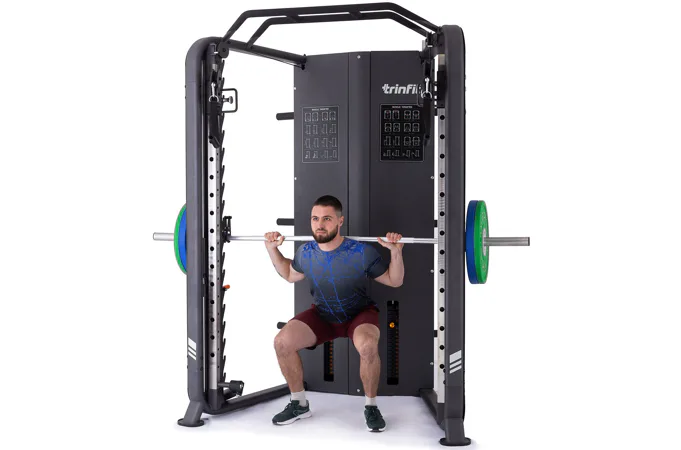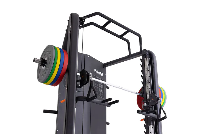 Multipress TRINFIT Multi Smith CX70 nabízí dva zásobníky zátěže o váze 90 kg (dohromady tedy až 180 kg závaží!). Zároveň nabízí nepřeberné množství druhů cvičení formou tricepsových kliků, tlaků na prsa, ramena, kladek atd.. Dvě protisměrné kladky je možné polohovat v 17 výškových polohách, můžete tak perfektně procvičit celé tělo.