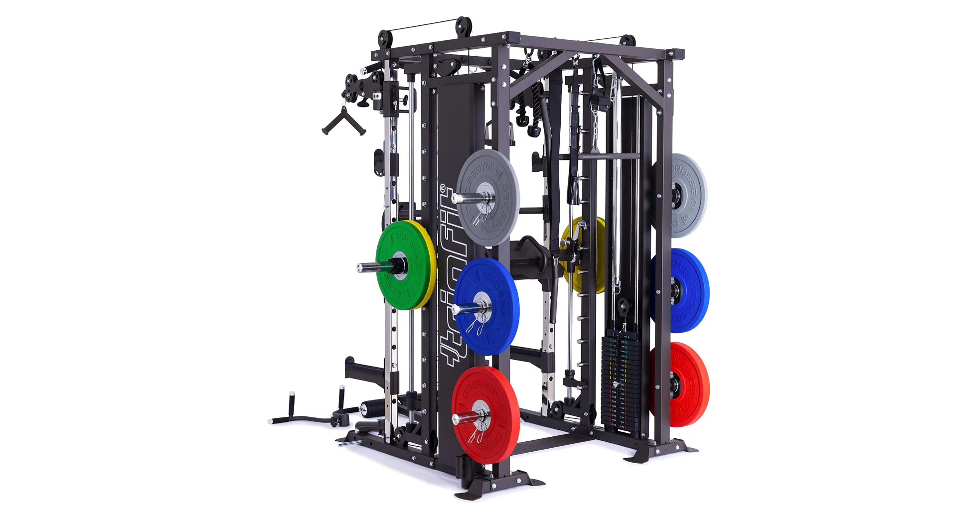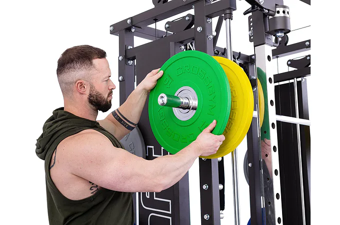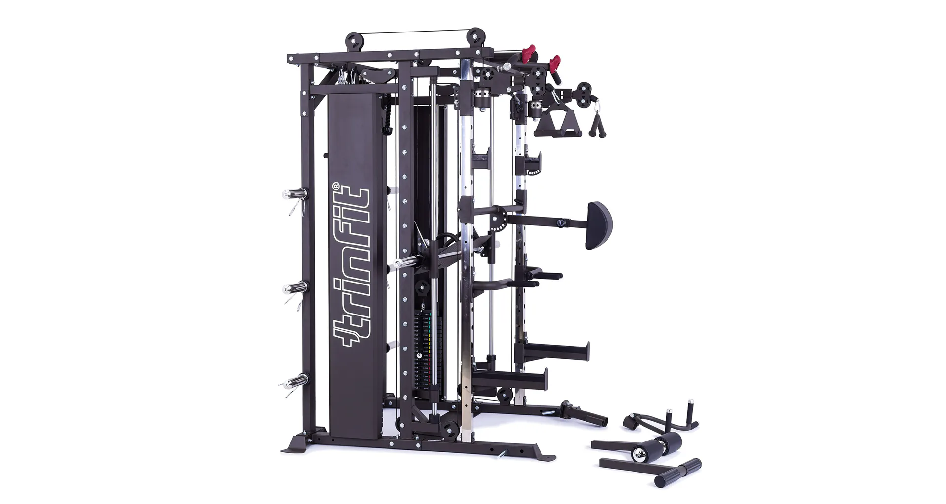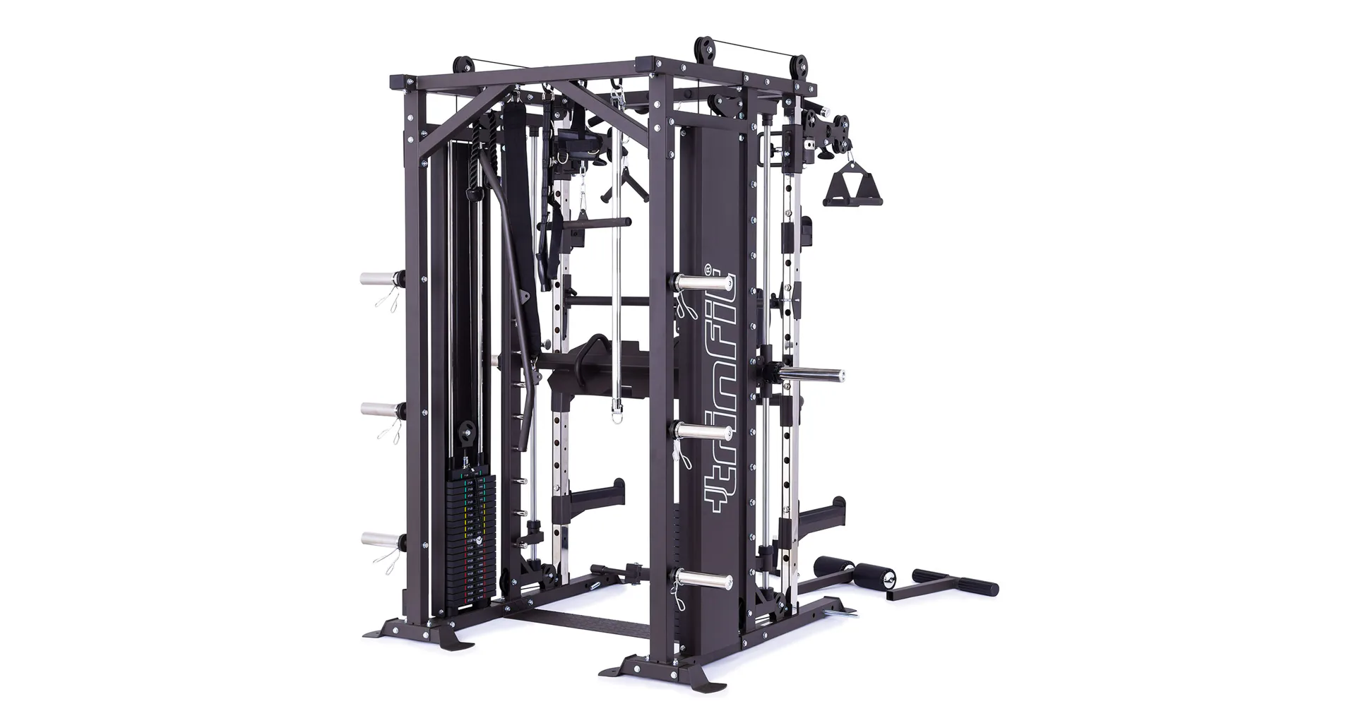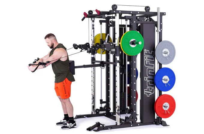 TRINFIT Multi Smith CX80 nabízí dva zásobníky zátěže o váze 90 kg (dohromady tedy až 180 kg závaží!). Zároveň nabízí nepřeberné množství druhů cvičení formou tricepsových kliků, tlaků na prsa, ramena, kladek atd... Dvě protisměrné kladky je možné polohovat v 18 výškových polohách, můžete tak perfektně procvičit celé tělo.