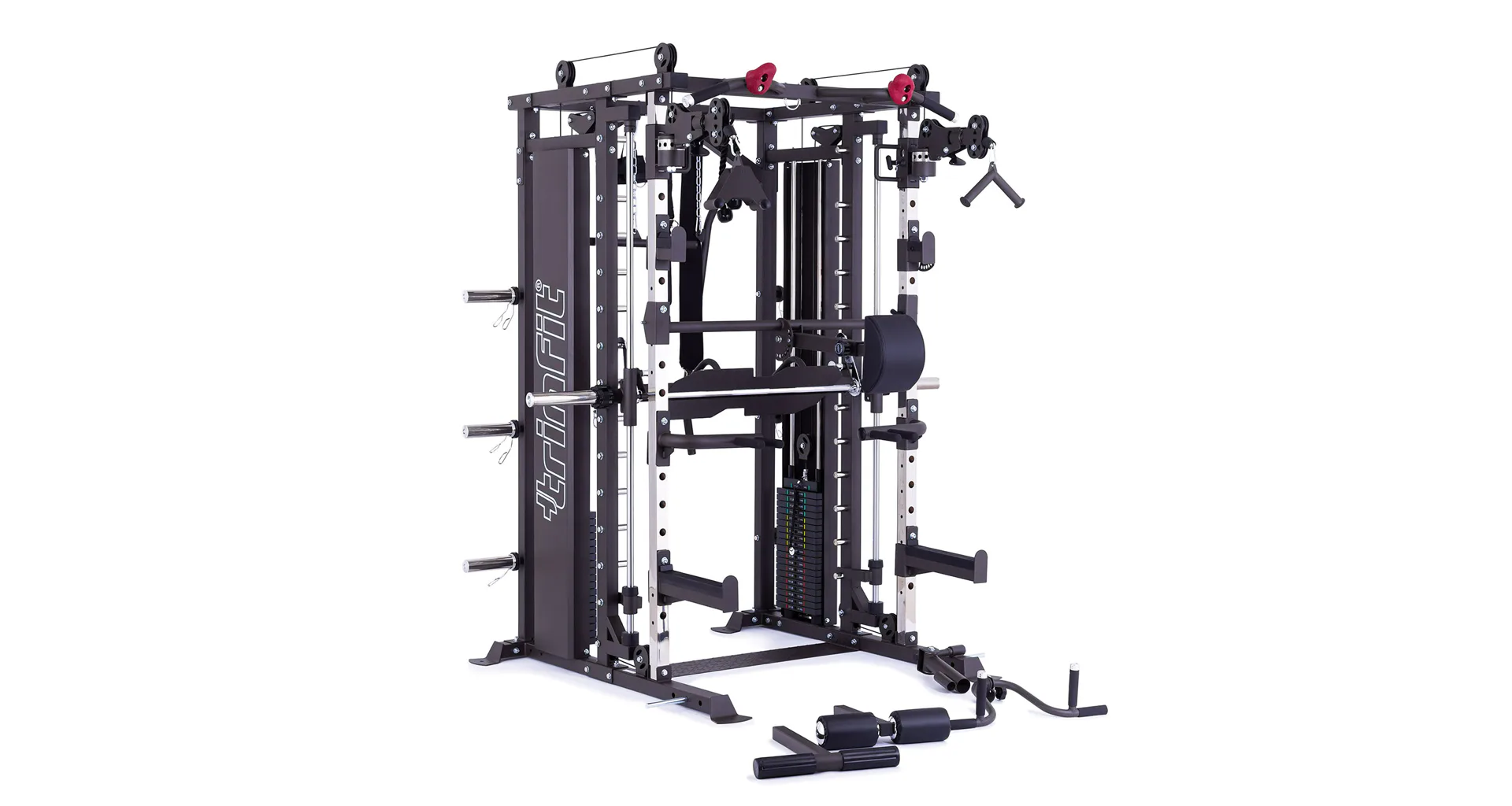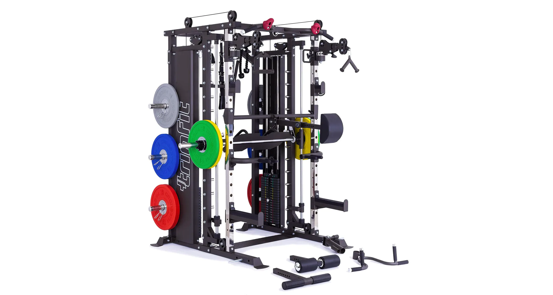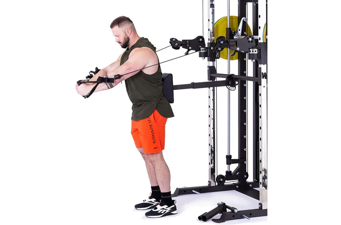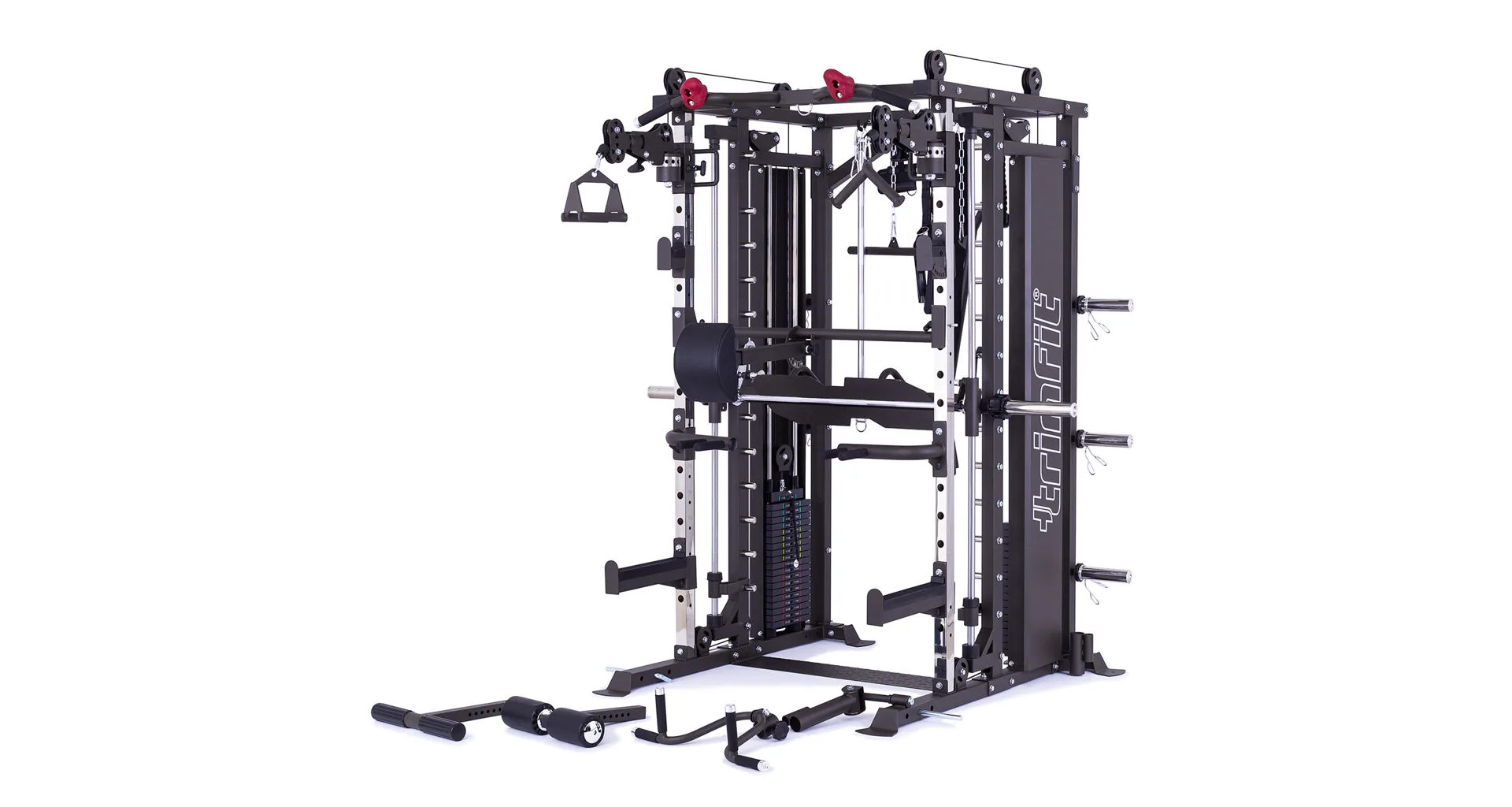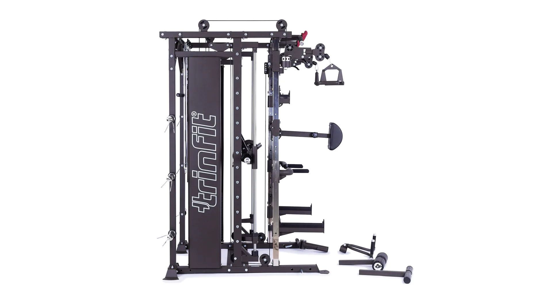 TRINFIT Multi Smith CX80 nabízí dva zásobníky zátěže o váze 90 kg (dohromady tedy až 180 kg závaží!). Zároveň nabízí nepřeberné množství druhů cvičení formou tricepsových kliků, tlaků na prsa, ramena, kladek atd... Dvě protisměrné kladky je možné polohovat v 18 výškových polohách, můžete tak perfektně procvičit celé tělo.