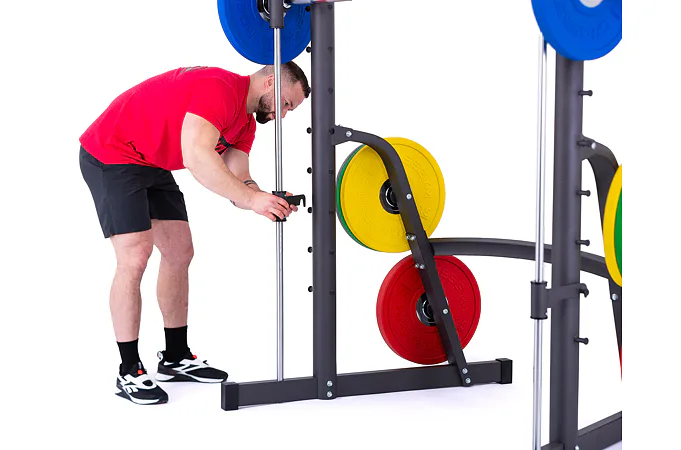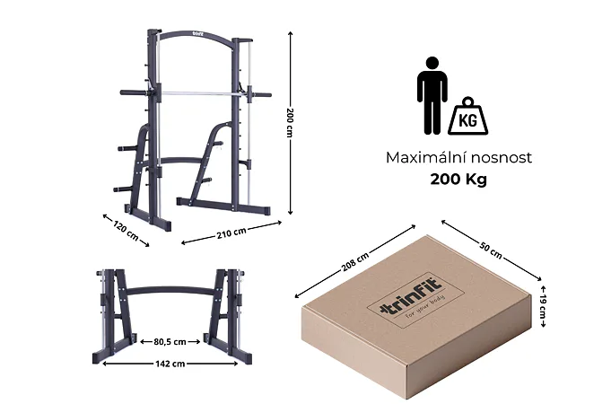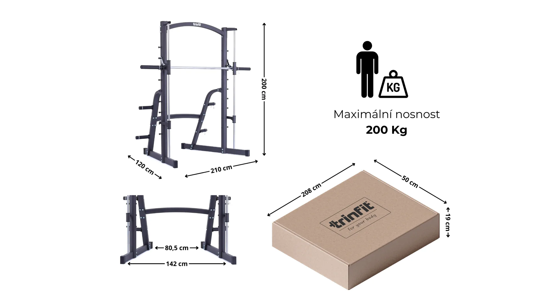 TRINFIT Power Smith CX20 má robustní konstrukci, kde máte možnost určit si výšku vedené osy pro daný cvik v 9 polohách podle vašich potřeb. K dispozici je chromovaná osa s nakládacími trny o průměru 25 mm nebo 50 mm (olympijské), díky standardně dodávanému adaptéru. Váhu si tedy můžete určit podle vlastních potřeb a cvičit mohou začátečníci i zkušení jedinci.