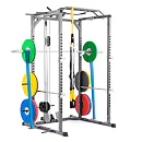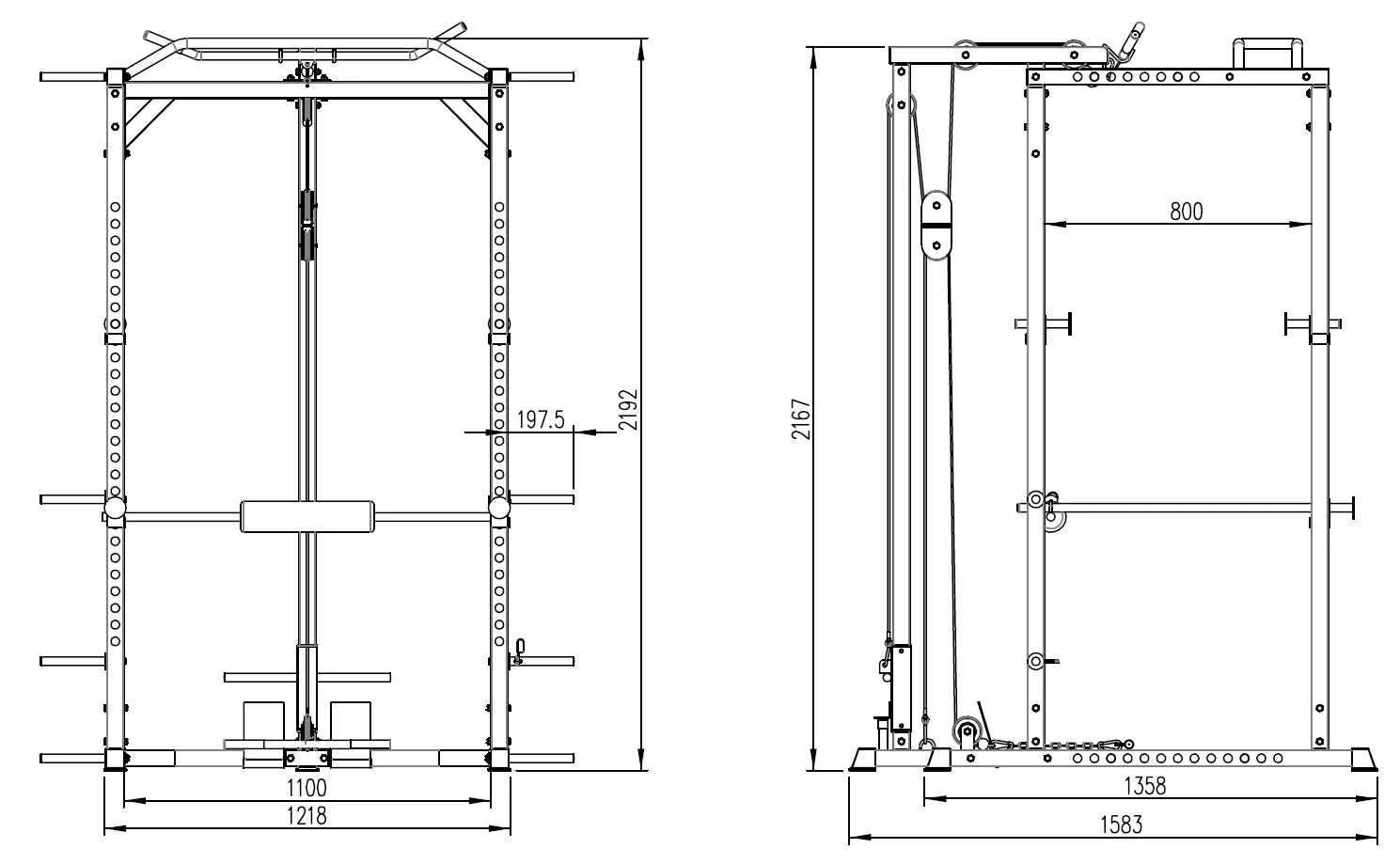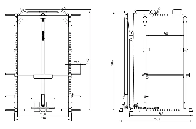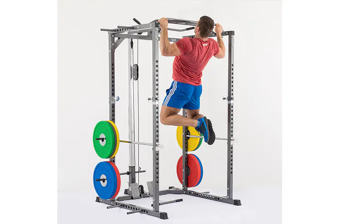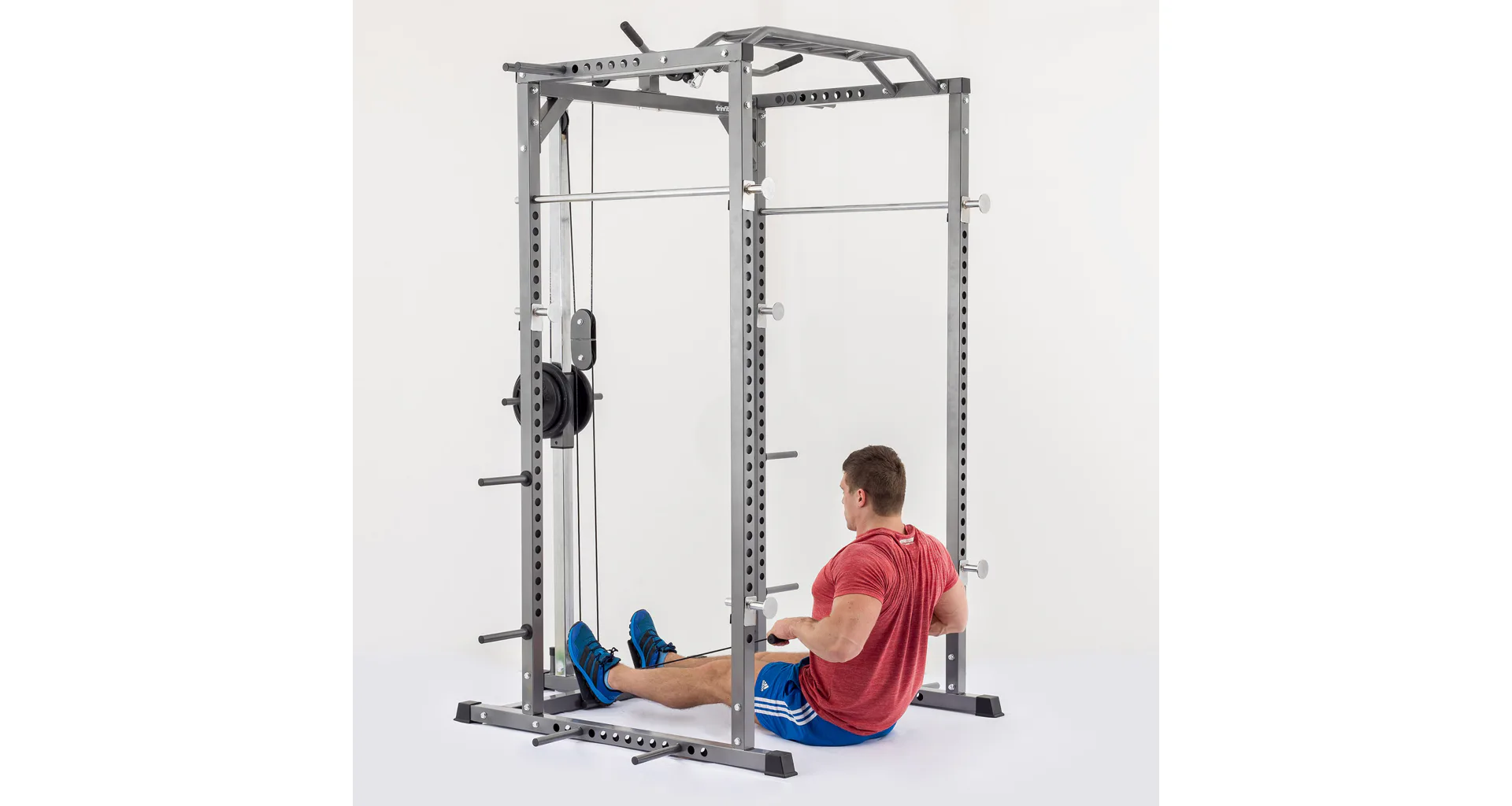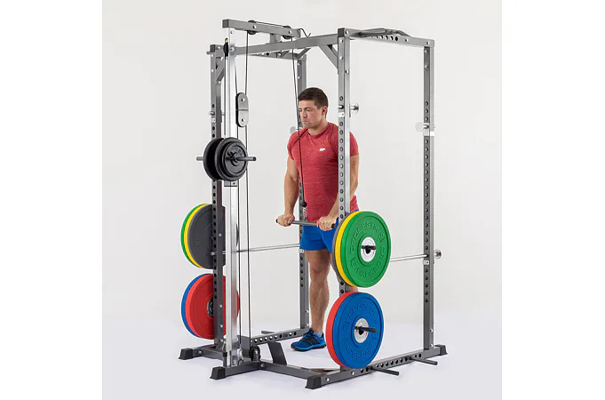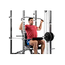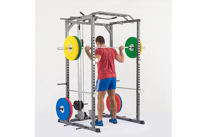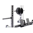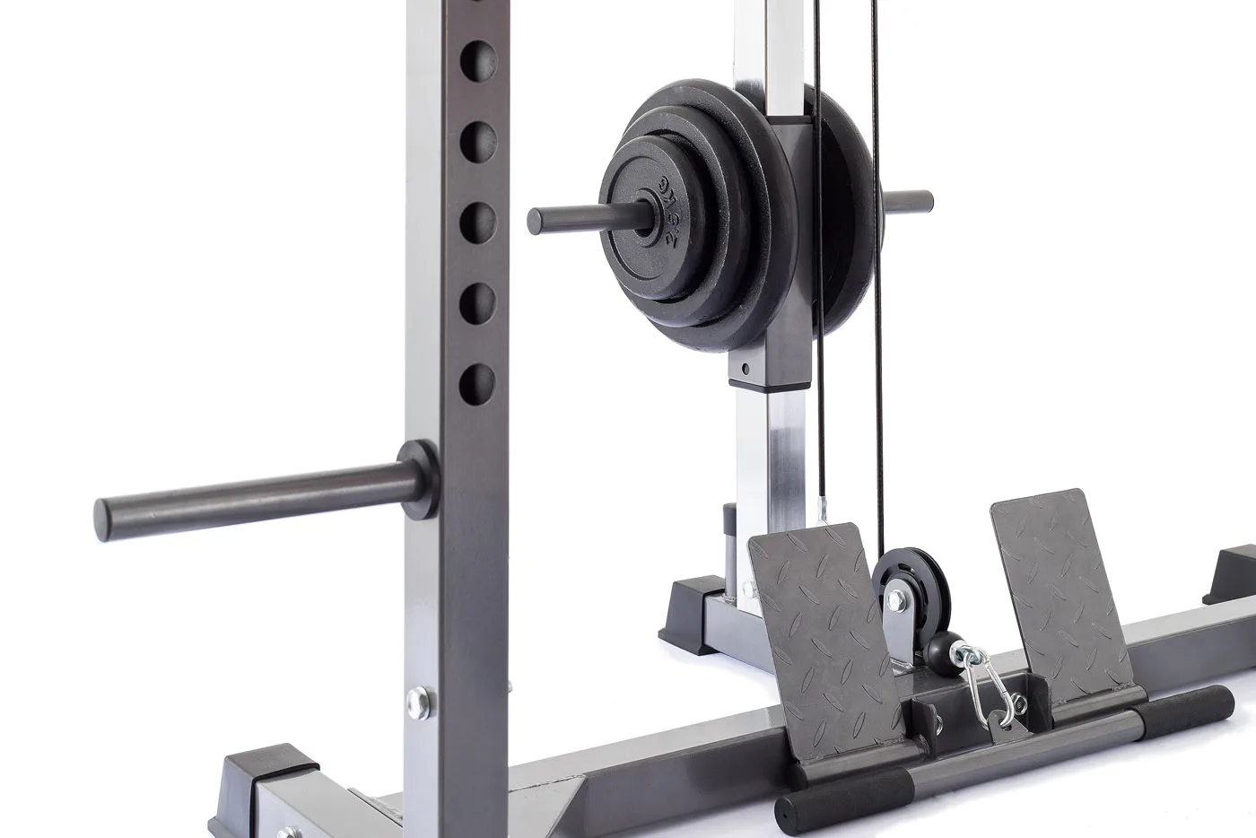 Štandardný rozstup aký poznáte od profesionálnych stojanov umožňuje pohodlné a komfortné cvičenie, optimálny úchop a bezpečné odkladanie činky aj vyšším osobám. Stojan má možnosť jednoduchého výškového nastavenia hákov na činku do 16 polôh a je teda použiteľný pre všetky cviky a všetky výšky postáv až do 215 cm. Okrem vlastných odkladacích hákov je stroj vybavený aj ďaľsími bezpečnostnými odkladacími dorazmi na činku pre prípad, že už nie ste schopný činku zdvihnúť, prípadne tieto dorazy je možné využiť aj ako odkladaciu plochu napr. pri cvičení bicepsu a ďaľších cvikov, nemusíte tak činku odkladať na zem. Súčasťou posilovacej klietky je aj kompletná horná a spodná kladka, vrátane konštrukcie na zaprenie nôh u dolnej a spodnej kladky zvyšujúci komfort pri cvičení a umožňujúci využitie maximálnych váh. Výhodou stojana sú štyri odkladacie tŕne na kotúče umiestnené na zadnej strane stojana na ktoré je možné kotúče pohodlne odložiť a ďaľších 8 špeciálnych polohovacích tŕňov pre použitie čím ďalej tým viac obľúbených odporových gúm rozširujúcich využitie veže.