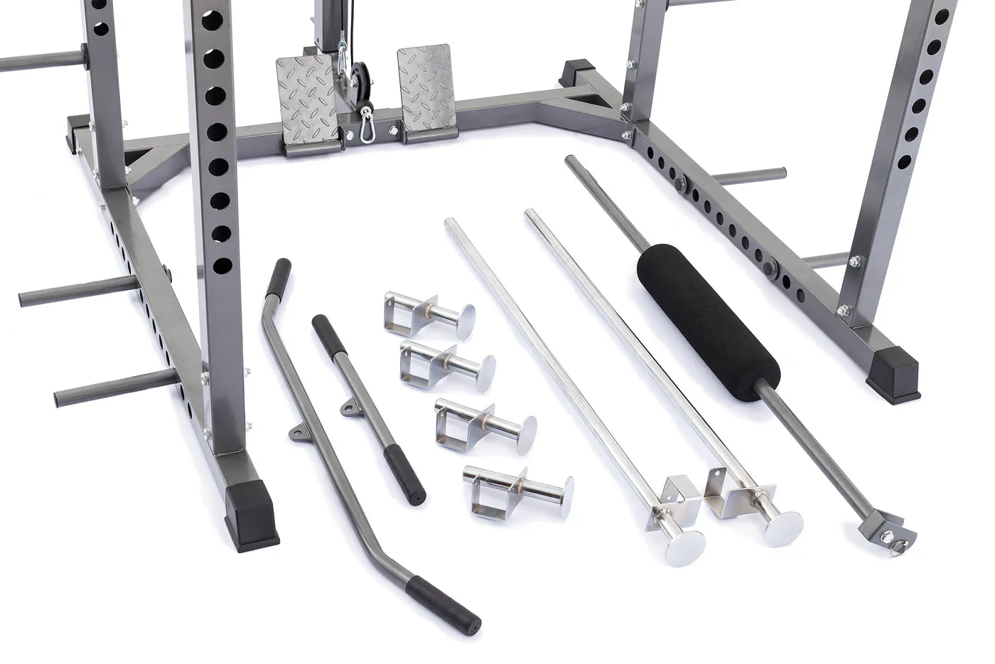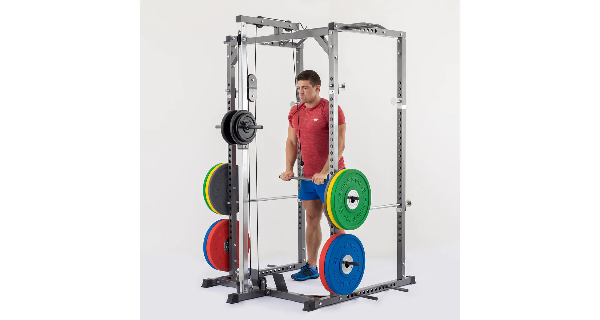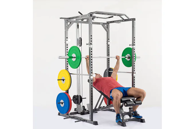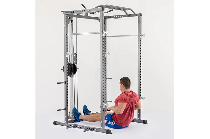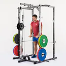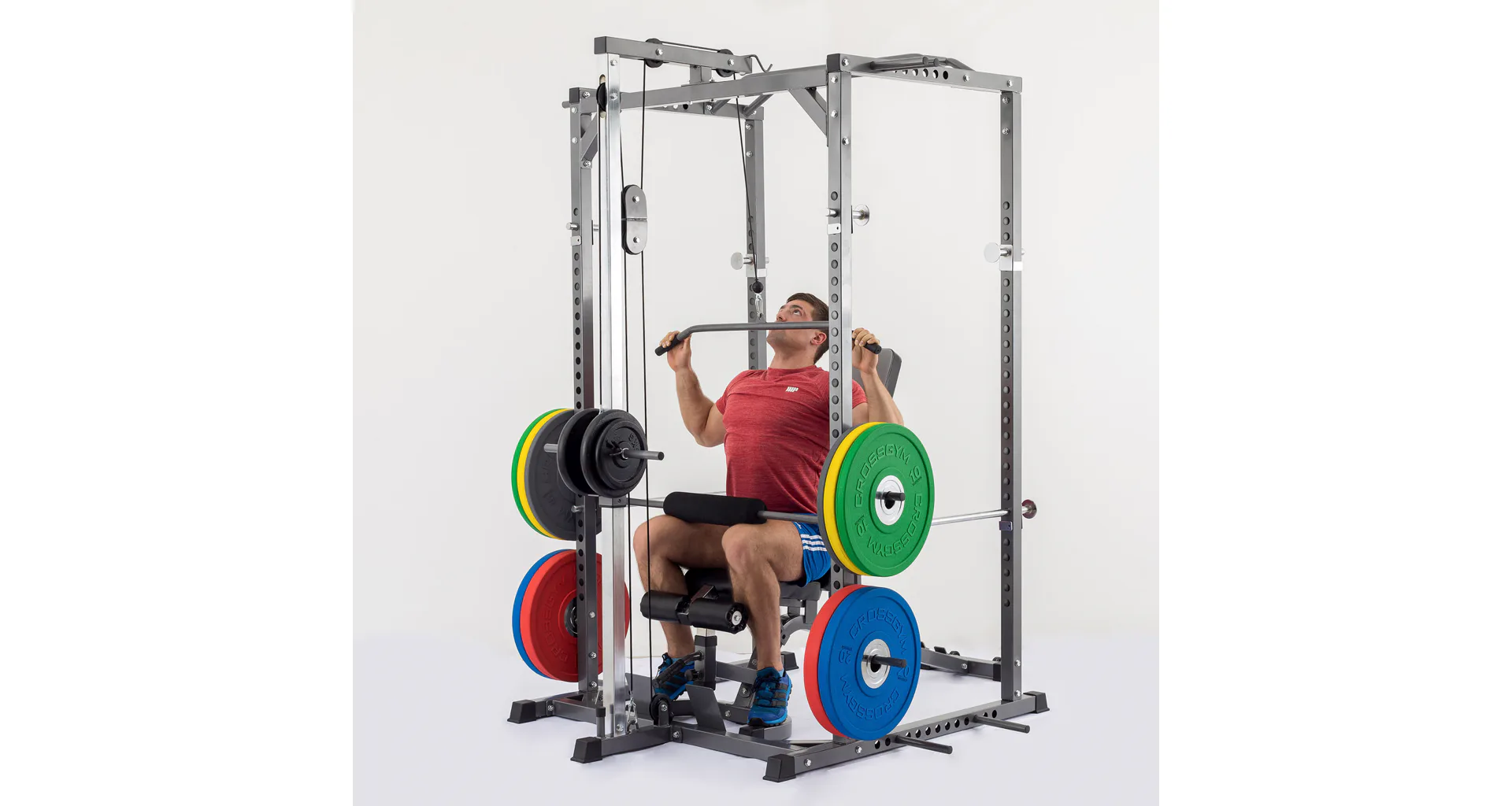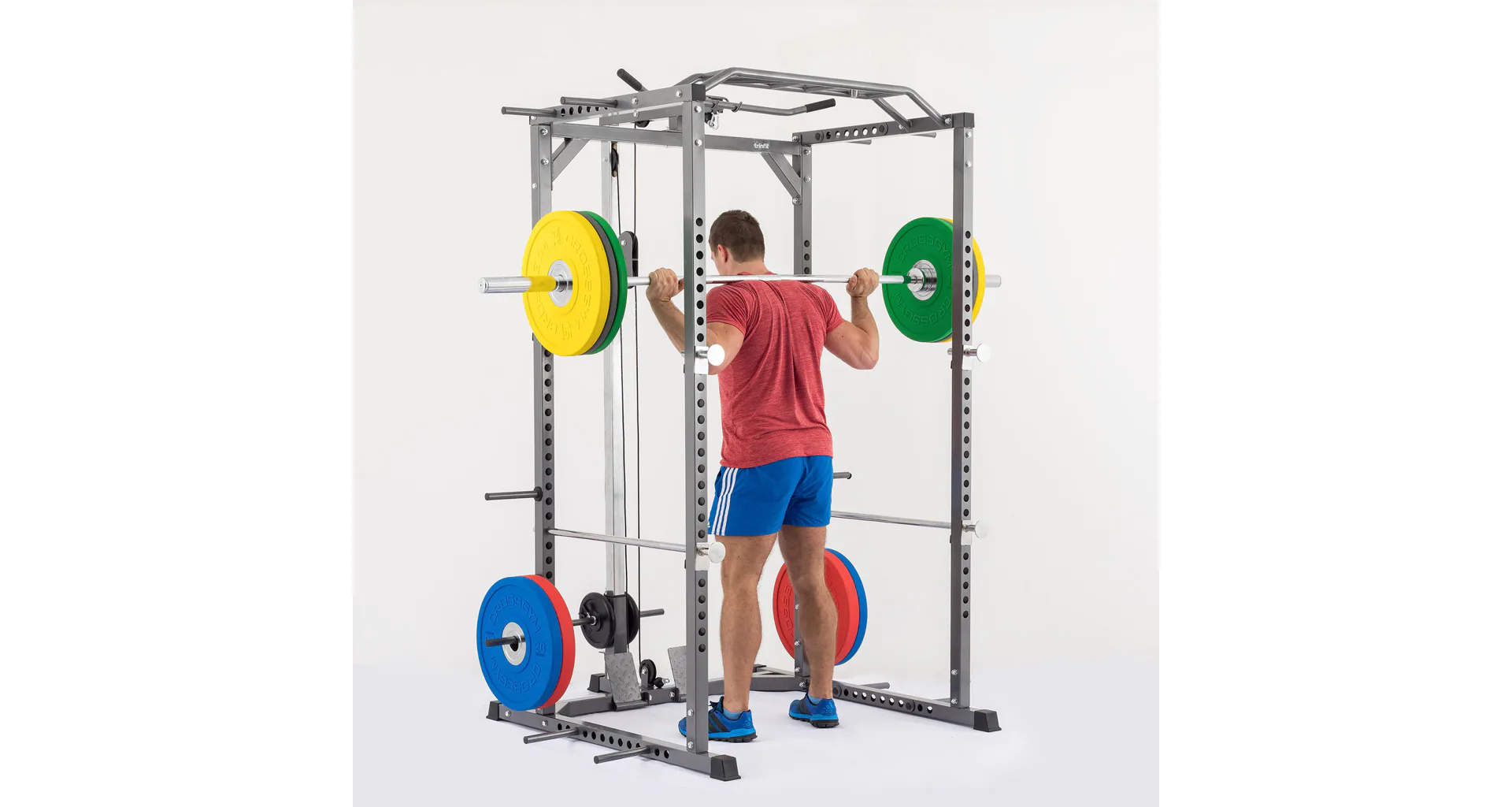 Štandardný rozstup aký poznáte od profesionálnych stojanov umožňuje pohodlné a komfortné cvičenie, optimálny úchop a bezpečné odkladanie činky aj vyšším osobám. Stojan má možnosť jednoduchého výškového nastavenia hákov na činku do 16 polôh a je teda použiteľný pre všetky cviky a všetky výšky postáv až do 215 cm. Okrem vlastných odkladacích hákov je stroj vybavený aj ďaľsími bezpečnostnými odkladacími dorazmi na činku pre prípad, že už nie ste schopný činku zdvihnúť, prípadne tieto dorazy je možné využiť aj ako odkladaciu plochu napr. pri cvičení bicepsu a ďaľších cvikov, nemusíte tak činku odkladať na zem. Súčasťou posilovacej klietky je aj kompletná horná a spodná kladka, vrátane konštrukcie na zaprenie nôh u dolnej a spodnej kladky zvyšujúci komfort pri cvičení a umožňujúci využitie maximálnych váh. Výhodou stojana sú štyri odkladacie tŕne na kotúče umiestnené na zadnej strane stojana na ktoré je možné kotúče pohodlne odložiť a ďaľších 8 špeciálnych polohovacích tŕňov pre použitie čím ďalej tým viac obľúbených odporových gúm rozširujúcich využitie veže.