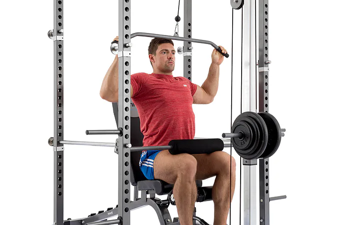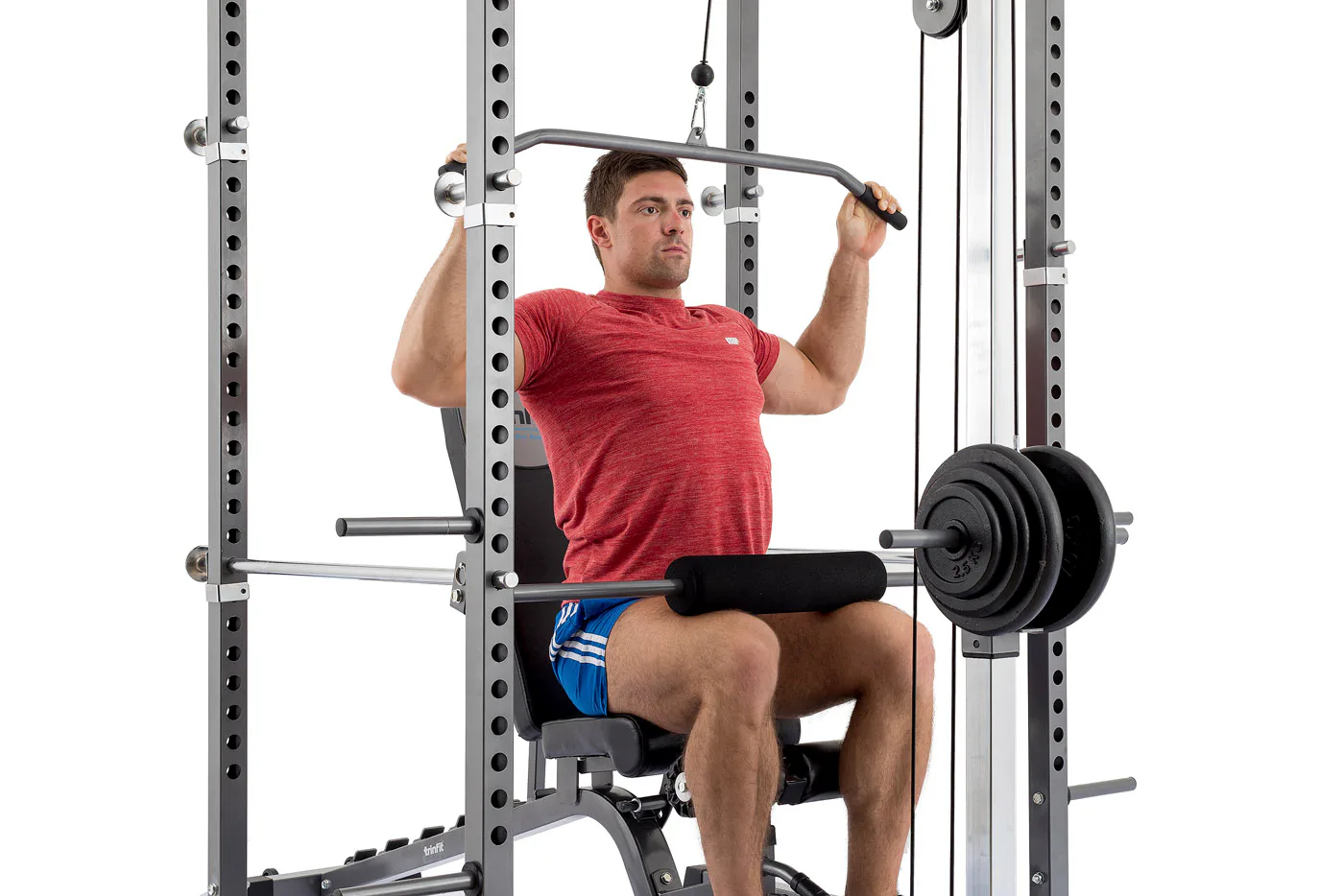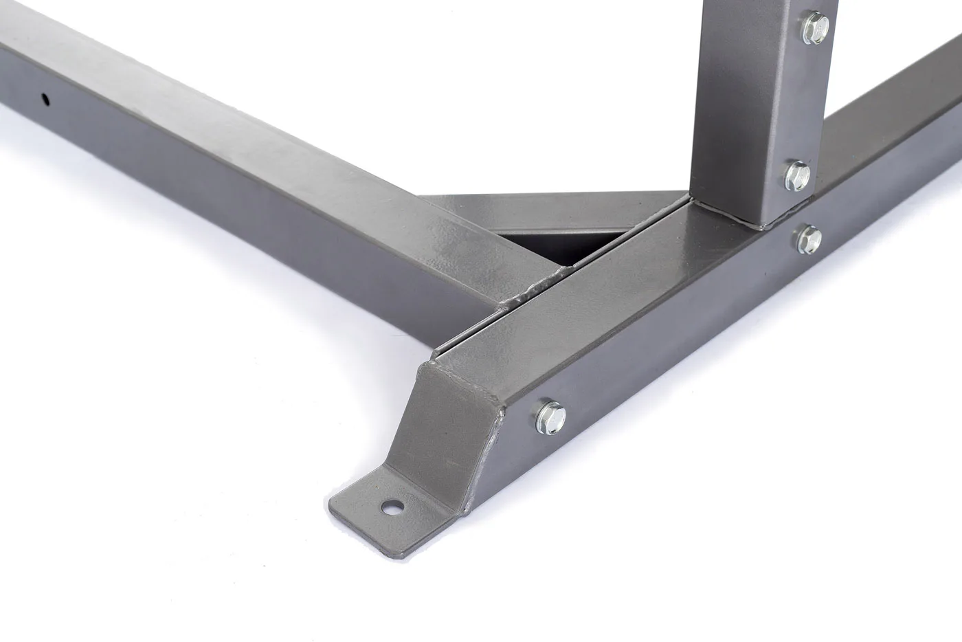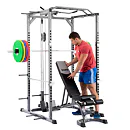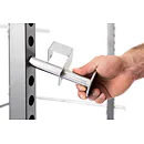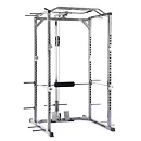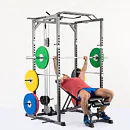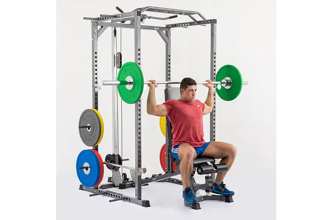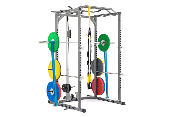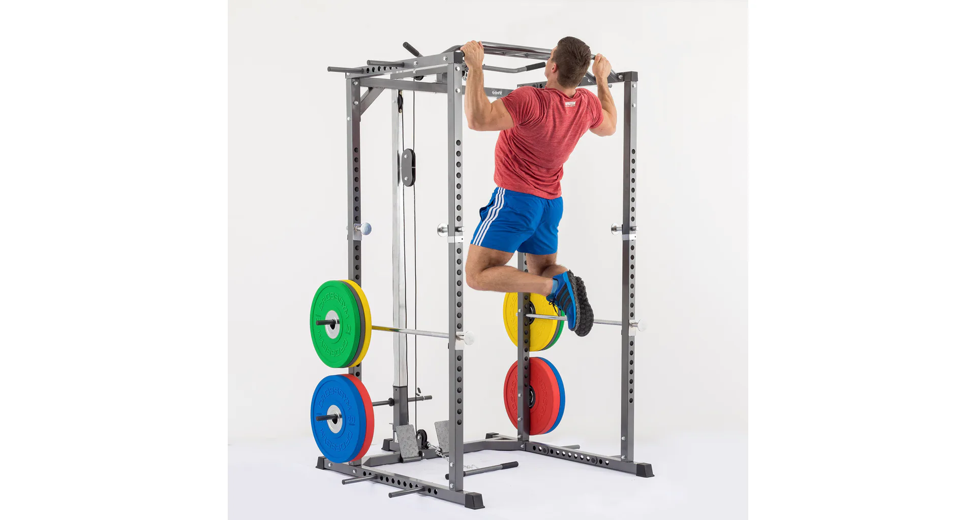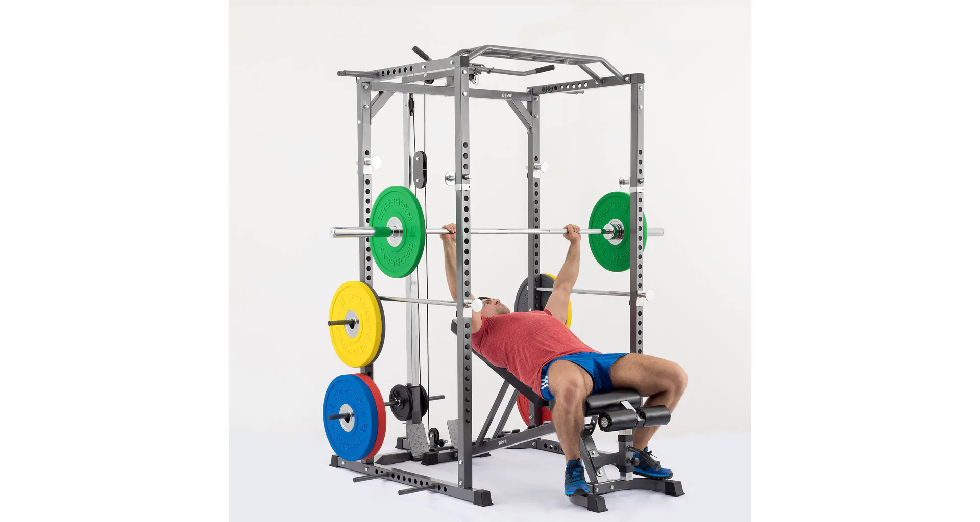 Štandardný rozstup aký poznáte od profesionálnych stojanov umožňuje pohodlné a komfortné cvičenie, optimálny úchop a bezpečné odkladanie činky aj vyšším osobám. Stojan má možnosť jednoduchého výškového nastavenia hákov na činku do 16 polôh a je teda použiteľný pre všetky cviky a všetky výšky postáv až do 215 cm. Okrem vlastných odkladacích hákov je stroj vybavený aj ďaľsími bezpečnostnými odkladacími dorazmi na činku pre prípad, že už nie ste schopný činku zdvihnúť, prípadne tieto dorazy je možné využiť aj ako odkladaciu plochu napr. pri cvičení bicepsu a ďaľších cvikov, nemusíte tak činku odkladať na zem. Súčasťou posilovacej klietky je aj kompletná horná a spodná kladka, vrátane konštrukcie na zaprenie nôh u dolnej a spodnej kladky zvyšujúci komfort pri cvičení a umožňujúci využitie maximálnych váh. Výhodou stojana sú štyri odkladacie tŕne na kotúče umiestnené na zadnej strane stojana na ktoré je možné kotúče pohodlne odložiť a ďaľších 8 špeciálnych polohovacích tŕňov pre použitie čím ďalej tým viac obľúbených odporových gúm rozširujúcich využitie veže.