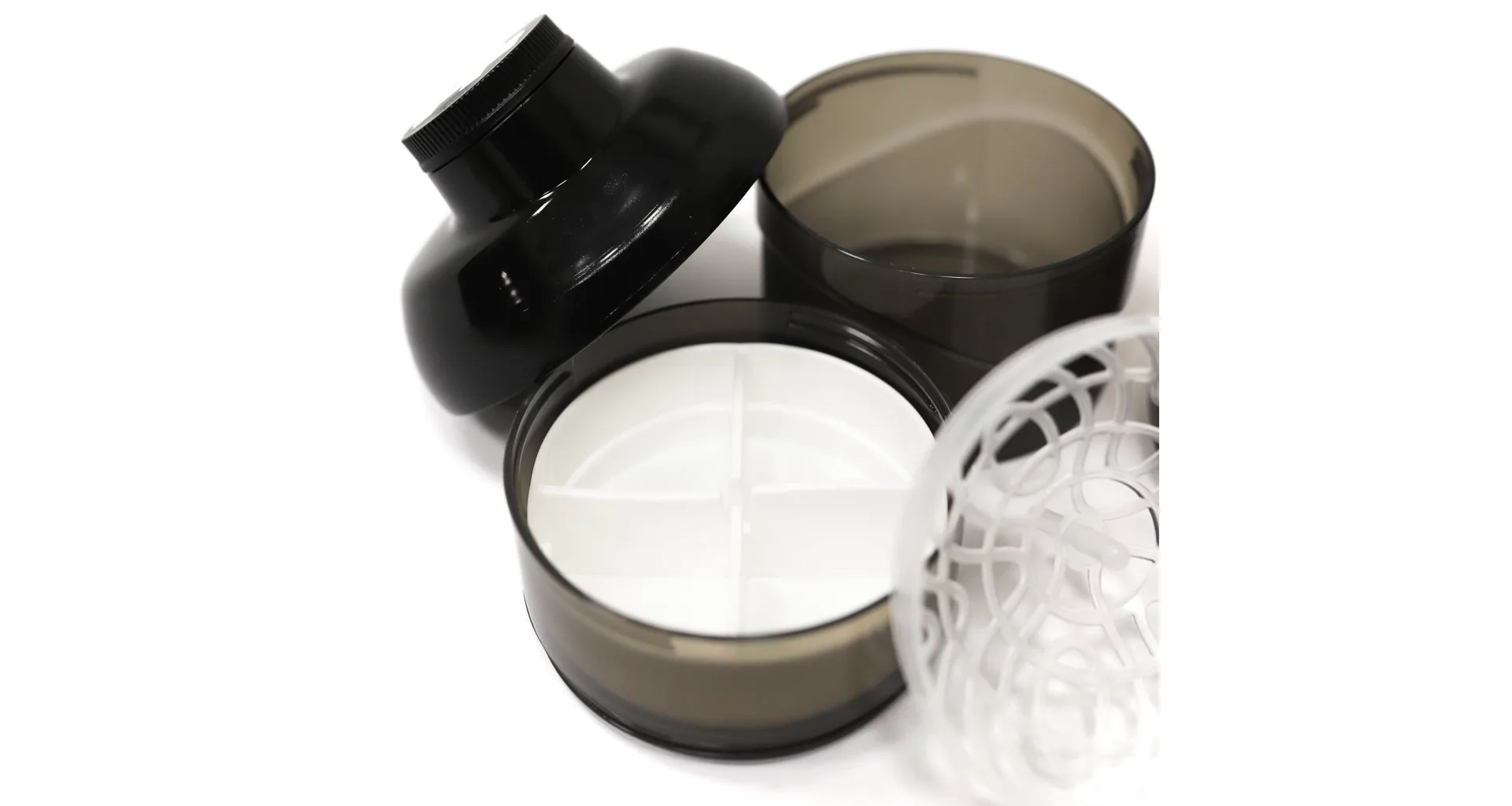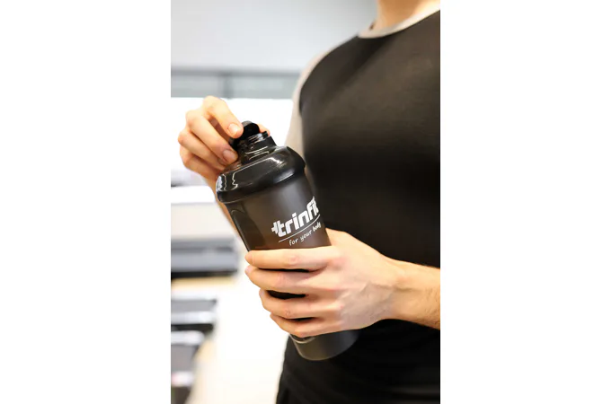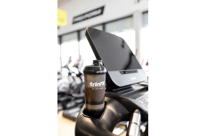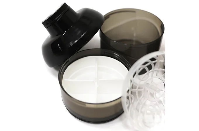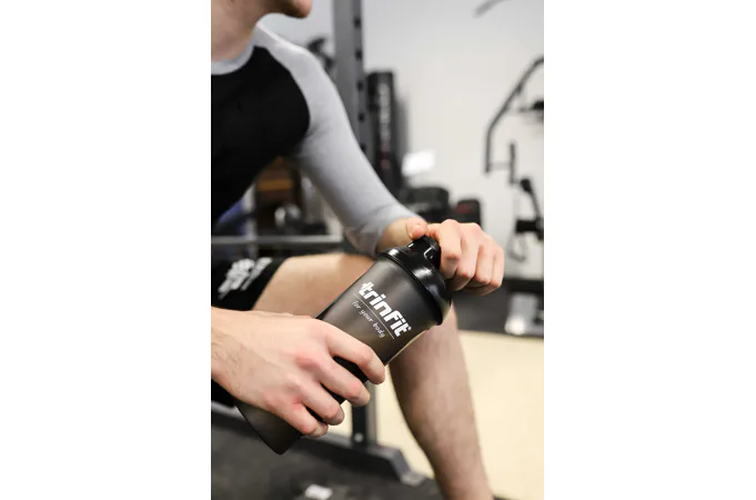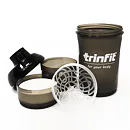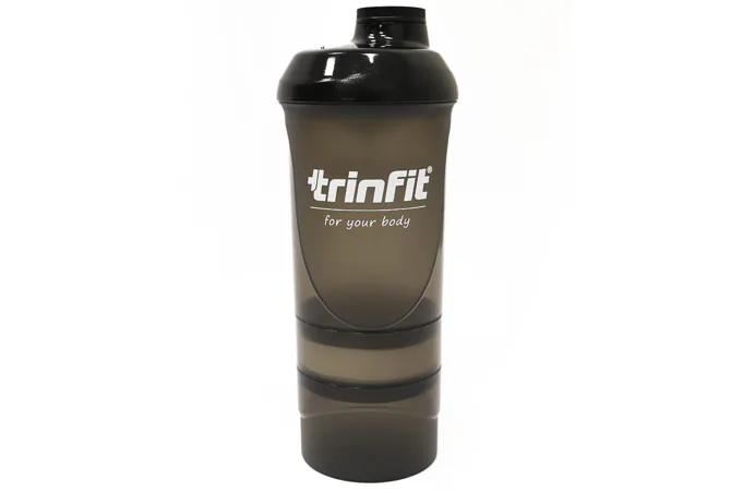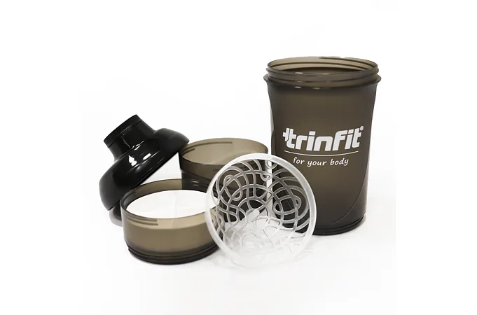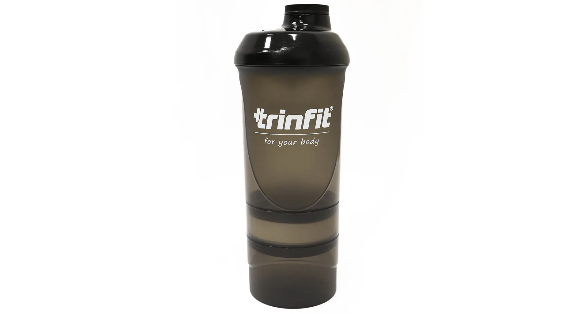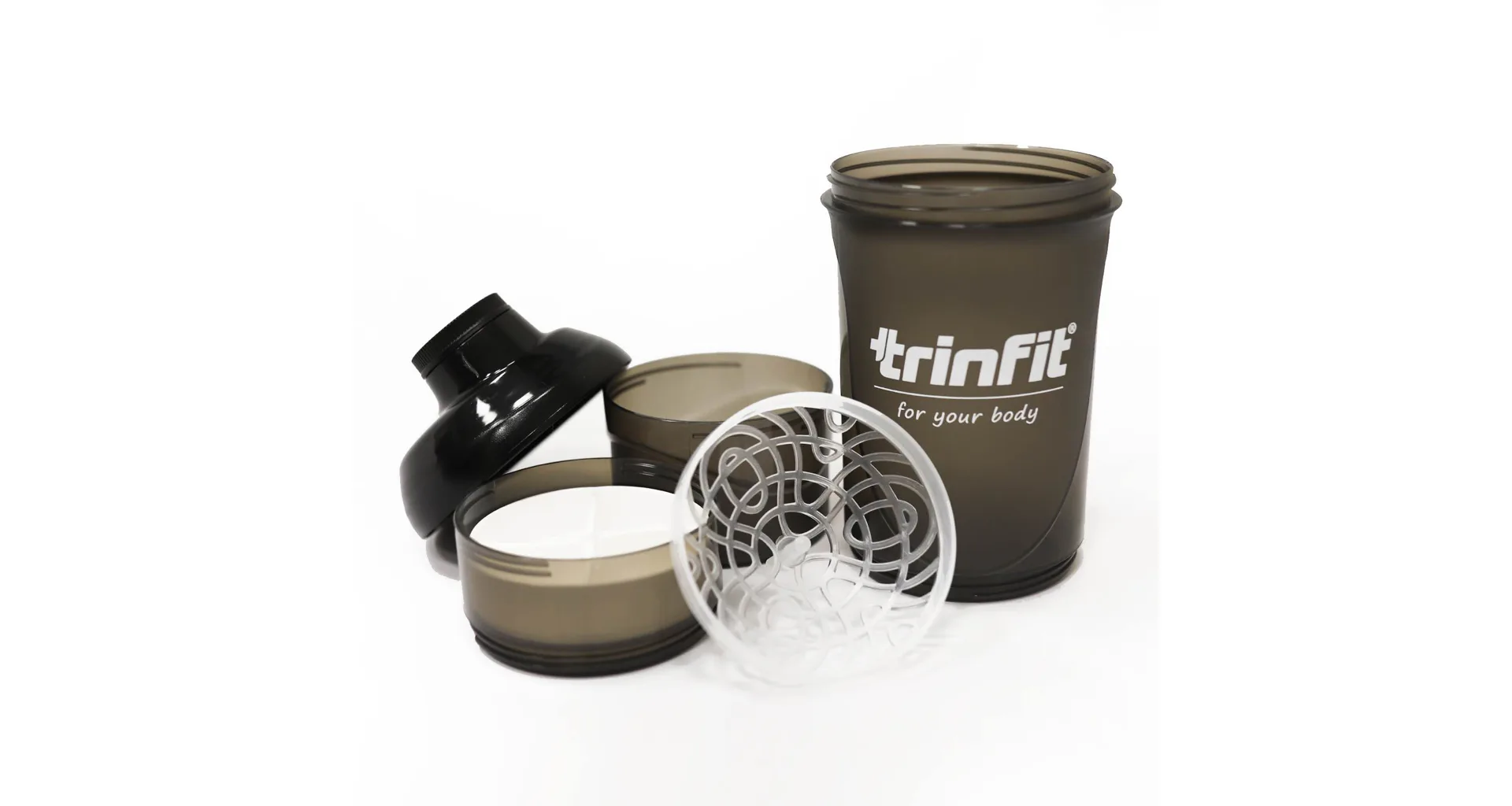TRINFIT Shaker Black Smoke je praktický dvojdielny šejker na prípravu koktailov so skrutkovacím uzáverom. Objem shakera je 600 ml (s mierkou do 500 ml), s poschodím na tablety a kapsule (150 ml) a zásobníkom na práškové doplnky výživy (200 ml). Spodná časť slúži na prášok, tablety a kapsule, vrchná na prípravu nápoja. Mriežka zaistí kvalitné premiešanie kokteilu.