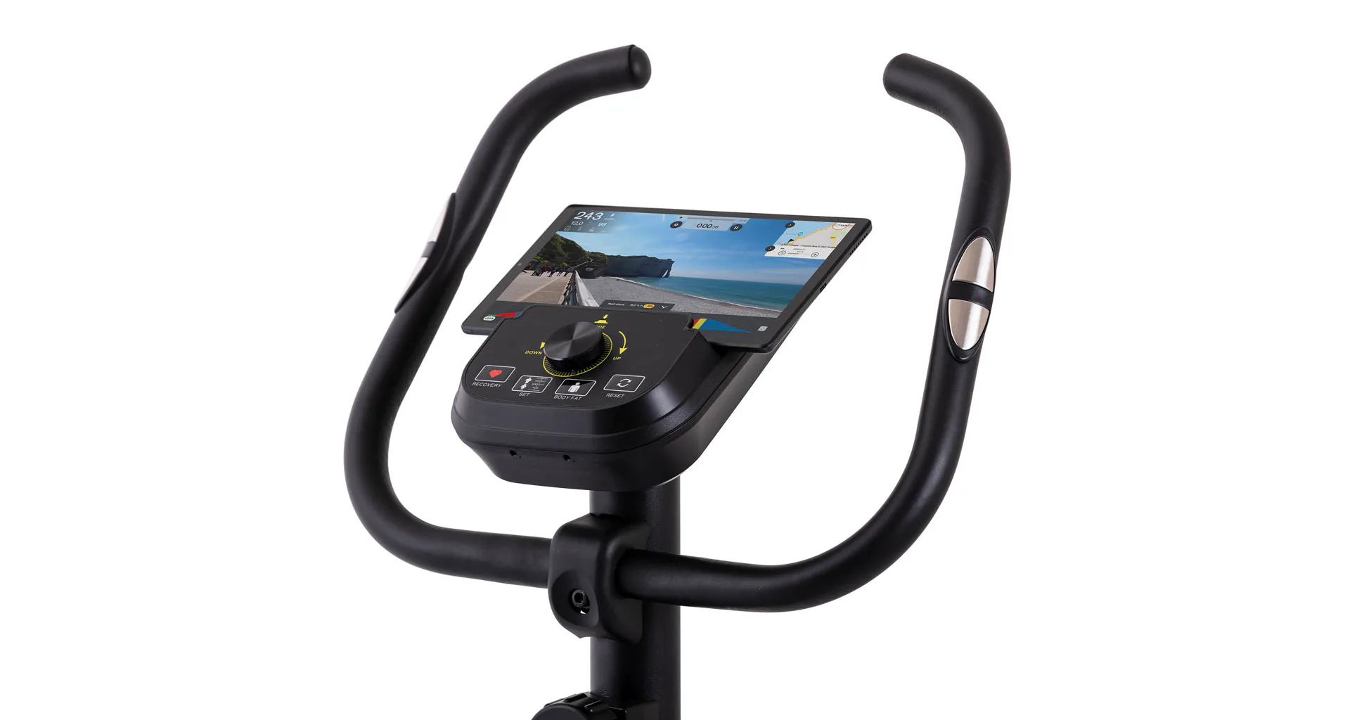 Díky praktickému držáku na tablet, či smartphone si můžete při trénování pouštět svou oblíbenou hudbu, či YouTube kanál