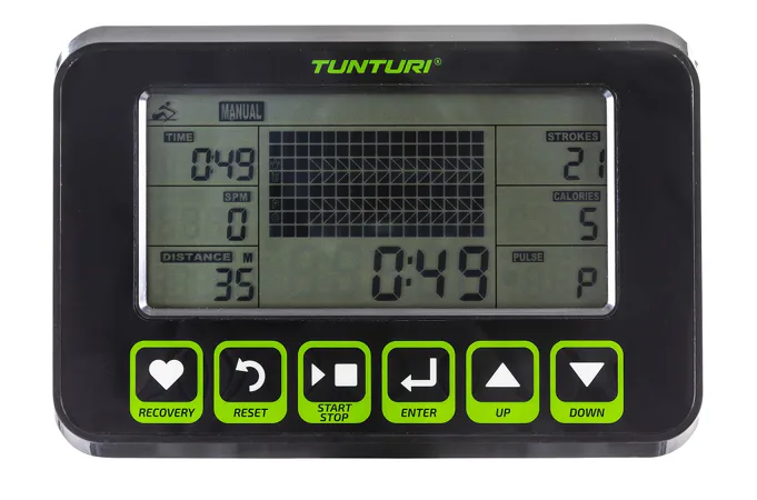 Veslovací trenažér je vybaven přehledným počítačem a transportními kolečky pro snadnou manipulaci.